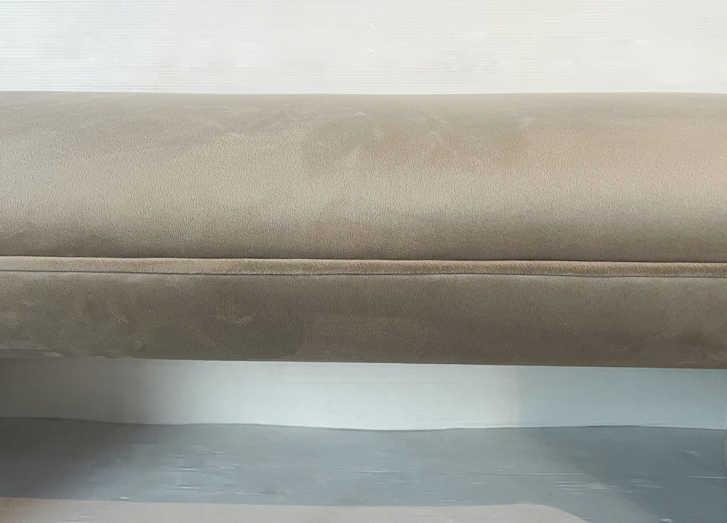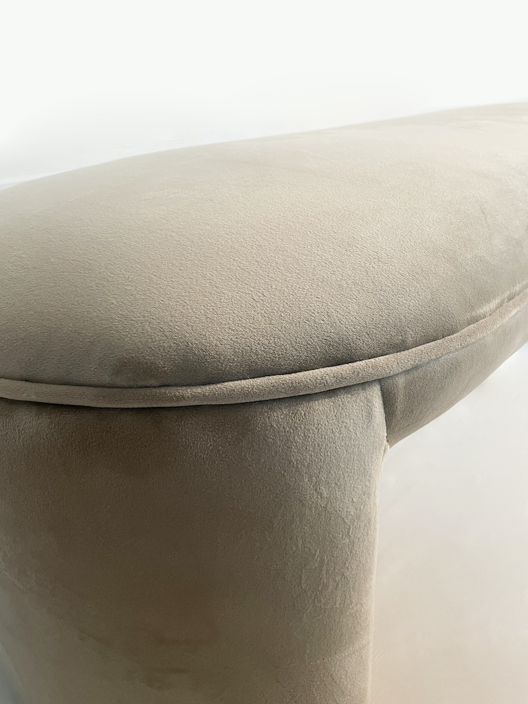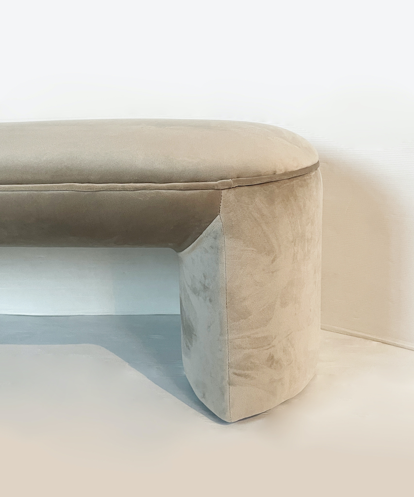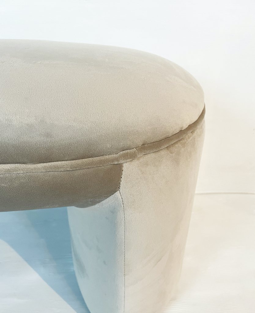 Particolare piccola panca - pouf realizzata in velluto color grigio-sabbia.
