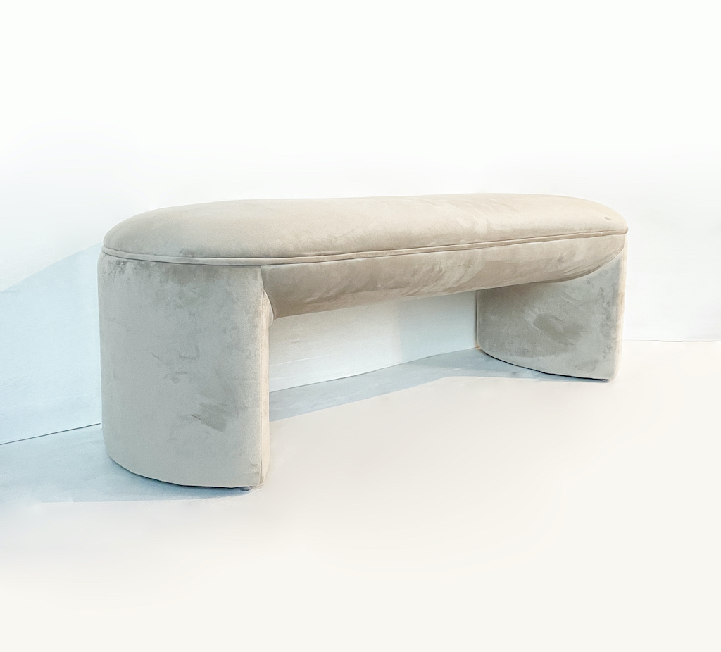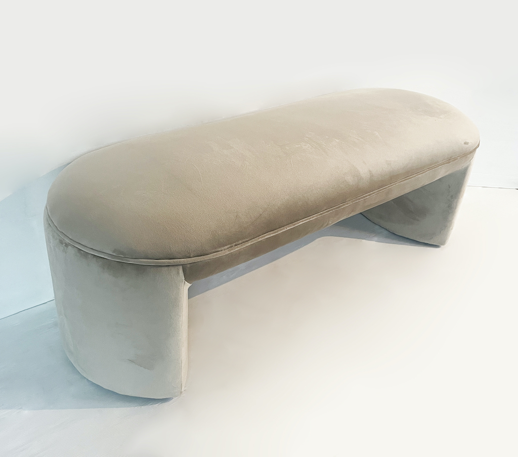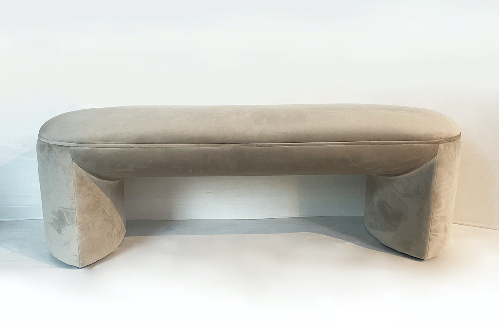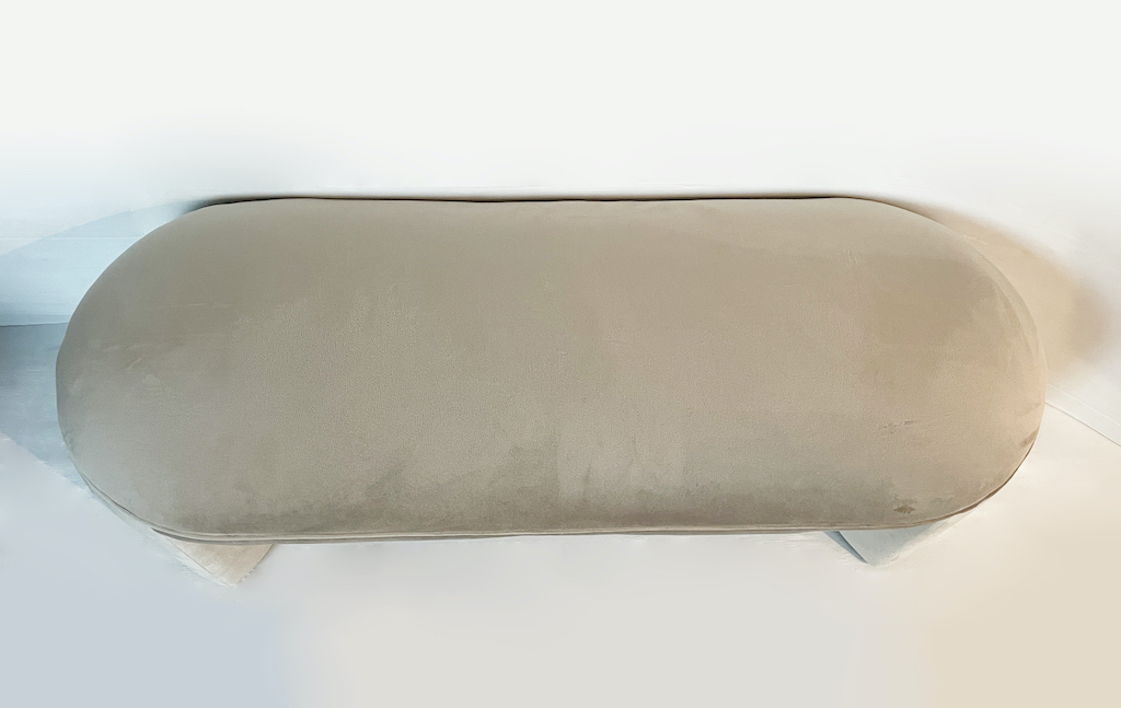 Particolare piccola panca - pouf realizzata in velluto color grigio-sabbia.