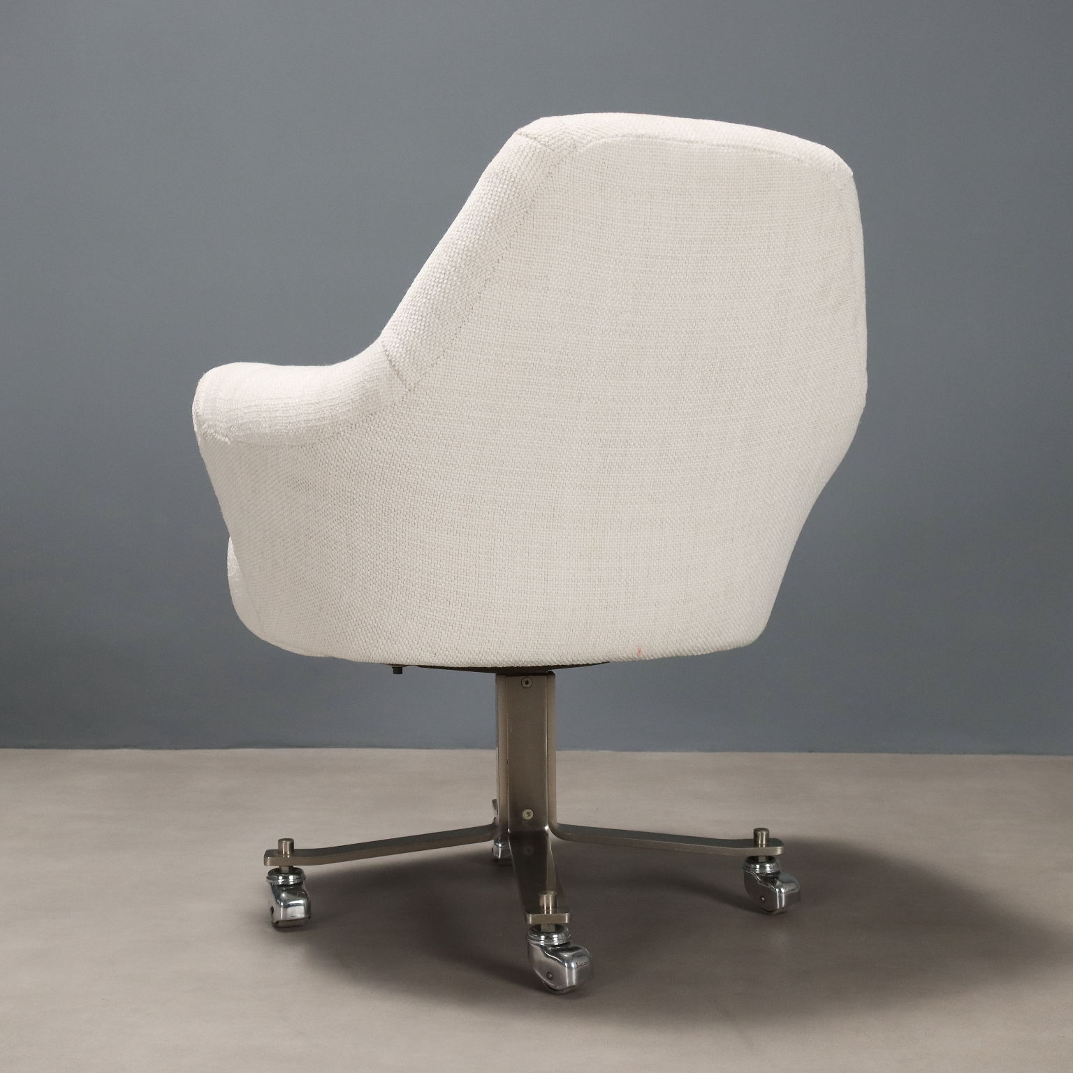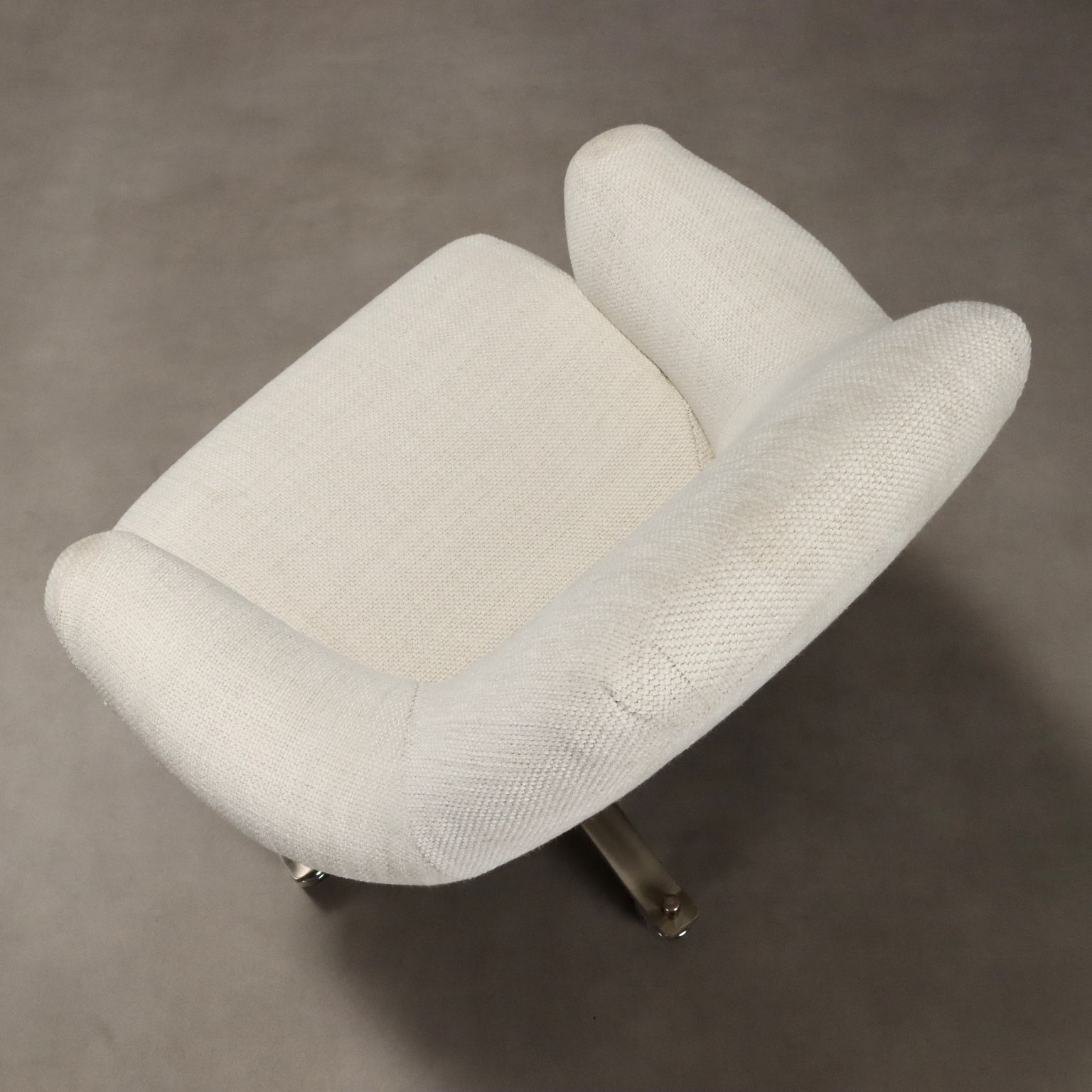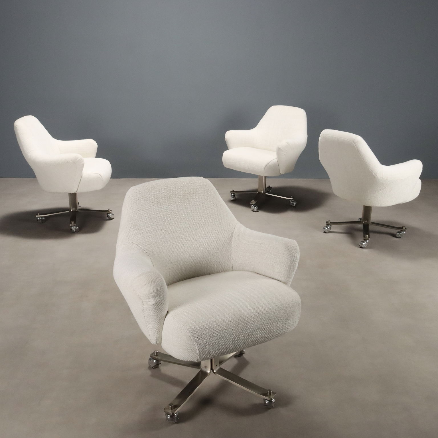 Set di poltrone con base a quattro razze in metallo con rotelle, imbottitura in espanso e rivestimento in tessuto bianco. Sedute che si prestano ad essere rinnovate nella tappezzeria scegliendo tra i numerosi tessuti disponibili nei nostri laboratori.