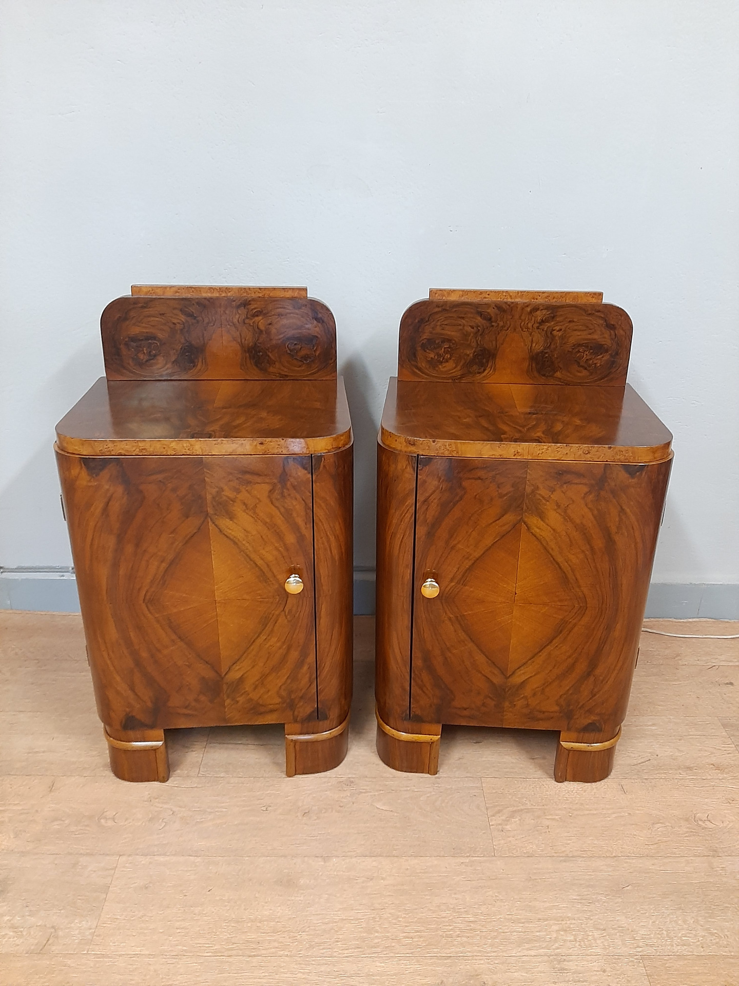 Coppia di comodini art deco in noce bionda e radica originali anno 1930-40