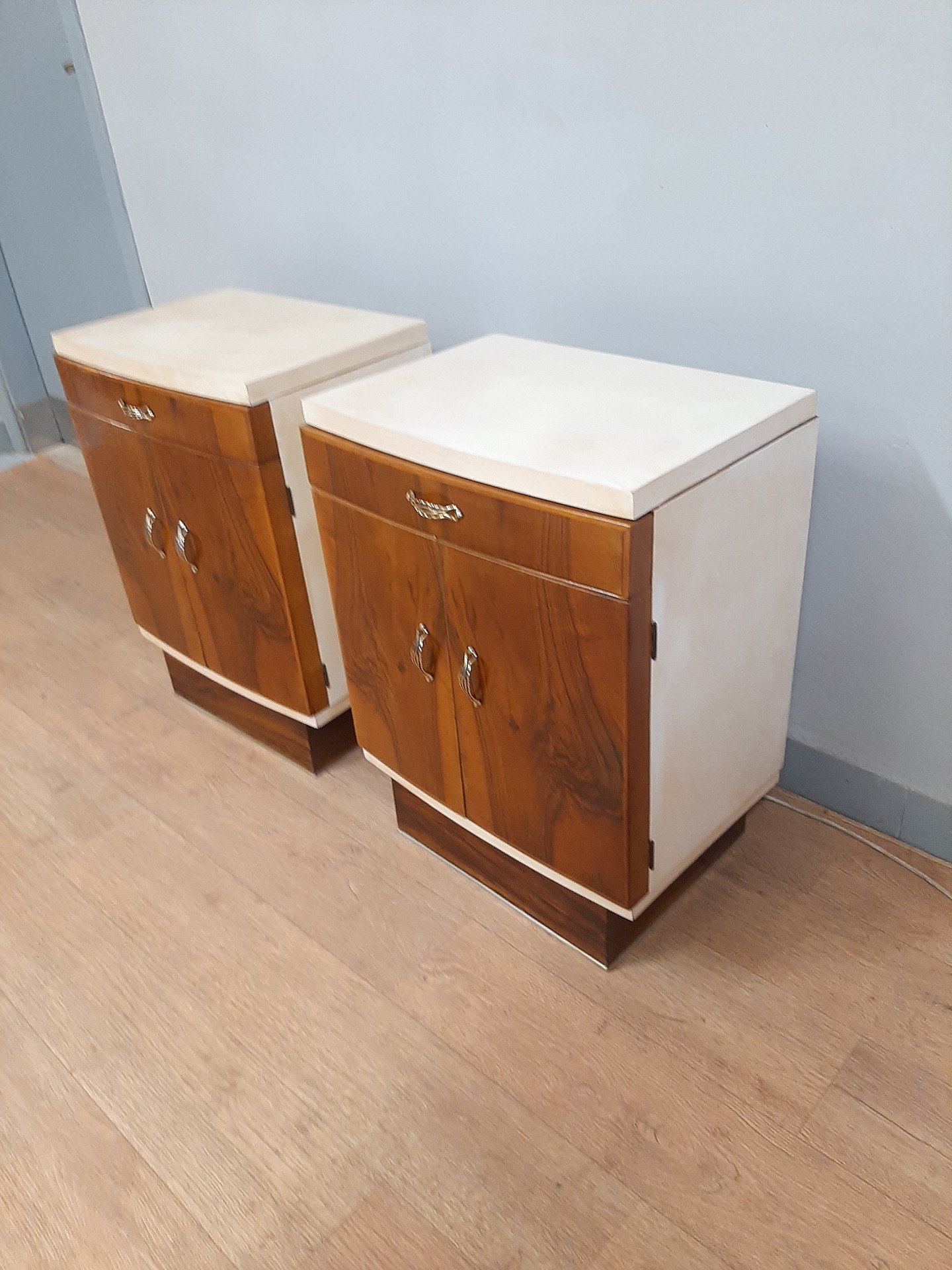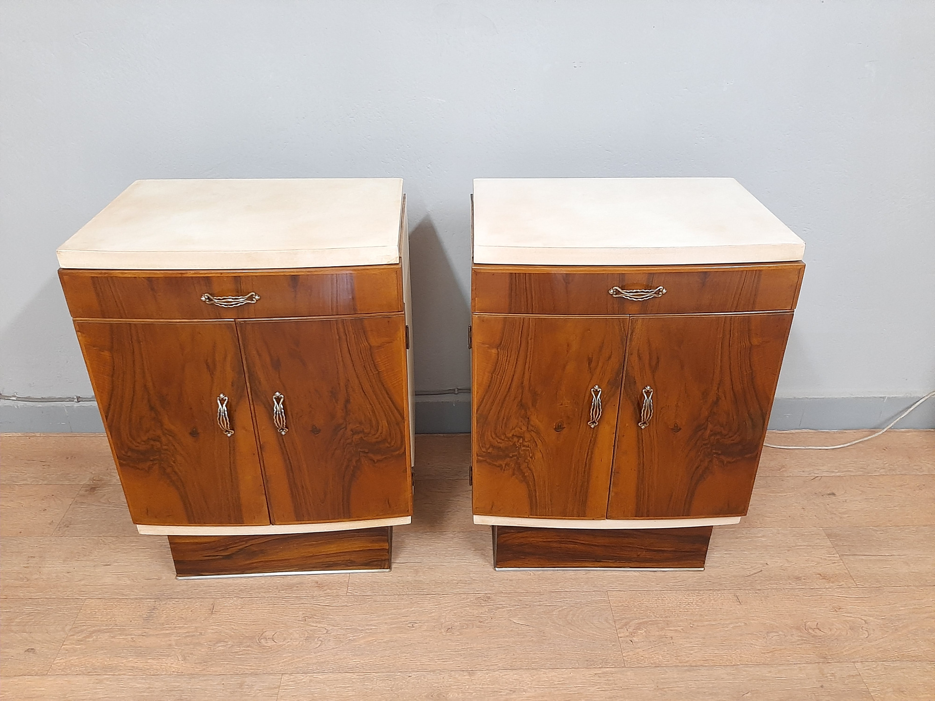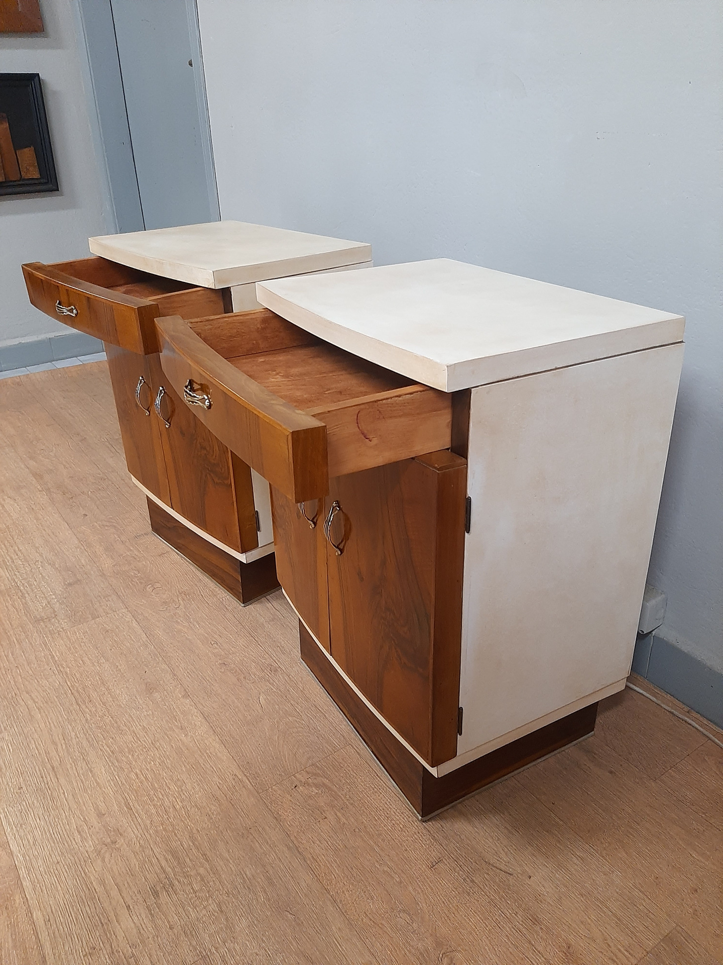 Coppia di grandi comodini art deco in noce e pergamena originali anno 1930-40