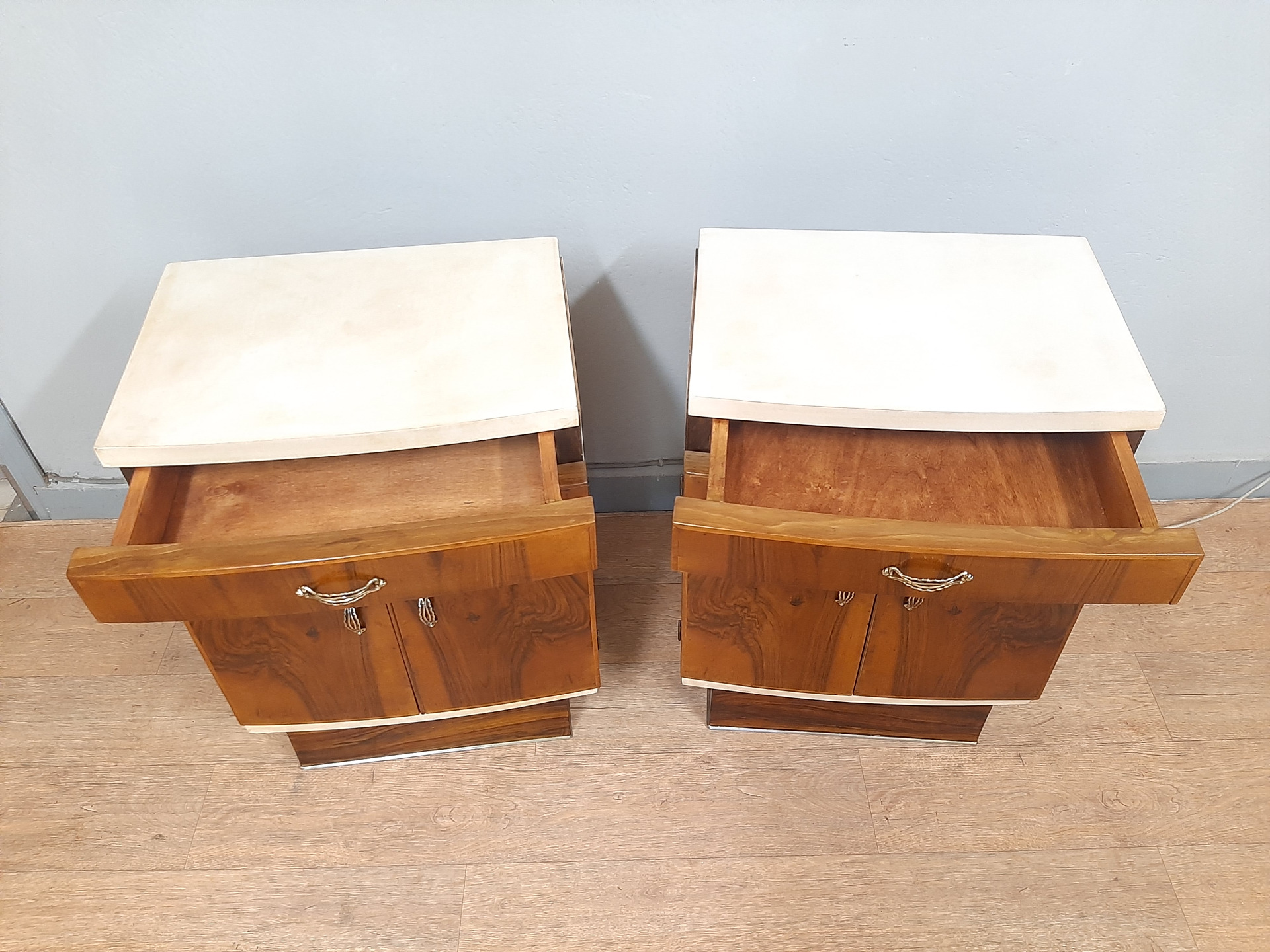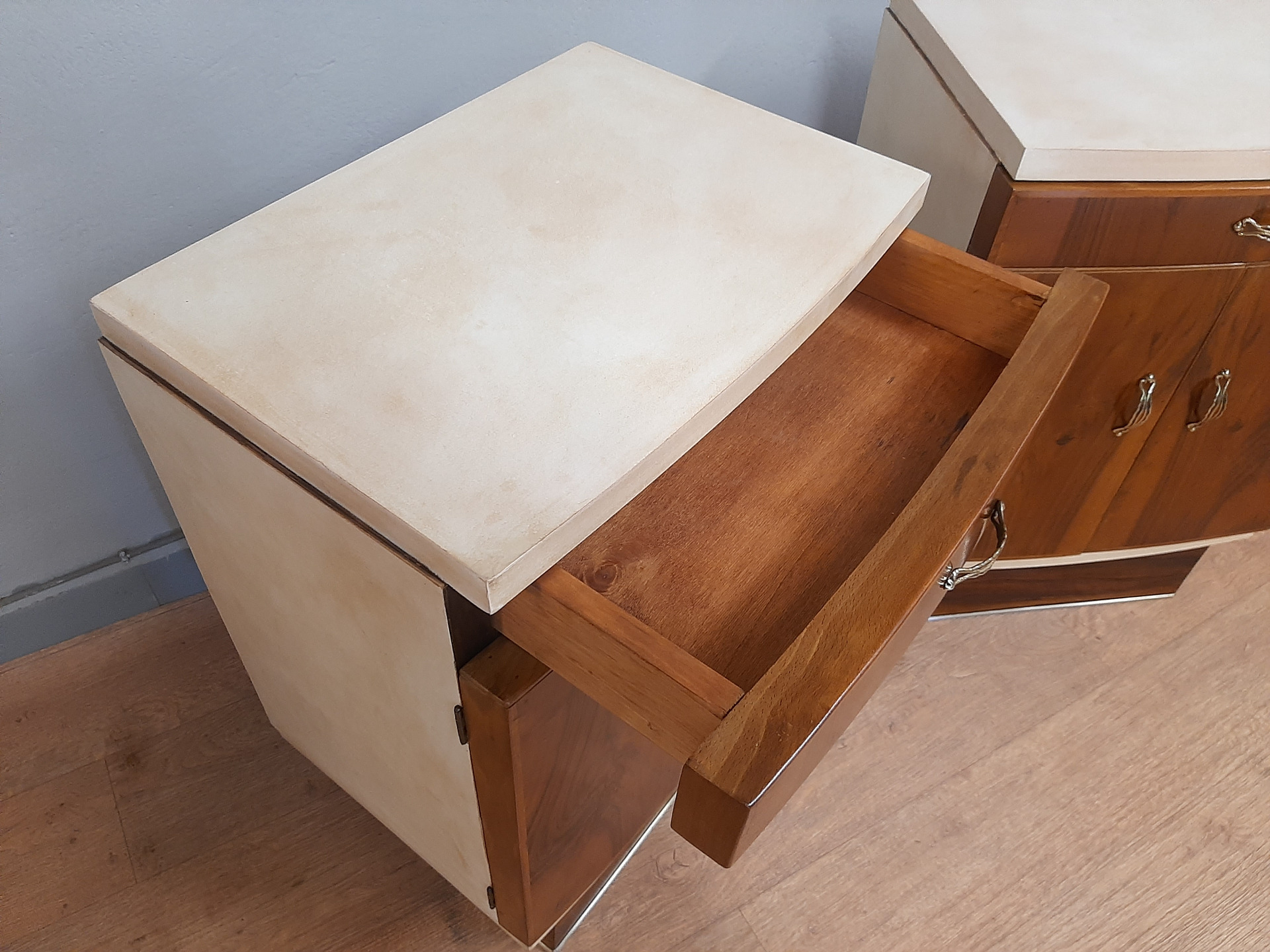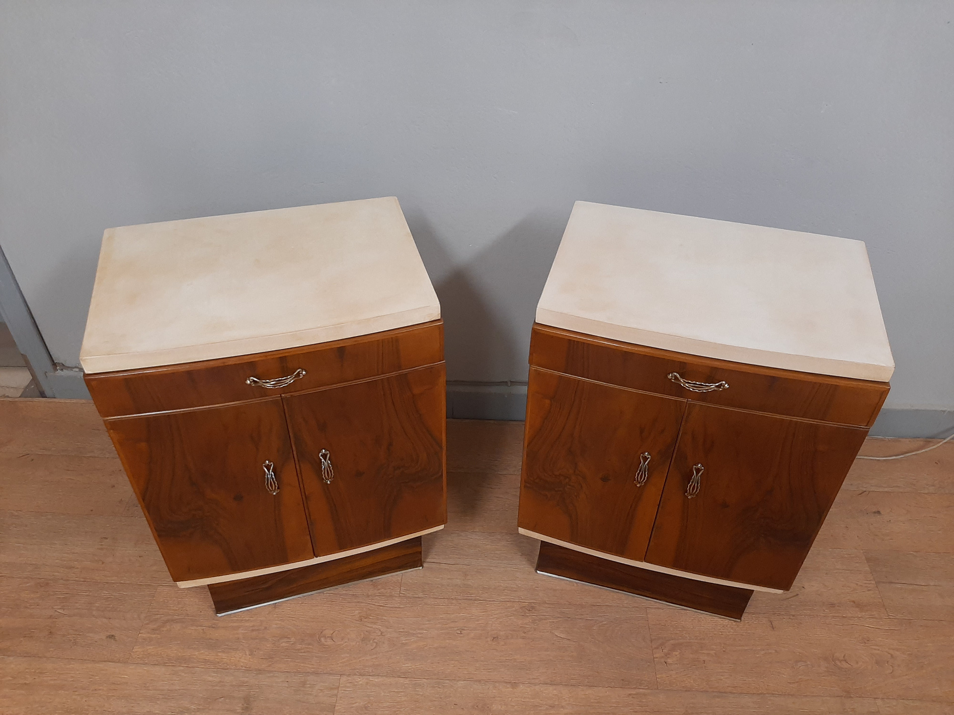 Coppia di grandi comodini art deco in noce e pergamena originali anno 1930-40