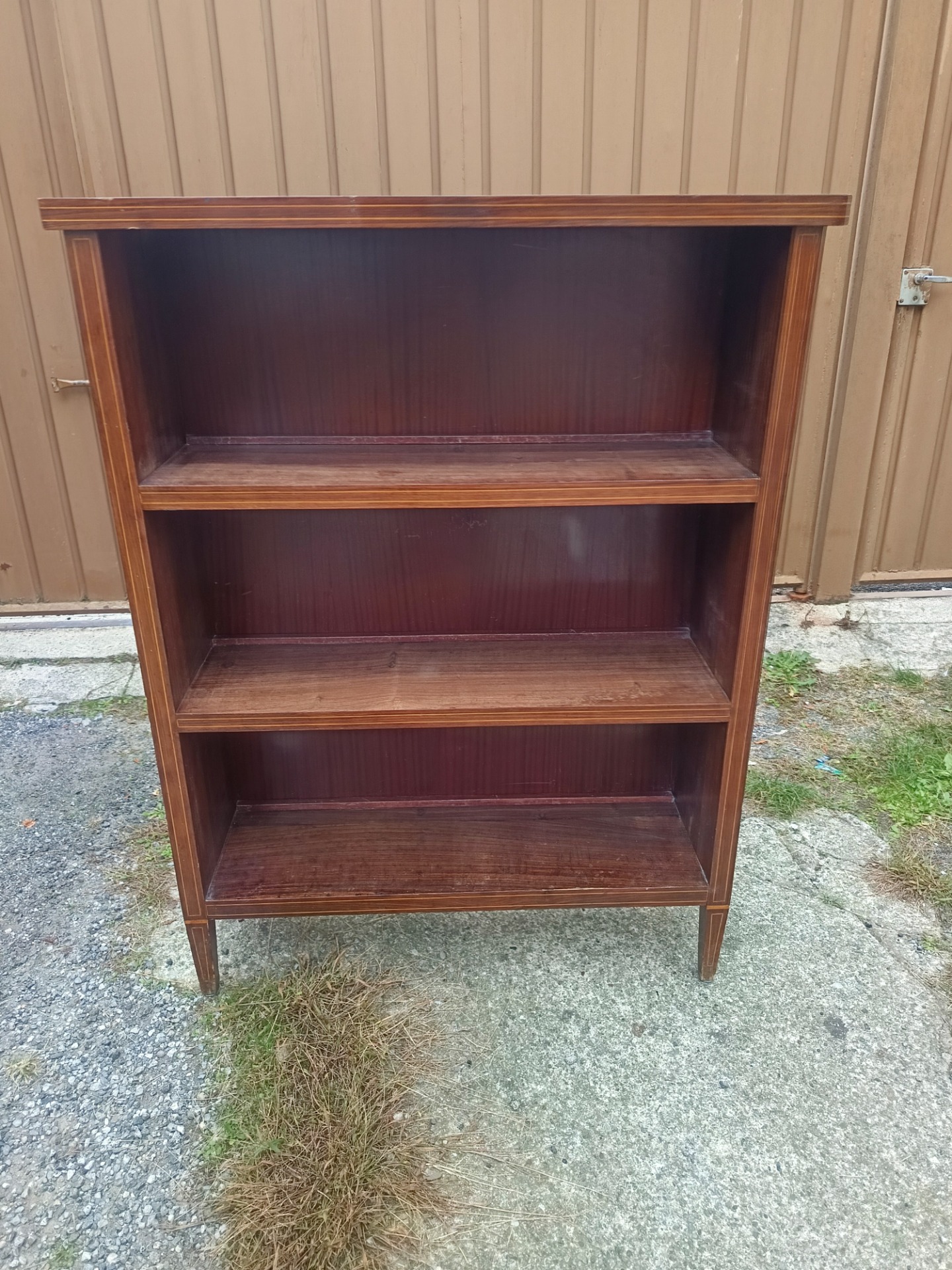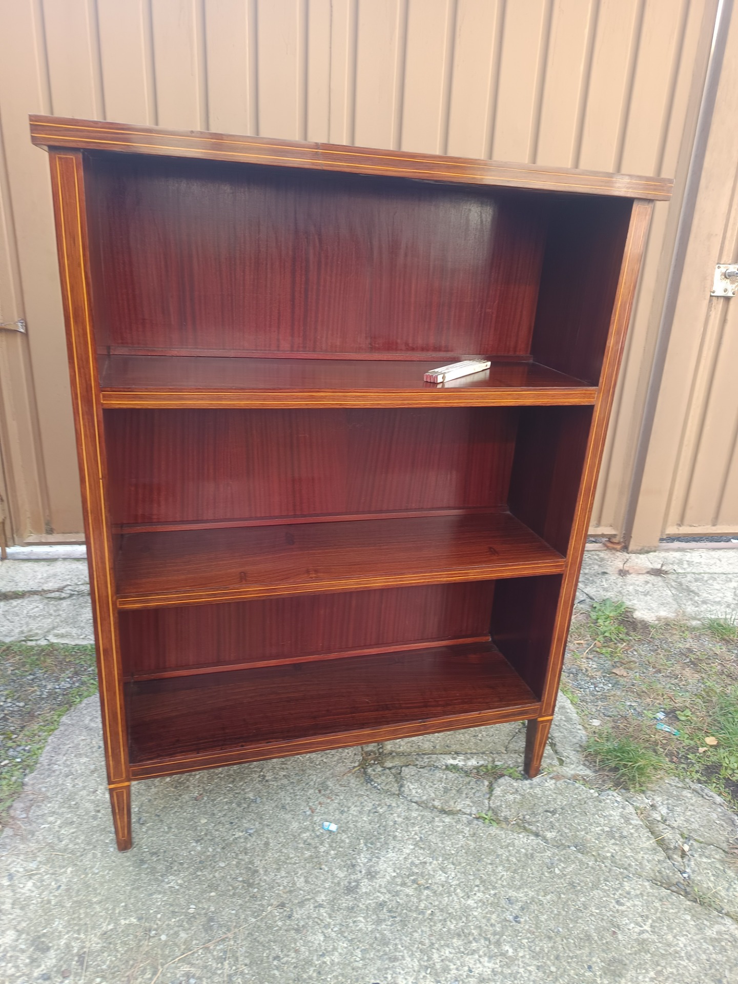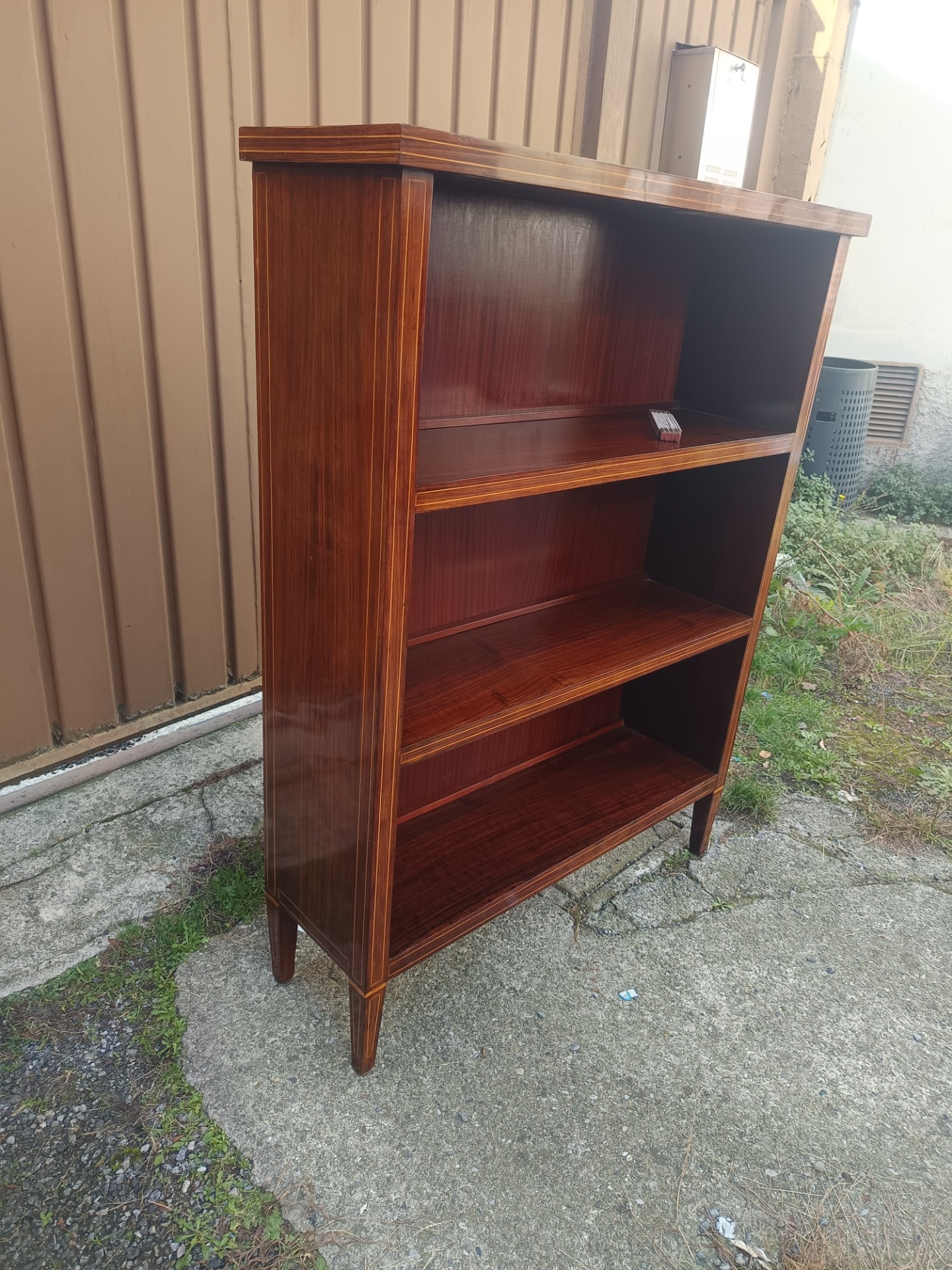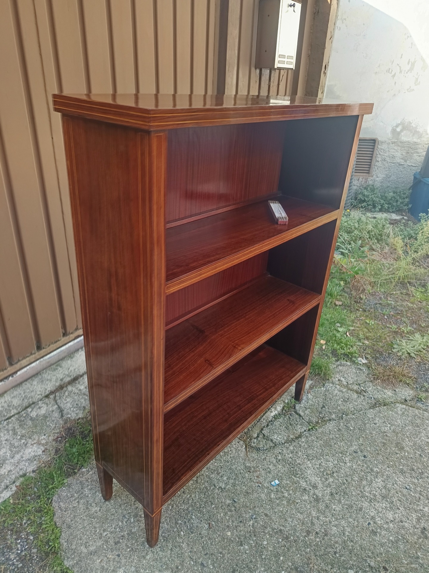 Elegante libreria anni 50 in mogano con filetti in acero. Misure: cm 104 x 30 x 138 di altezza