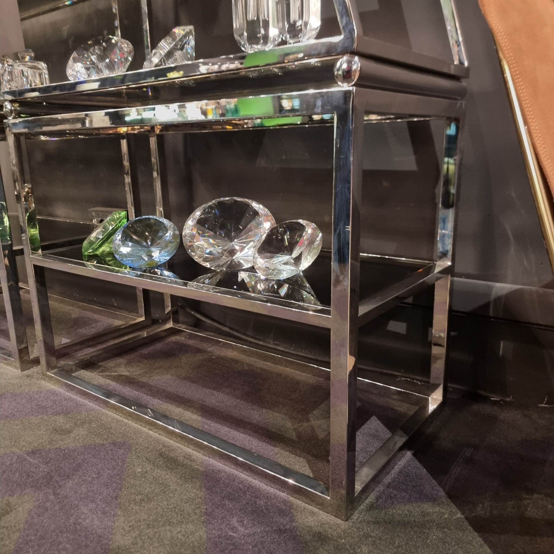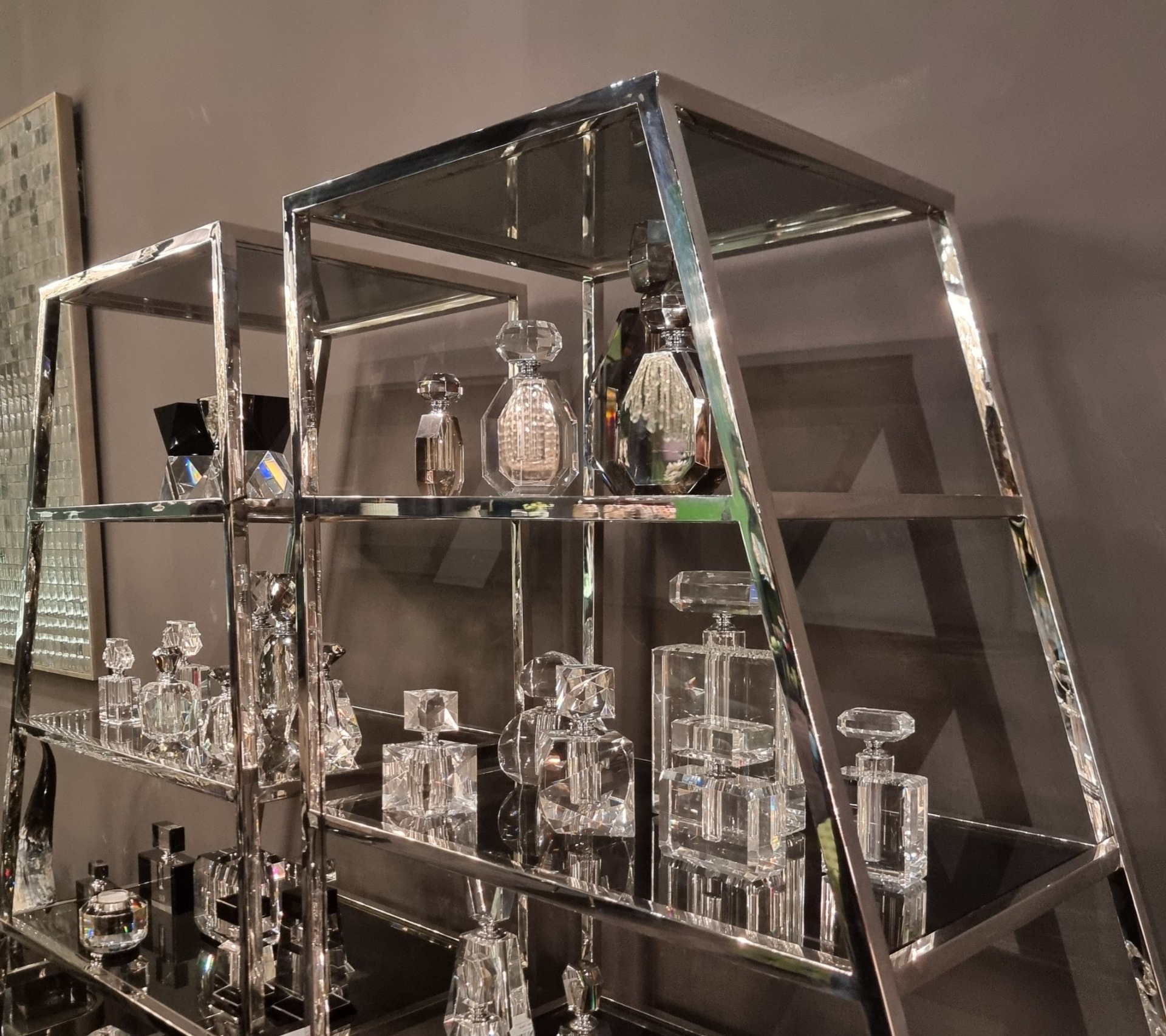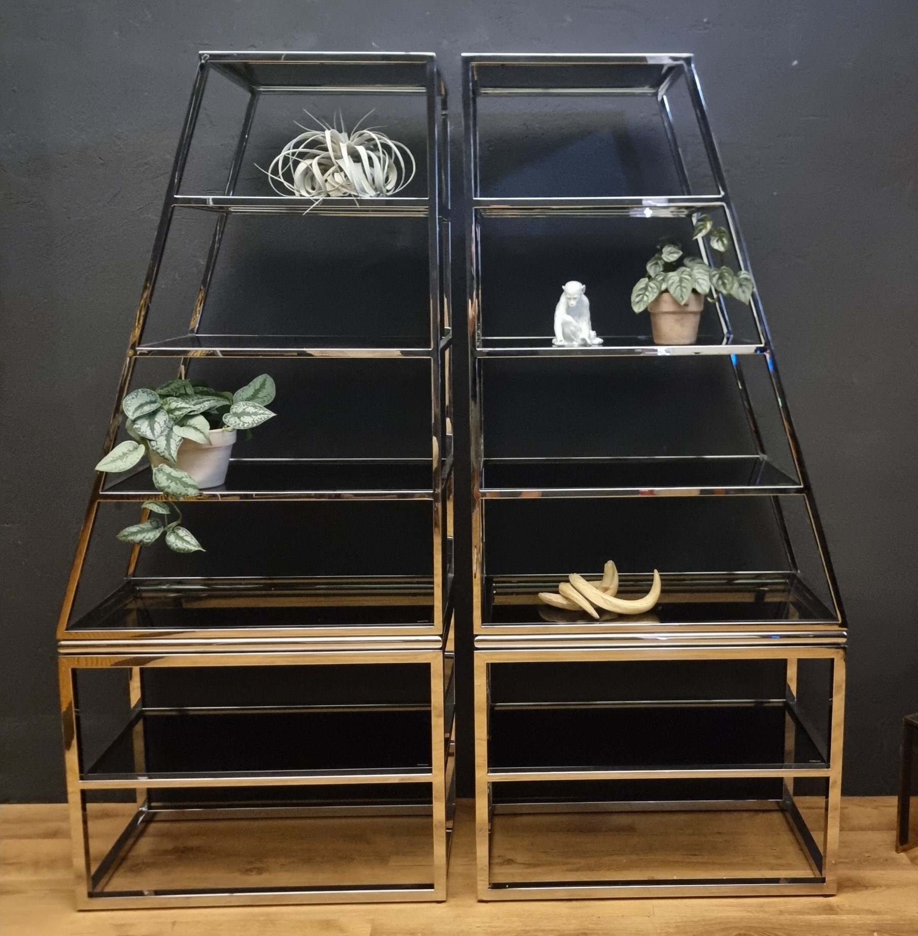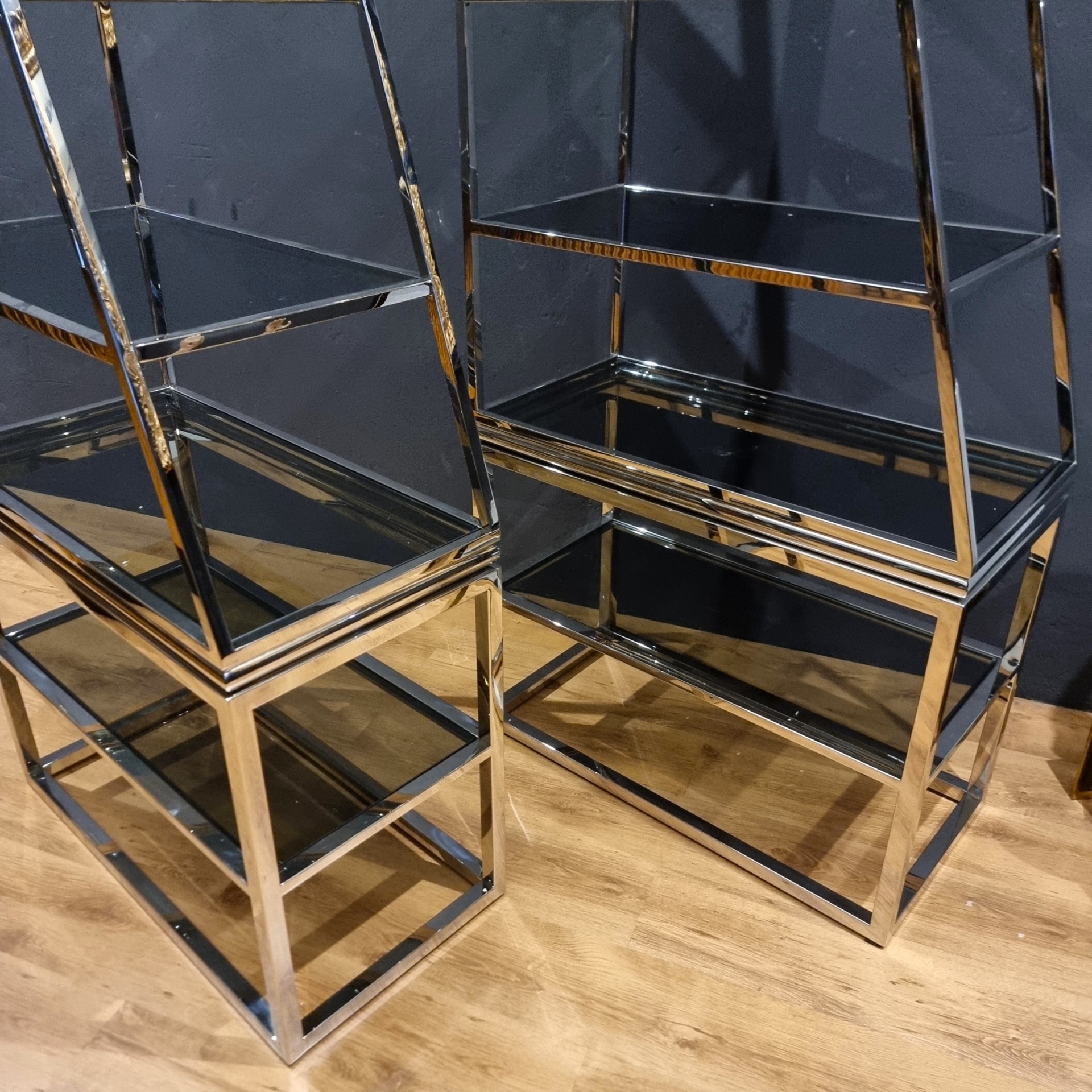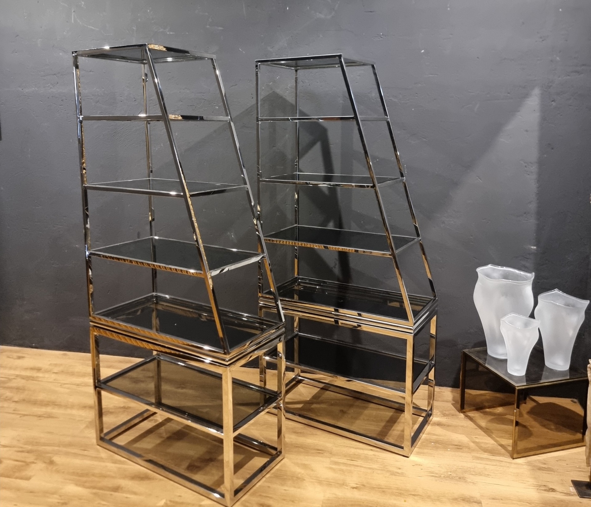 Le nostre eleganti etagere sono un tributo al design vintage, con una struttura in acciaio cromato e piani in vetro che aggiungono un tocco di classe e raffinatezza a qualsiasi ambiente. Queste etagere sono un connubio perfetto tra forma e funzione.