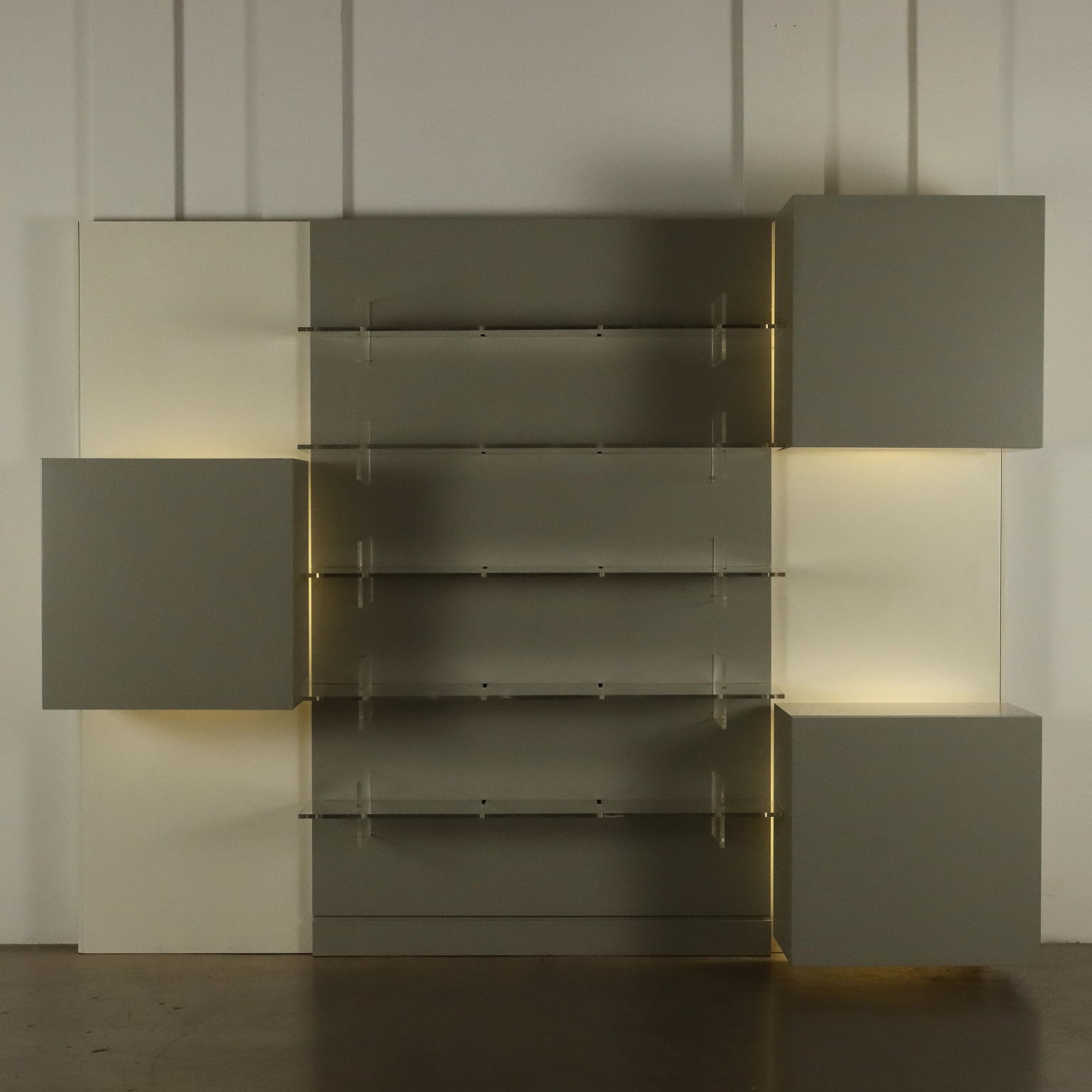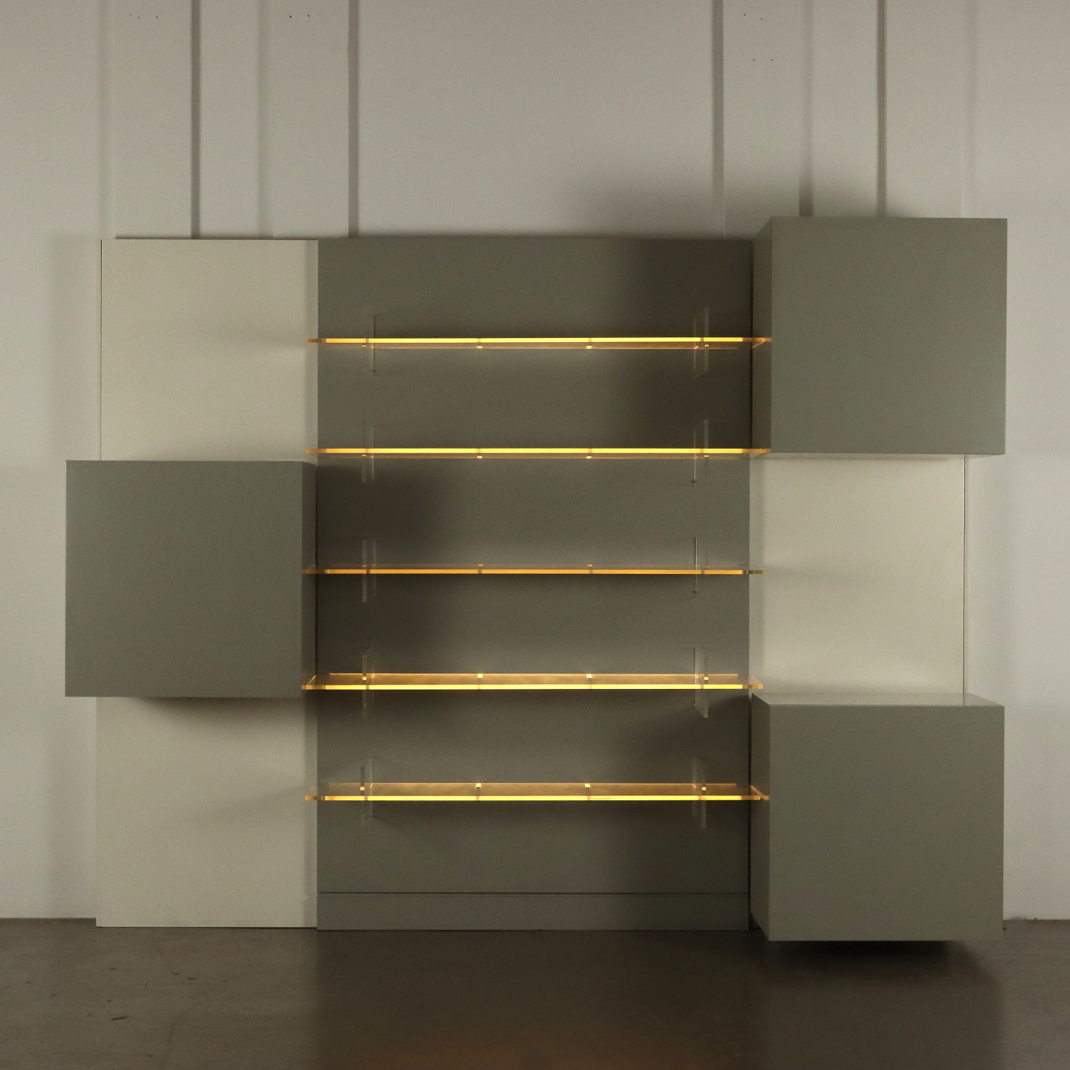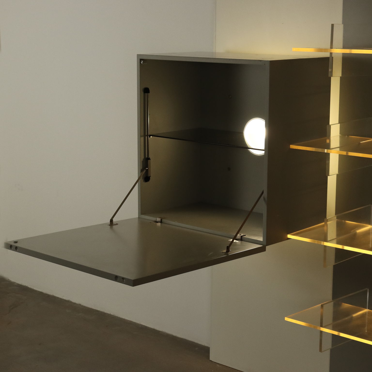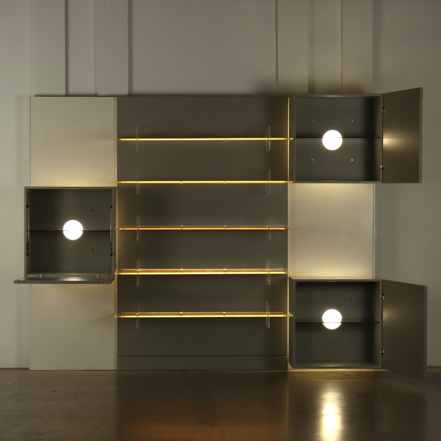 Libreria da parete modulare realizzata con elementi della serie 'Life' in legno laccato grigio con apertura a ribalta e battente con ripiani interni in cristallo. Nella parte centrale ripiani in plexiglass della serie 'Night&Day'. Possibilità di illuminare solo i contenitori, solo i ripiani oppure entrambi. Arredo in buone condizioni generali che mostra qualche segno del tempo come visibile in foto, sia nelle ante che nella parte centrale inferiore.