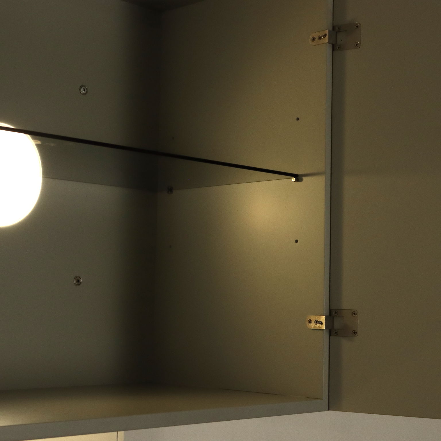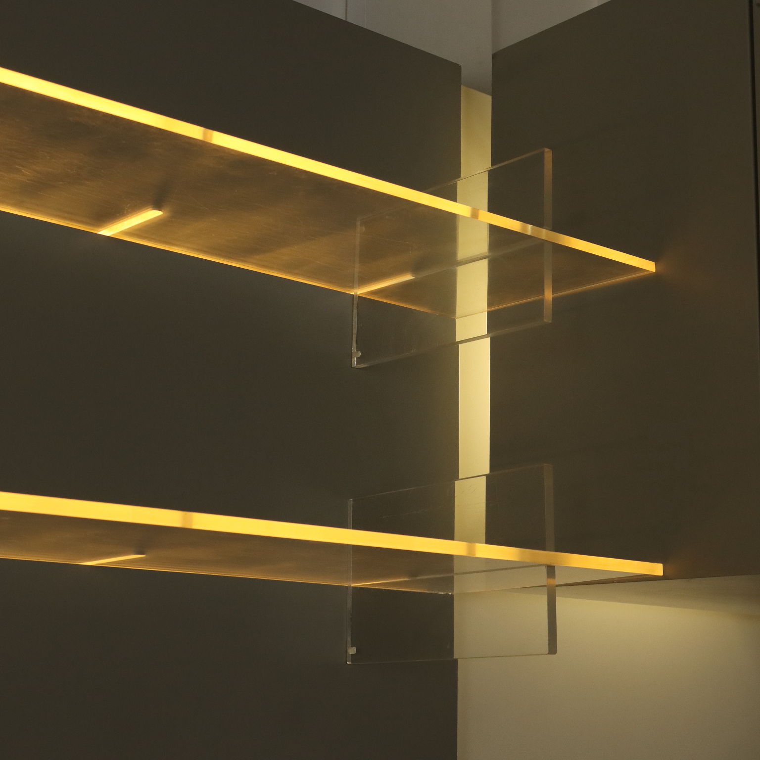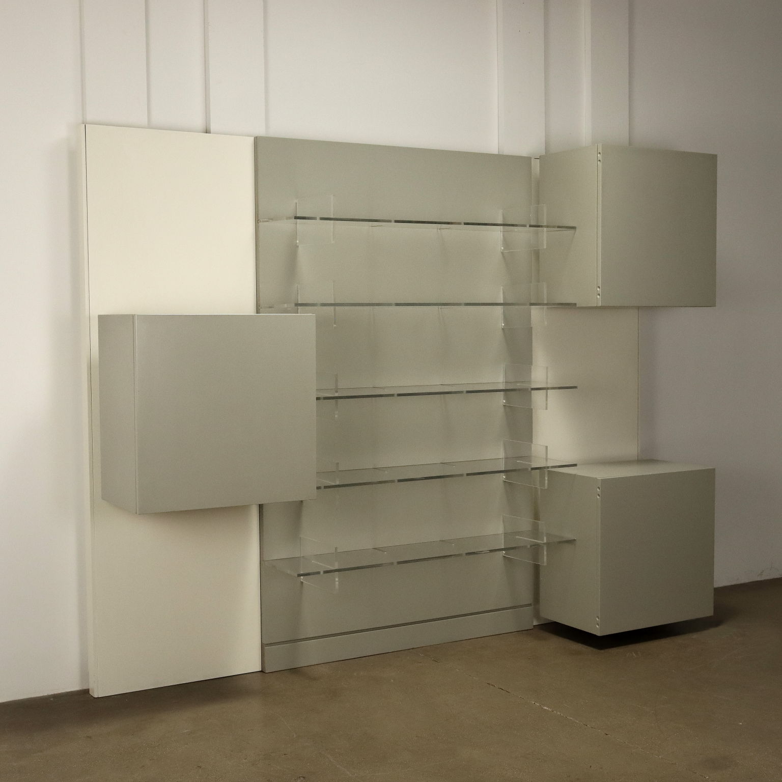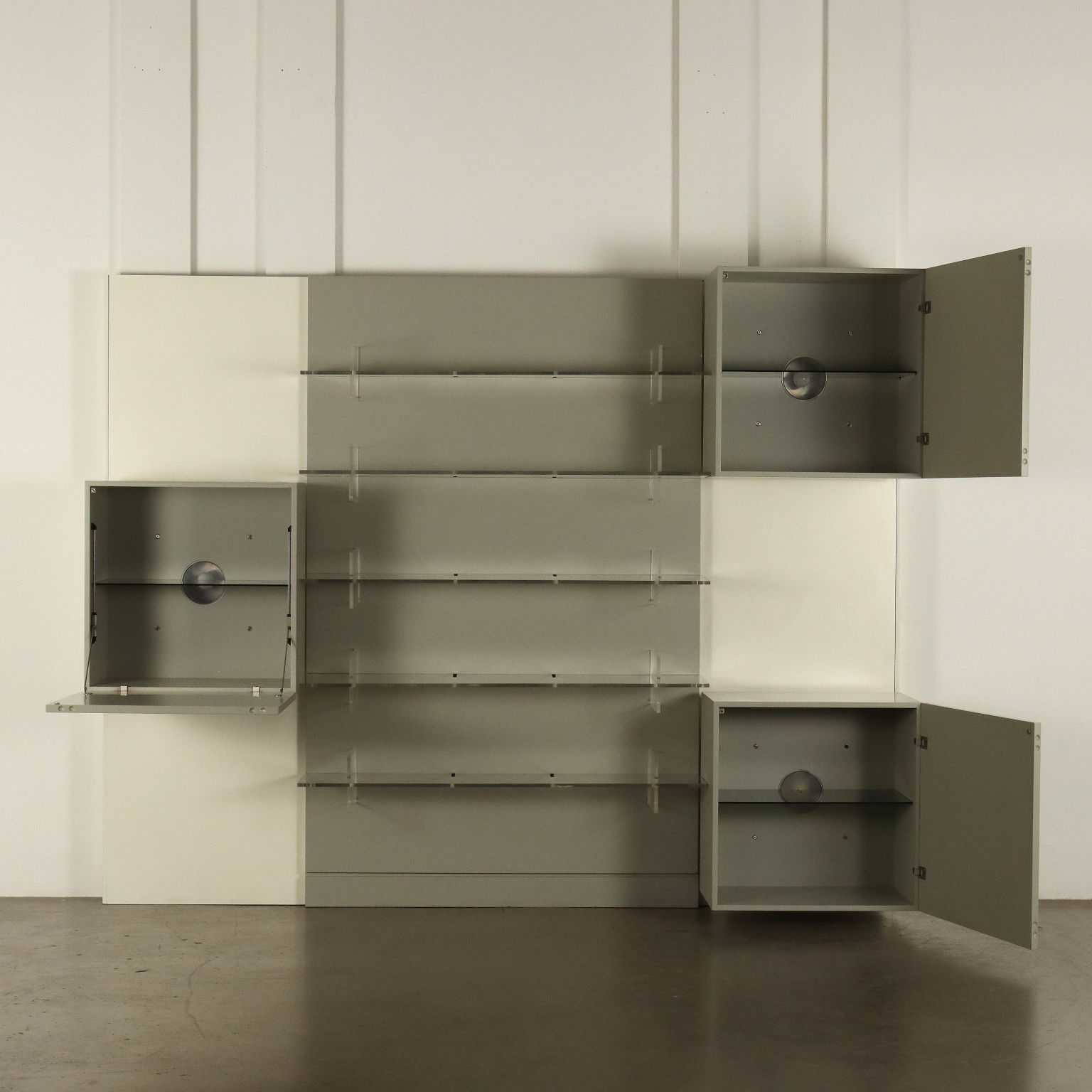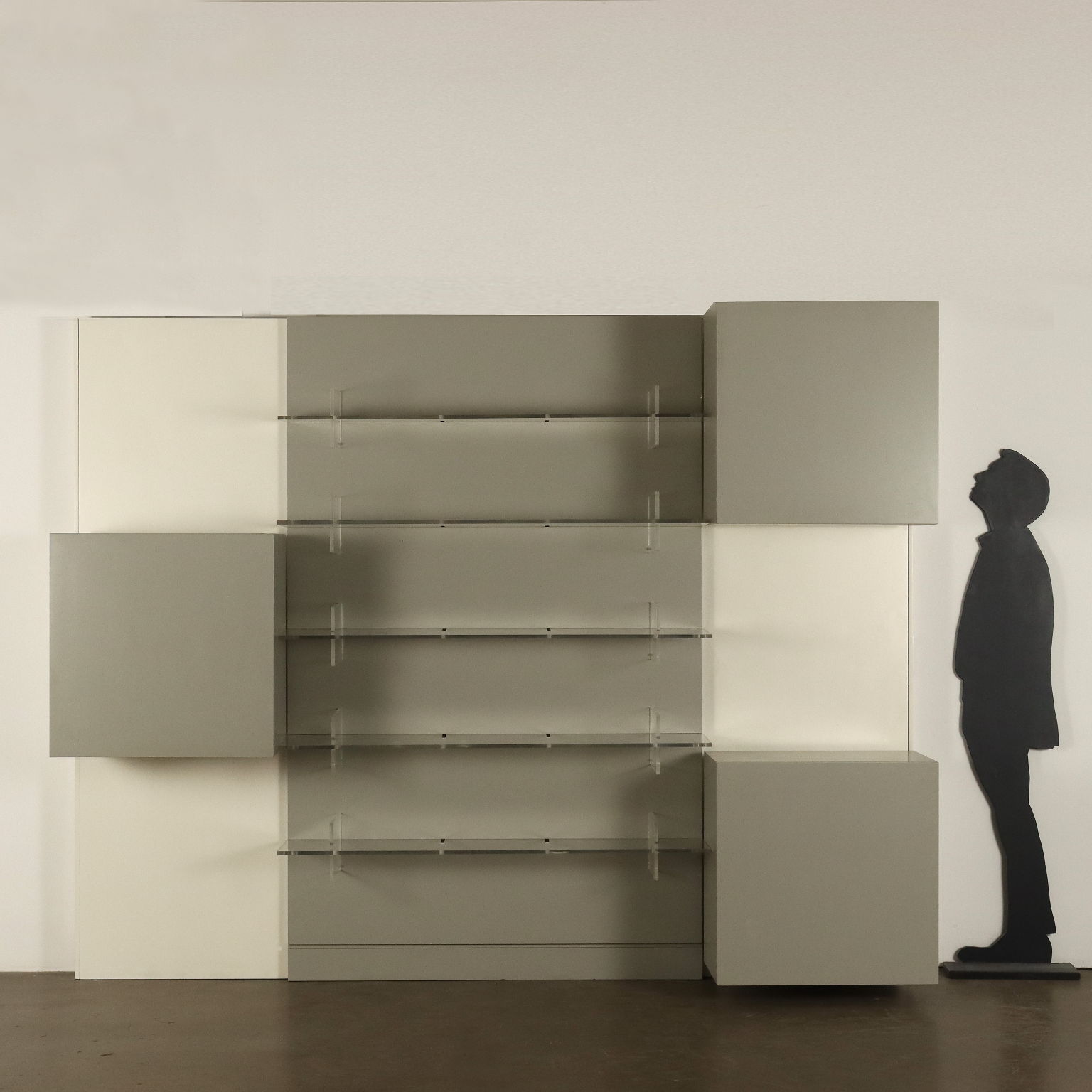 Libreria da parete modulare realizzata con elementi della serie 'Life' in legno laccato grigio con apertura a ribalta e battente con ripiani interni in cristallo. Nella parte centrale ripiani in plexiglass della serie 'Night&Day'. Possibilità di illuminare solo i contenitori, solo i ripiani oppure entrambi. Arredo in buone condizioni generali che mostra qualche segno del tempo come visibile in foto, sia nelle ante che nella parte centrale inferiore.