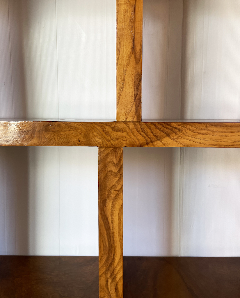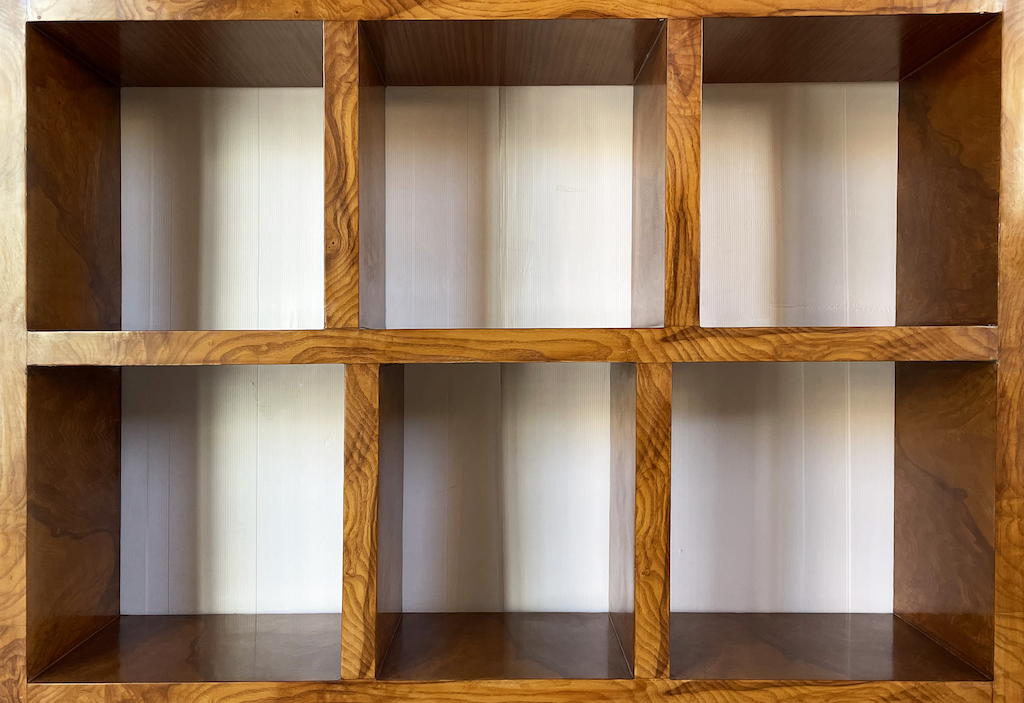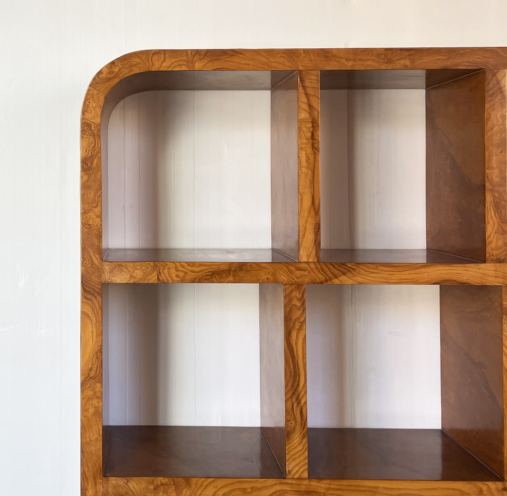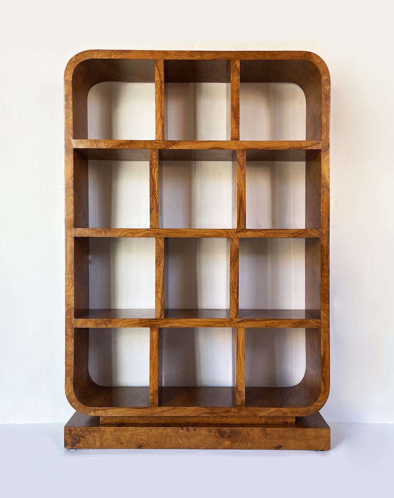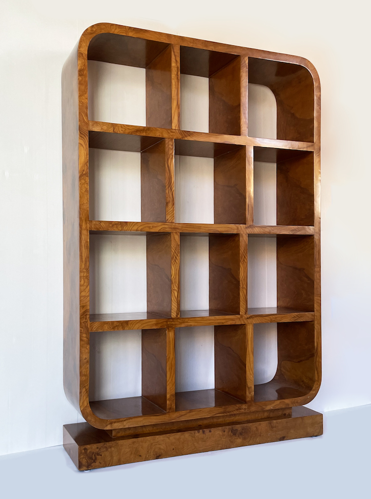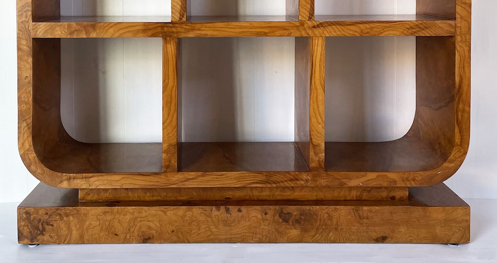 Particolare libreria modulare in stile Déco interamente in Radica di Mogano.