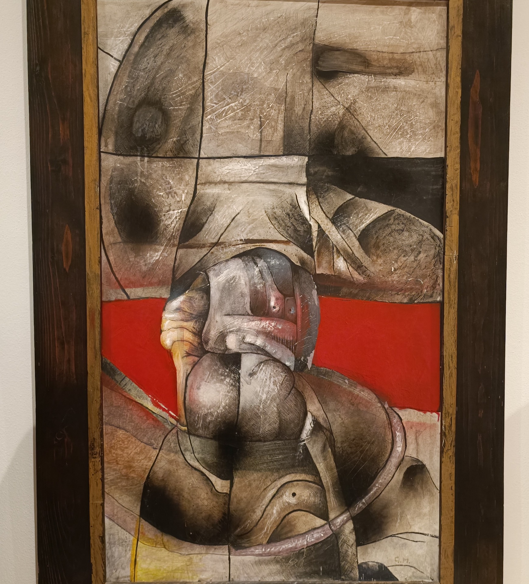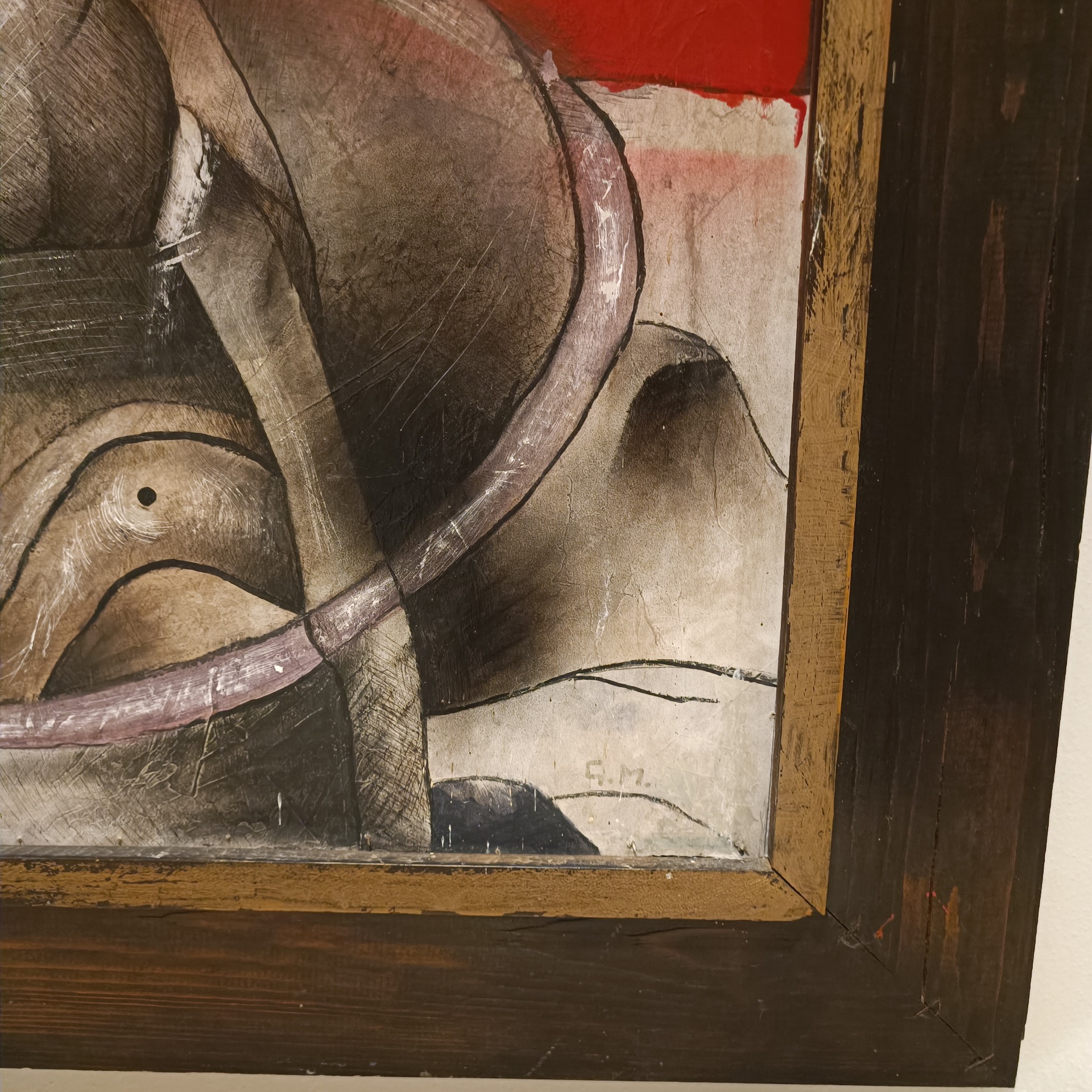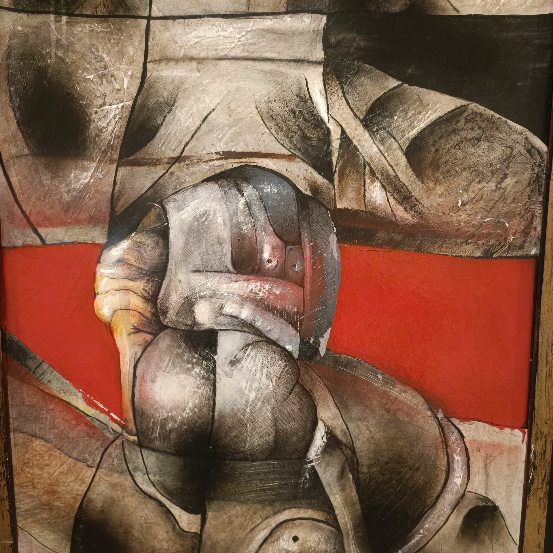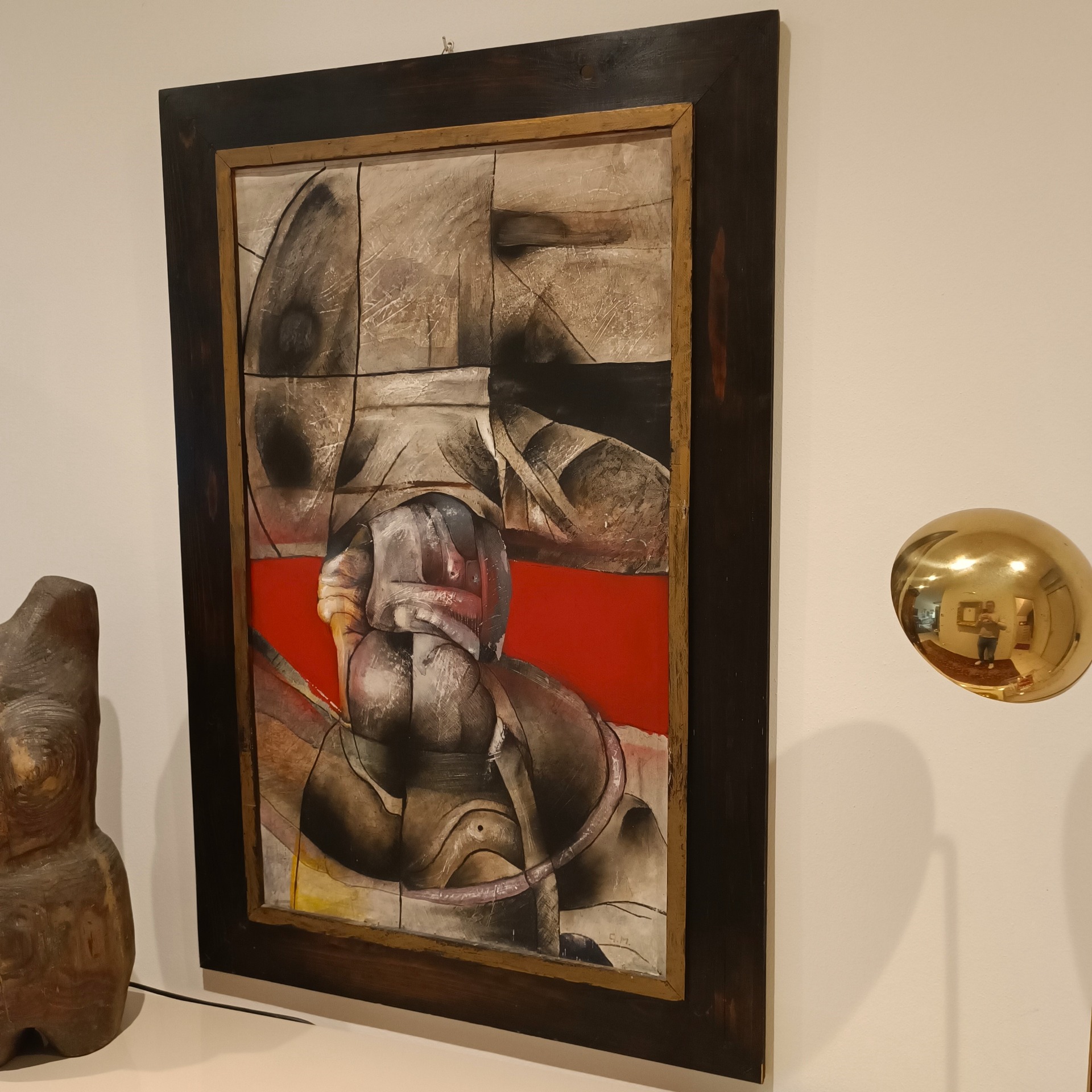 L'uso della tecnica mista dona alla composizione una texture vibrante e intensa, mentre i colori decisi e le linee audaci raccontano la potenza espressiva del periodo. Ogni pennellata trasmette emozione, richiamando la brutalità estetica tipica del movimento, e al tempo stesso rivelando una sensibilità profonda. Il contrasto tra le superfici grezze e la delicatezza cromatica crea un equilibrio sorprendente, capace di catturare lo sguardo e stimolare la riflessione.
