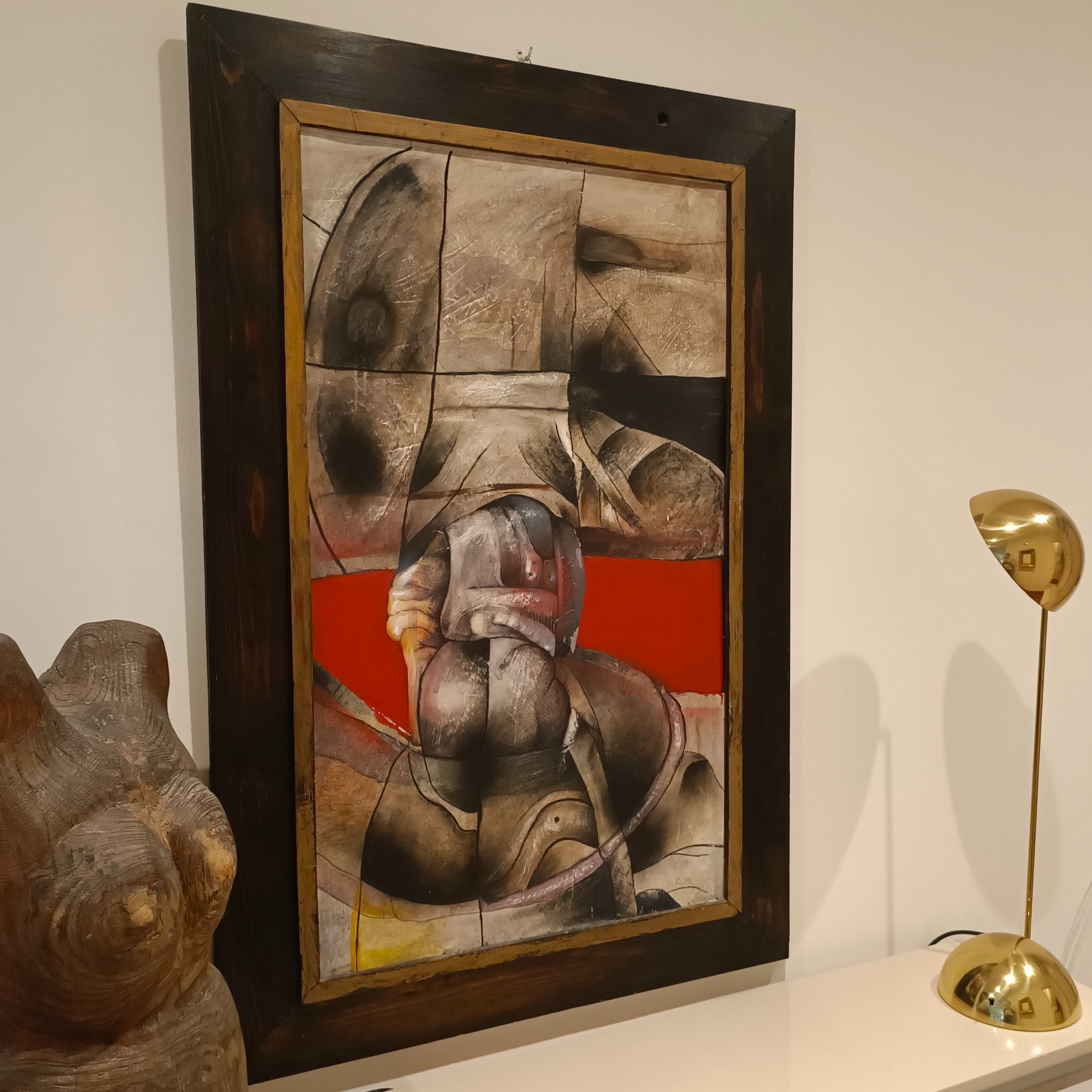 Questa straordinaria pittura brutalista anni '50, realizzata con tecnica mista su cartoncino, rappresenta un'autentica espressione di forza e dinamismo. Il movimento brutalista, noto per le sue forme audaci e la cruda sincerità dei materiali, trova in quest'opera una sintesi perfetta di energia e modernità. Le dimensioni di 120x80 cm, cornice lignea compresa, la rendono perfetta per diventare protagonista di qualsiasi spazio raffinato e contemporaneo. In eccellenti condizioni generali, è pronta per donare carattere e stile al tuo ambiente.