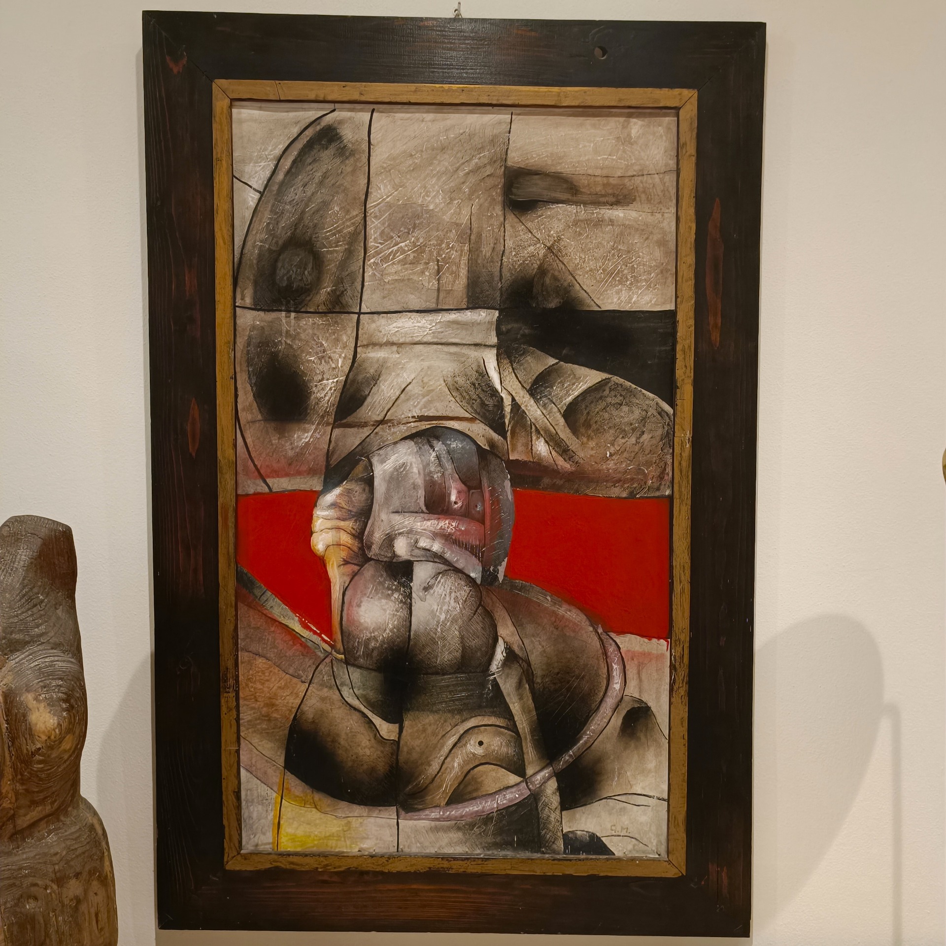 L'uso della tecnica mista dona alla composizione una texture vibrante e intensa, mentre i colori decisi e le linee audaci raccontano la potenza espressiva del periodo. Ogni pennellata trasmette emozione, richiamando la brutalità estetica tipica del movimento, e al tempo stesso rivelando una sensibilità profonda. Il contrasto tra le superfici grezze e la delicatezza cromatica crea un equilibrio sorprendente, capace di catturare lo sguardo e stimolare la riflessione.