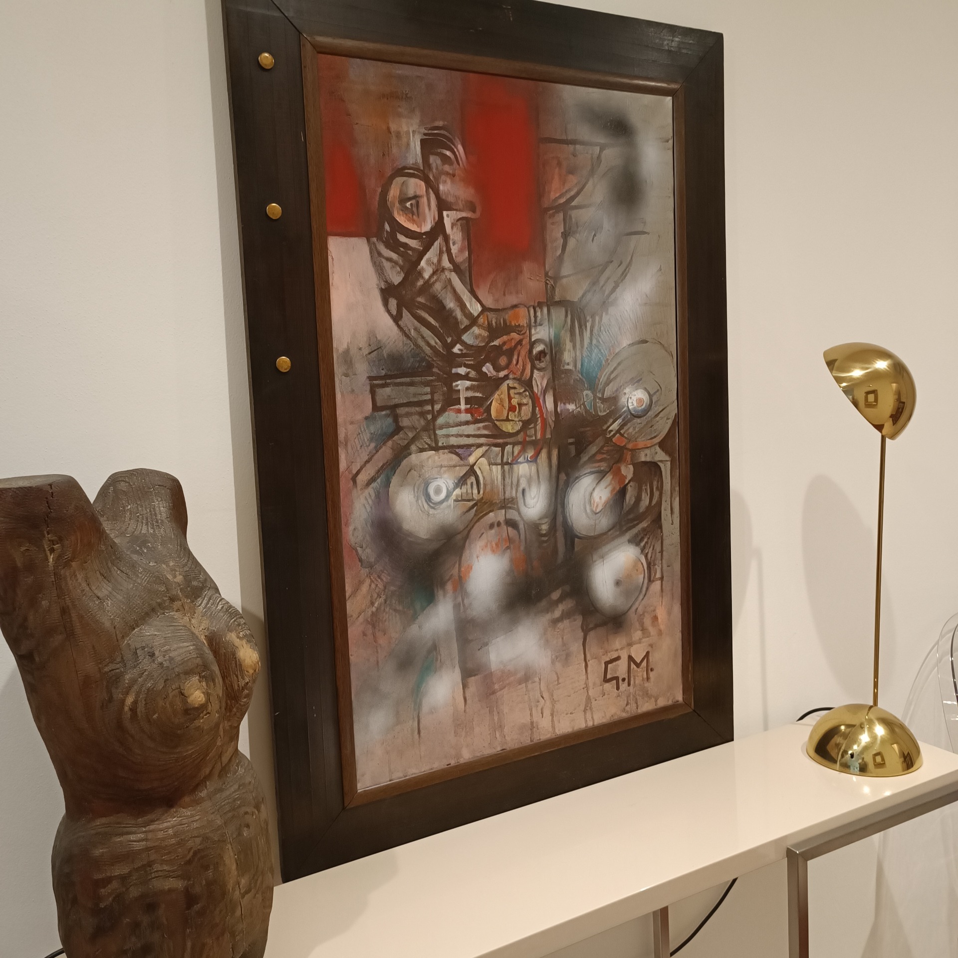 Questa straordinaria pittura brutalista anni '60/70, realizzata con tecnica mista su tela, rappresenta un'autentica espressione di forza e dinamismo. Il movimento brutalista, noto per le sue forme audaci e la cruda sincerità dei materiali, trova in quest'opera una sintesi perfetta di energia e modernità. Le dimensioni di 120x80 cm, cornice lignea compresa, la rendono perfetta per diventare protagonista di qualsiasi spazio raffinato e contemporaneo. In eccellenti condizioni generali, è pronta per donare carattere e stile al tuo ambiente.