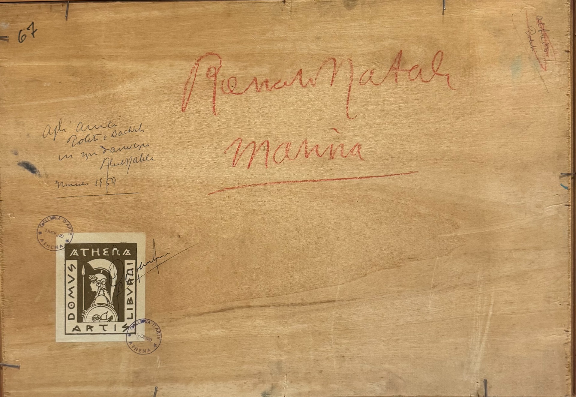 Al verso reca dedica, data e cartiglio con timbro e firma della Galleria Athena di Livorno.