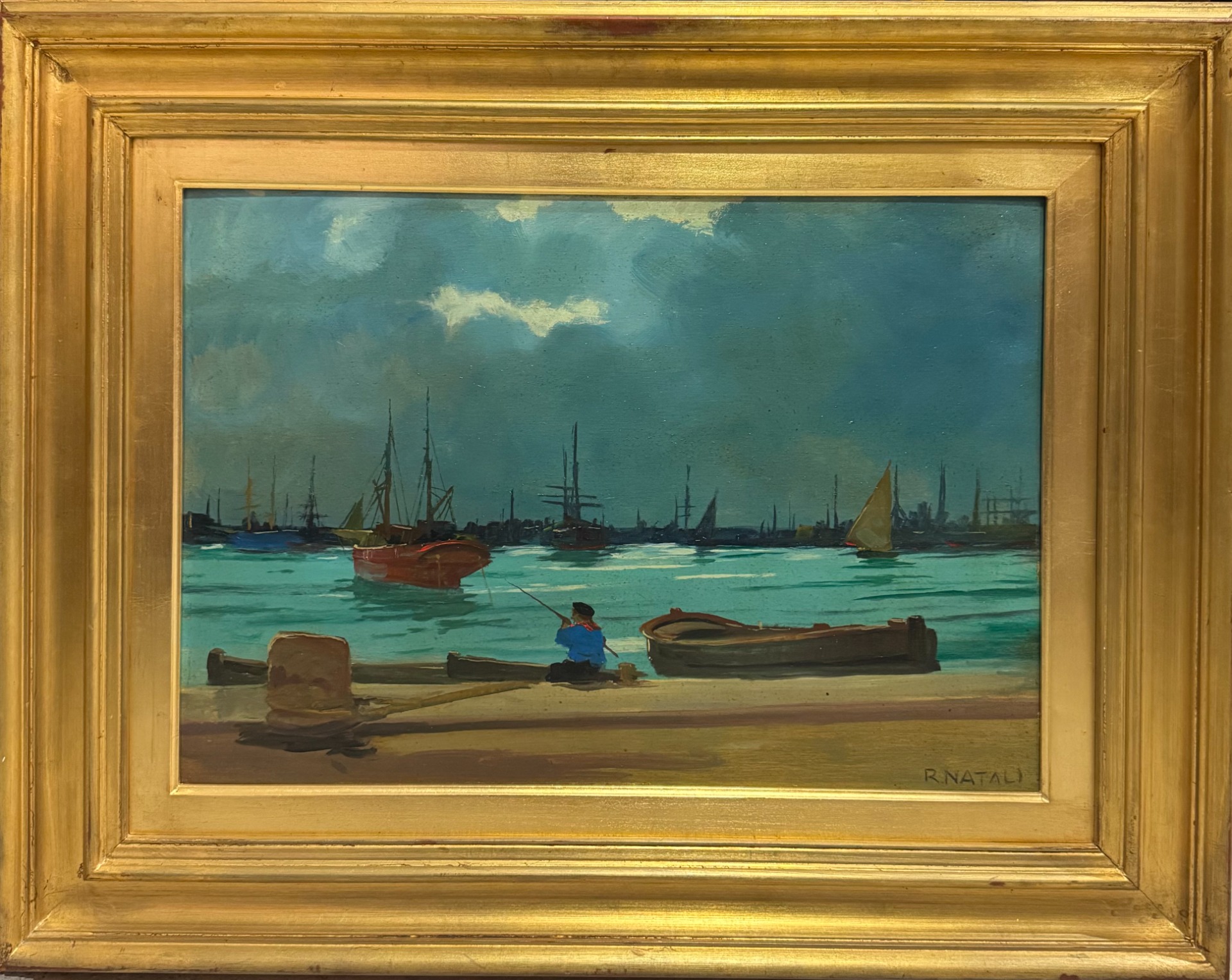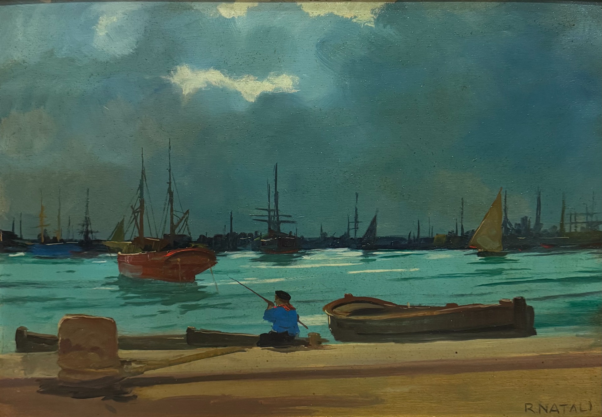 Sullo sfondo, altre barche punteggiano l’orizzonte del porto. Il mare è rappresentato con tonalità intense e vivaci, la pennellata del Natali è veloce e la tavolozza utilizza contrasti cromatici forti che danno energia alla scena rendendola vibrante e viva, caratteristiche della formazione macchiaiola del Natali.