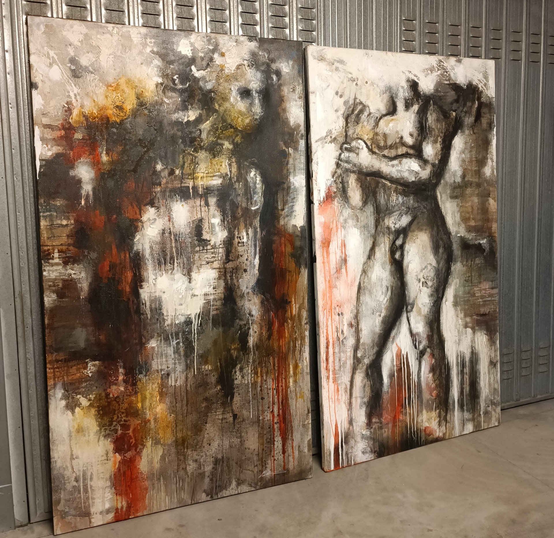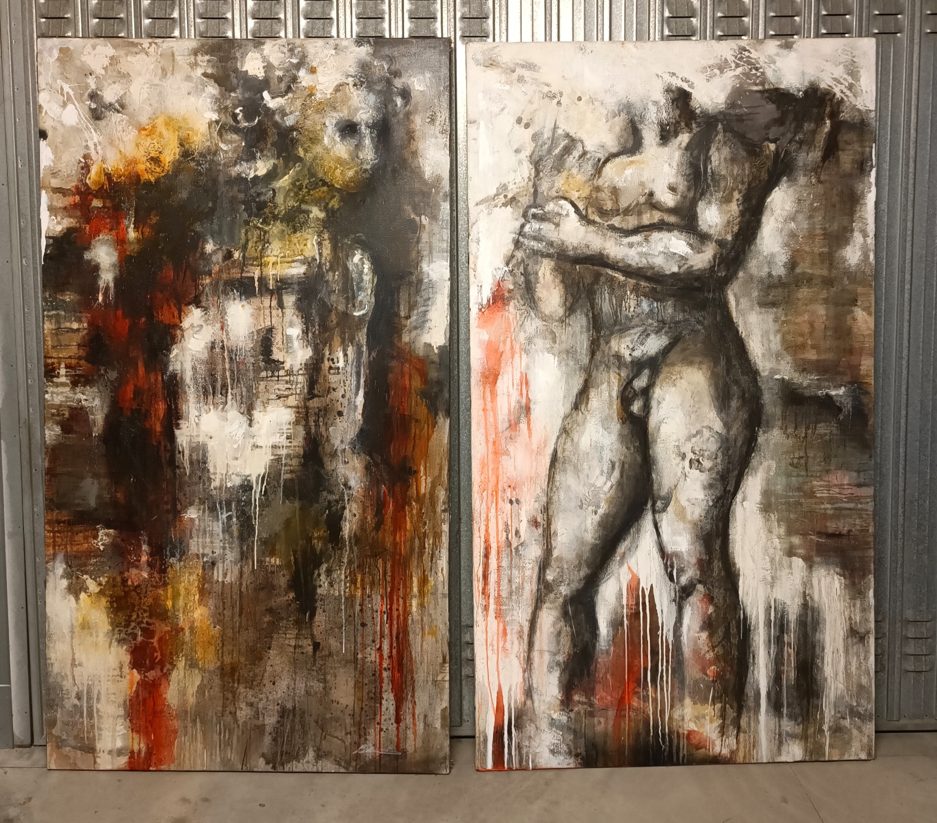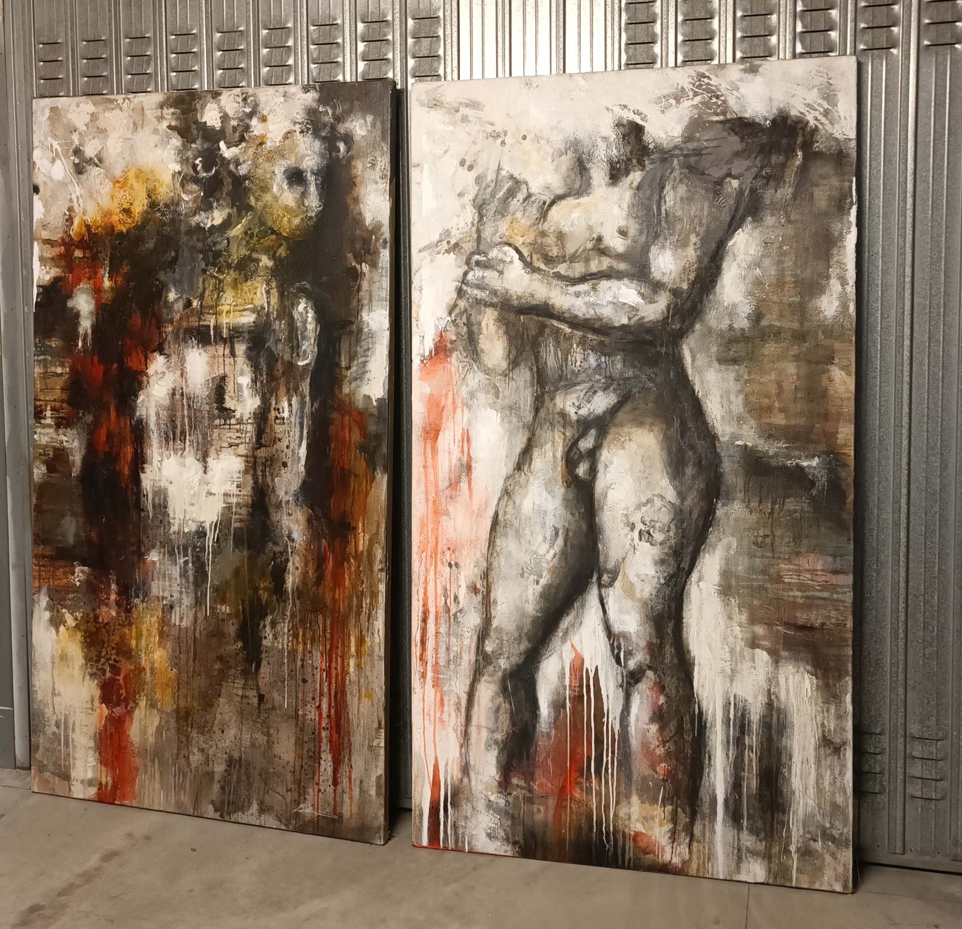 La coppia di dipinti si distingue per la capacità di unire armonia formale e forza espressiva. Le pennellate fluide e sicure evidenziano la padronanza tecnica dell’artista, mentre la scelta cromatica, sobria ma vibrante, conferisce ai nudi una sensualità elegante, mai ostentata. Inoltre, l’intenzione di interrompere e riprendere la figura in due tele distinte crea un dinamismo visivo che cattura lo sguardo e stimola la riflessione, trasformando le opere in un racconto visivo continuo.