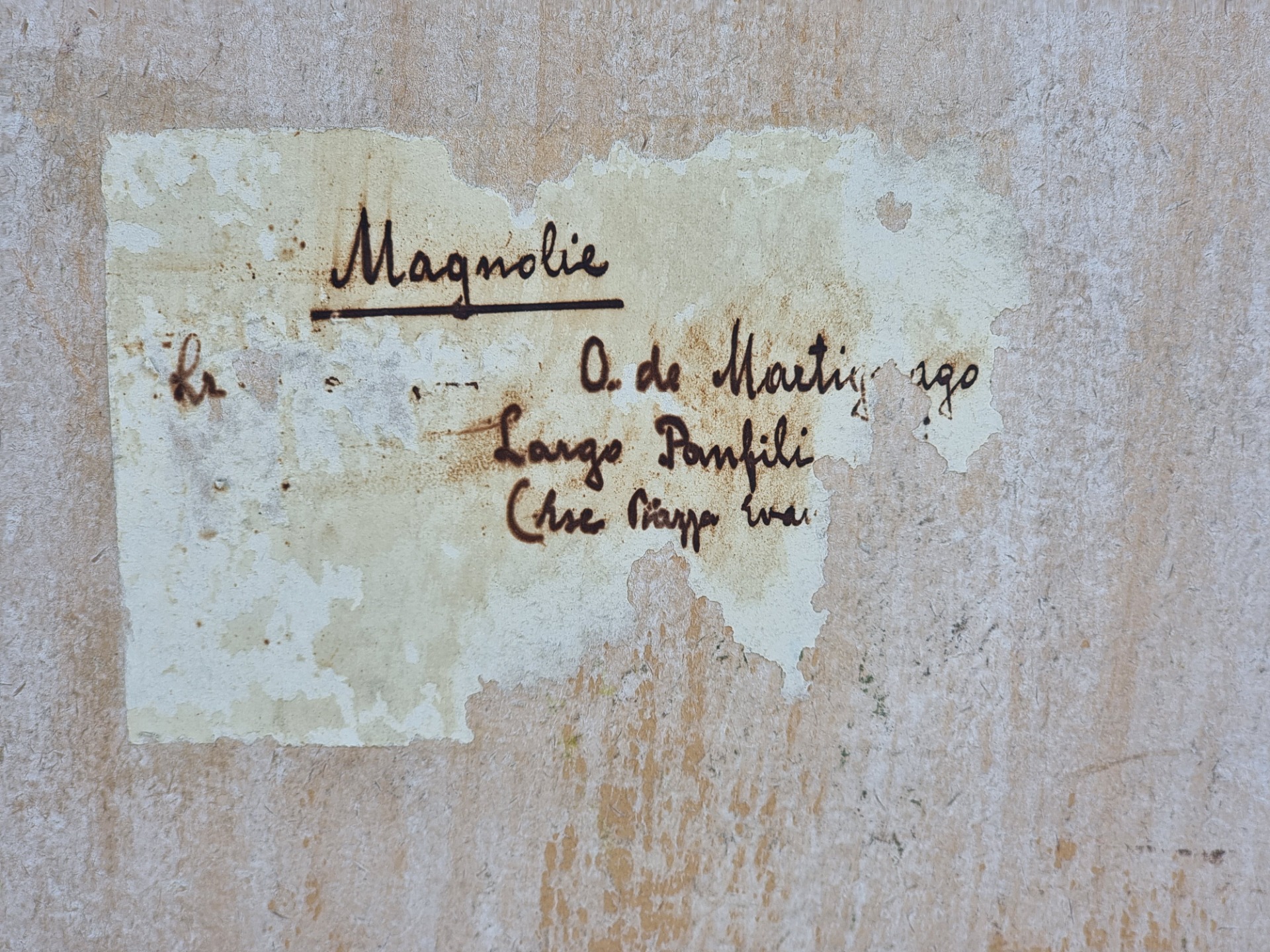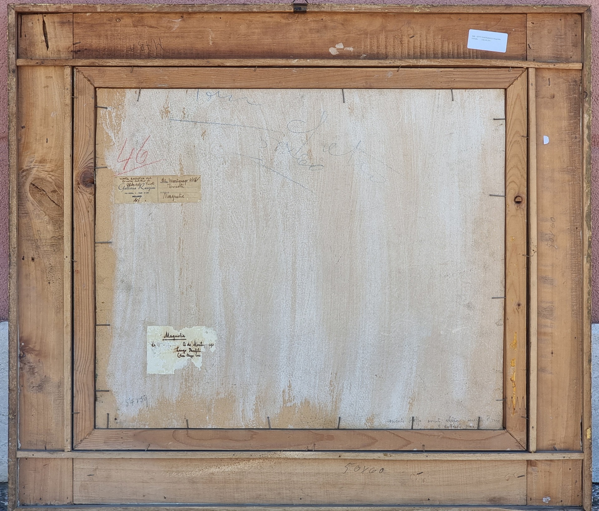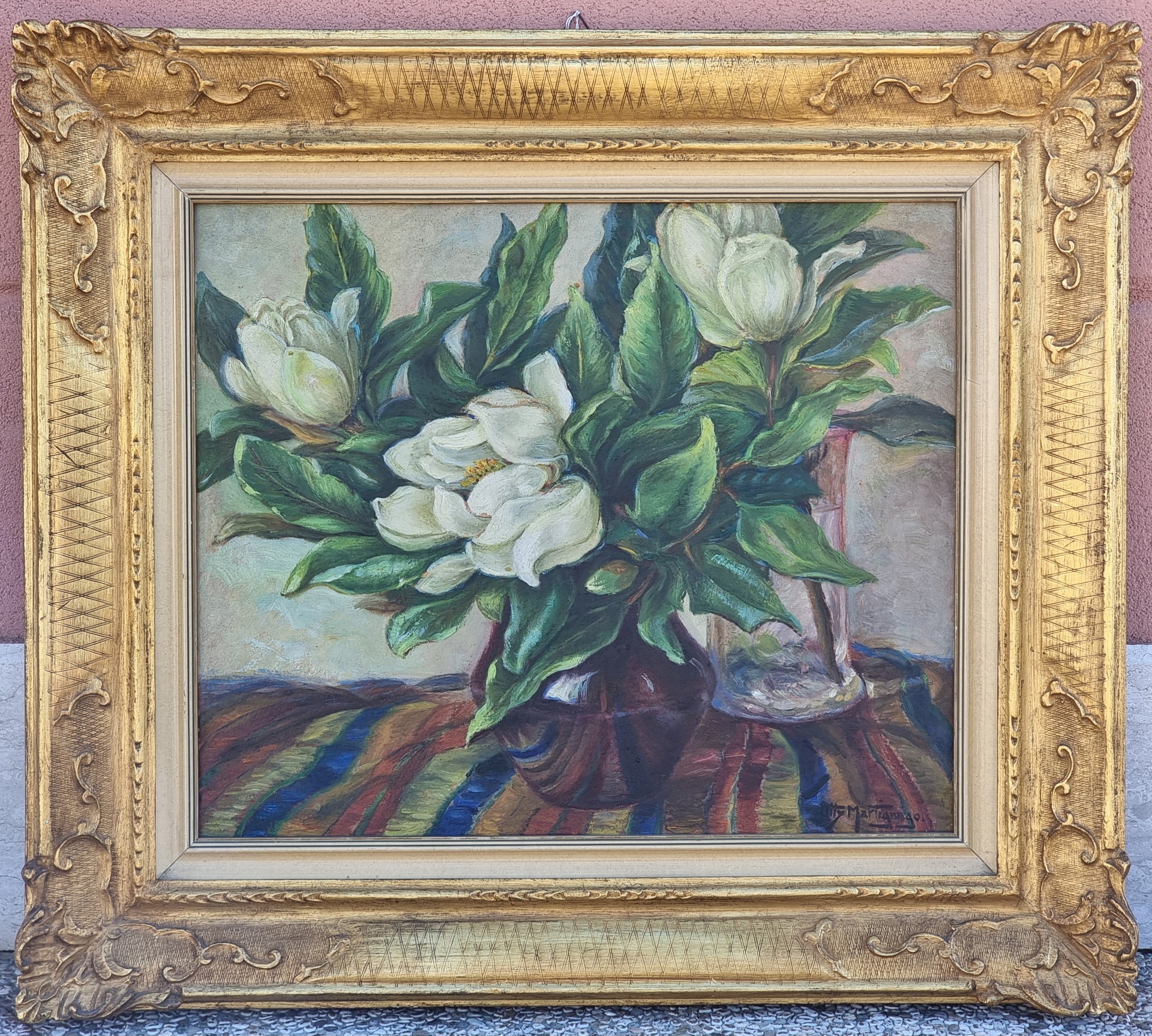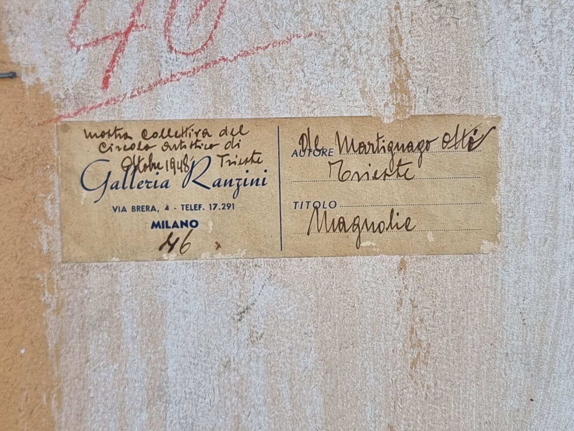 Olio su cartone pressato raffigurante un ricco mazzo di magnolie, firmato e datato in basso a destra “Martignago Otti, 1948”.Opera corredata sul retro da etichette originali della Galleria Ranzini di Milano, che attestano la partecipazione alla mostra collettiva del Circolo Artistico tenutasi in Via Brera, ottobre 1948. La composizione mette in risalto i candidi fiori di magnolia in un vaso, accompagnati da un vivace tappeto policromo che crea un forte contrasto cromatico. L’opera conserva una cornice coeva di buona fattura, probabilmente ridorata. Tecnica: olio su cartone pressatoDimensioni: 59 × 49,5 cm (senza cornice)Epoca: 1948Cornice: presente, d’epoca Per ulteriori informazioni, fotografie ad alta risoluzione o dettagli tecnici, non esitate a contattarci. Spedizioni disponibili in tutto il mondo con imballaggio professionale.