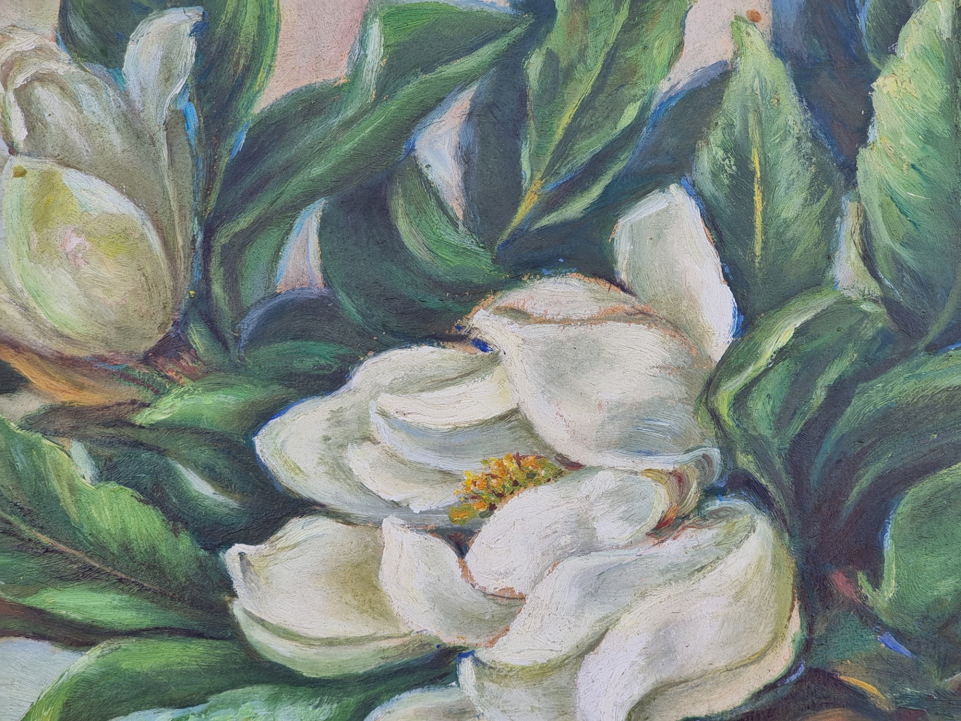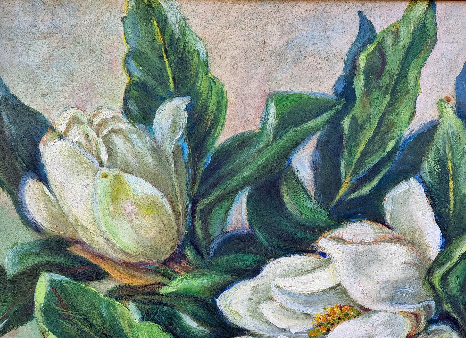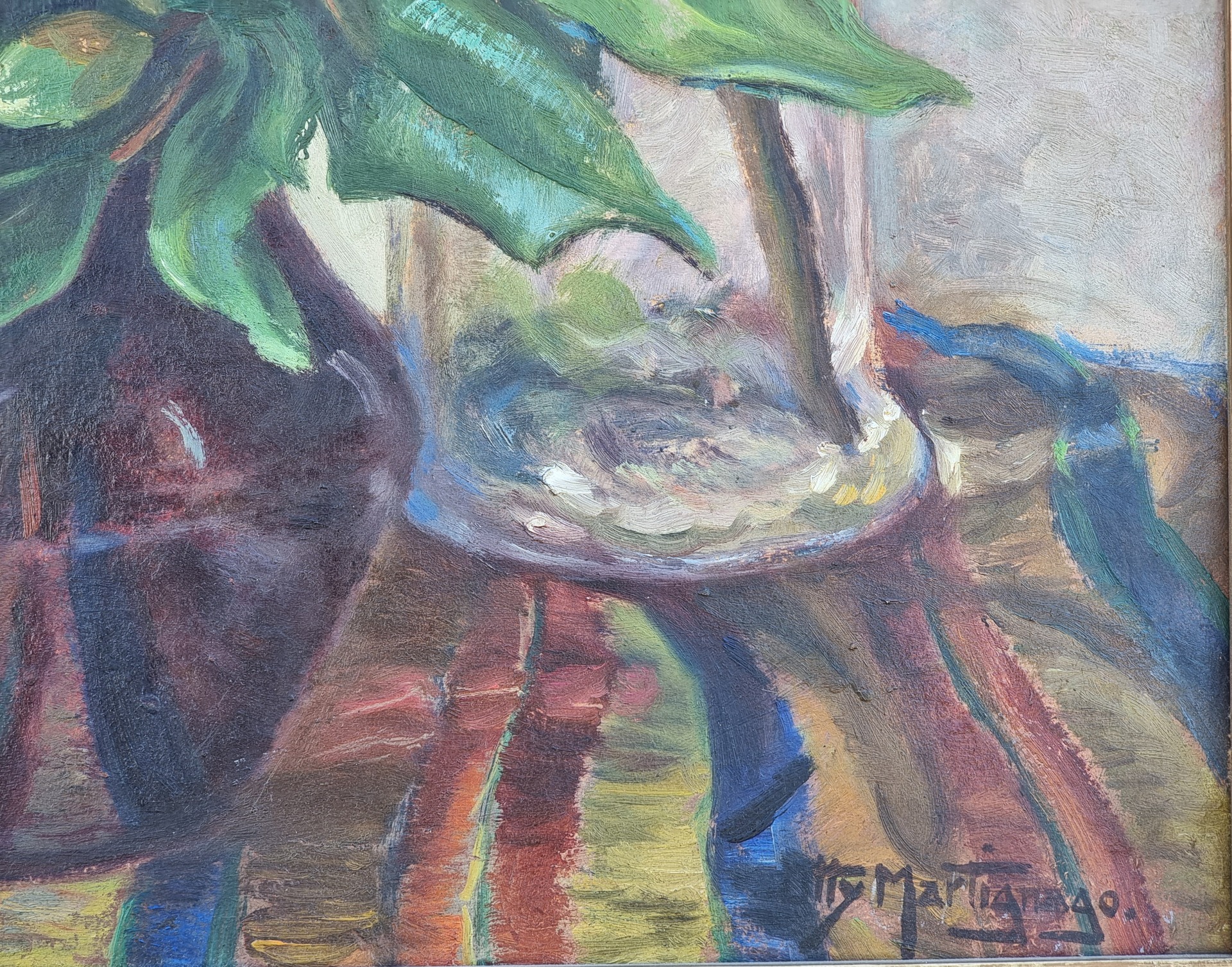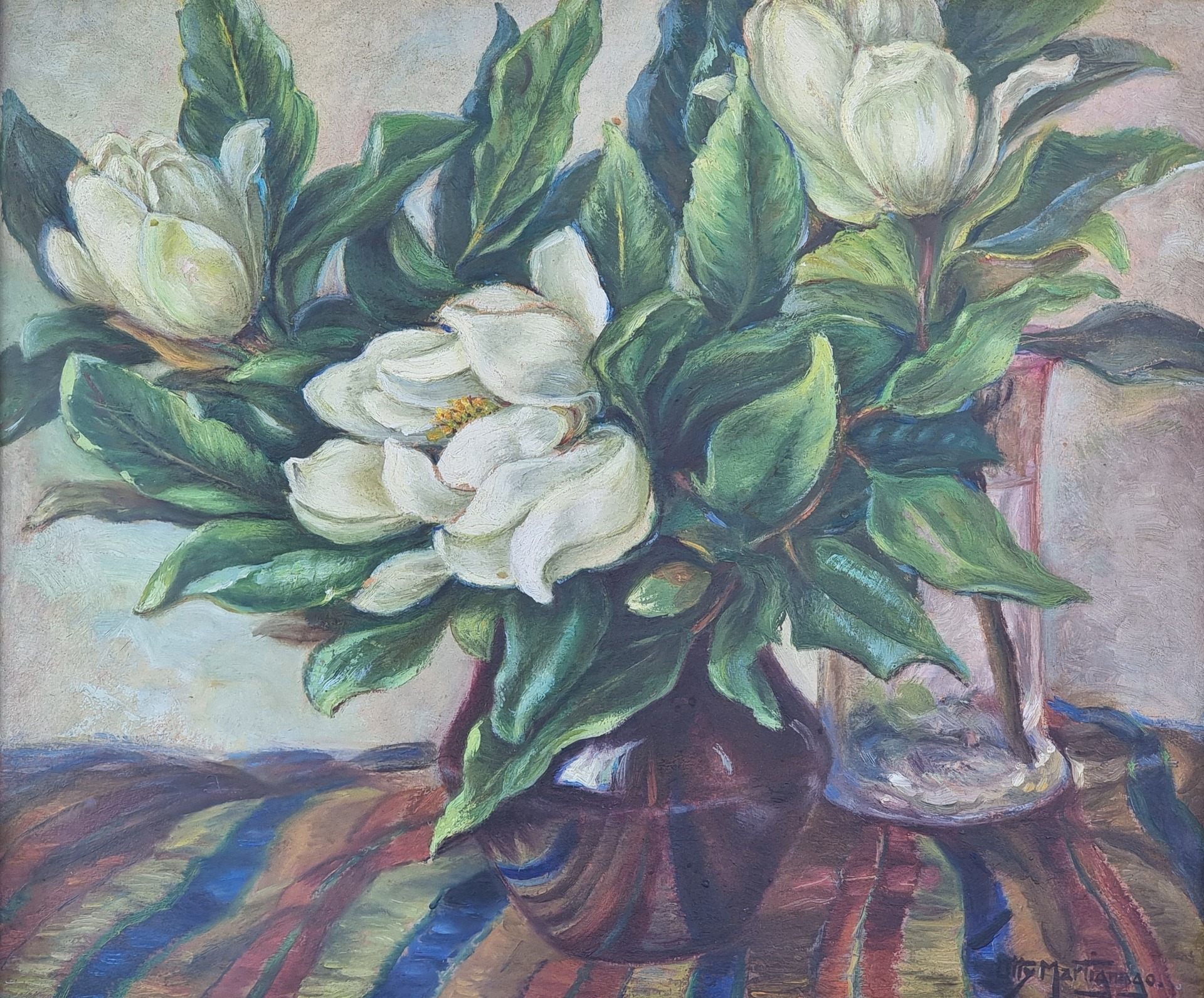 Olio su cartone pressato raffigurante un ricco mazzo di magnolie, firmato e datato in basso a destra “Martignago Otti, 1948”.Opera corredata sul retro da etichette originali della Galleria Ranzini di Milano, che attestano la partecipazione alla mostra collettiva del Circolo Artistico tenutasi in Via Brera, ottobre 1948. La composizione mette in risalto i candidi fiori di magnolia in un vaso, accompagnati da un vivace tappeto policromo che crea un forte contrasto cromatico. L’opera conserva una cornice coeva di buona fattura, probabilmente ridorata. Tecnica: olio su cartone pressatoDimensioni: 59 × 49,5 cm (senza cornice)Epoca: 1948Cornice: presente, d’epoca Per ulteriori informazioni, fotografie ad alta risoluzione o dettagli tecnici, non esitate a contattarci. Spedizioni disponibili in tutto il mondo con imballaggio professionale.