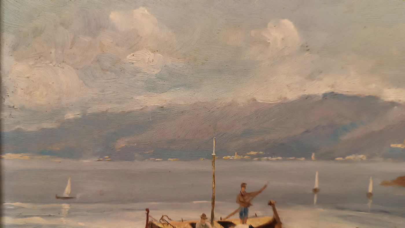 Grazioso dipinto ad olio su tavoletta lignea, inserito in una cornice di legno intagliato e dipinto. Nel dipinto è raffigurata una veduta paesaggistica con mare e montagne, dalla quale si intravede una marina con una città nelle vicinanze, probabilmente la marina di Pizzo Calabro, che richiama le origini calabresi del pittore. In mare si distinguono diverse barche a vela, tra cui due in primo piano con personaggi intenti a pescare. Si tratta di un quadro di grande gusto, apprezzabile per la sua resa stilistica e la scelta dei colori, in grado di donare un tocco di eleganza e classe a qualsiasi ambiente. In basso a destra è presente la firma del pittore italiano, Saverio Scutellà (1910-1993), con la data apposta sul retro da inquadrare intorno alla prima metà del XX secolo (1947 ca.). Misure: H x L x P complessive 39 x 64 x 3.5cm; H x L solo opera 25 x 50cm