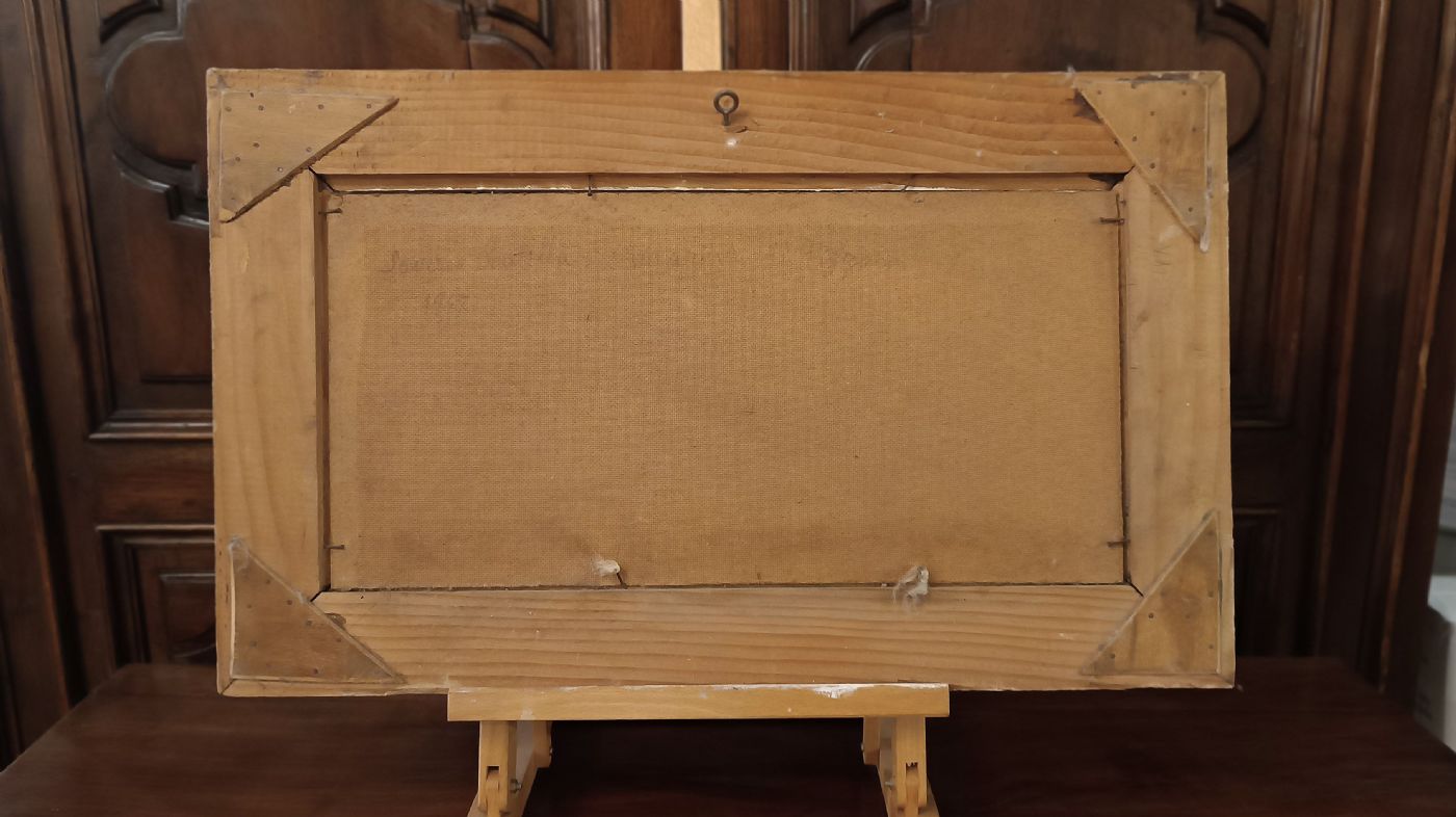 Grazioso dipinto ad olio su tavoletta lignea, inserito in una cornice di legno intagliato e dipinto. Nel dipinto è raffigurata una veduta paesaggistica con mare e montagne, dalla quale si intravede una marina con una città nelle vicinanze, probabilmente la marina di Pizzo Calabro, che richiama le...
