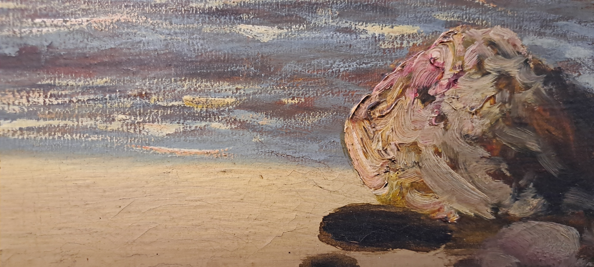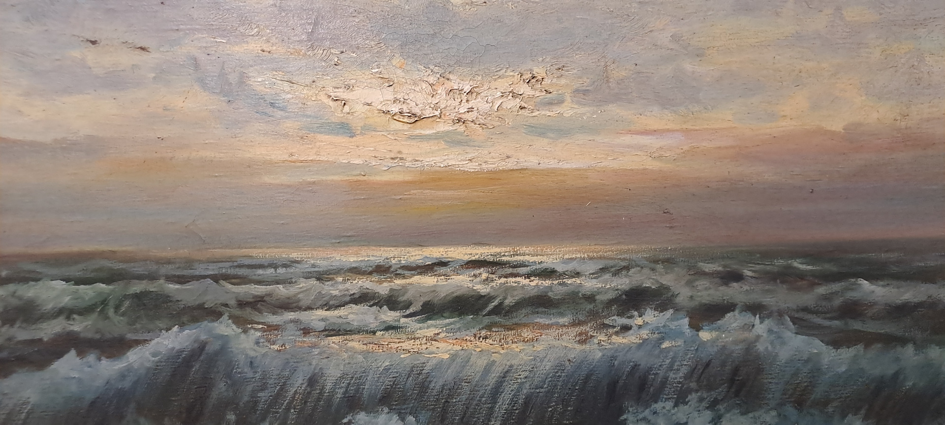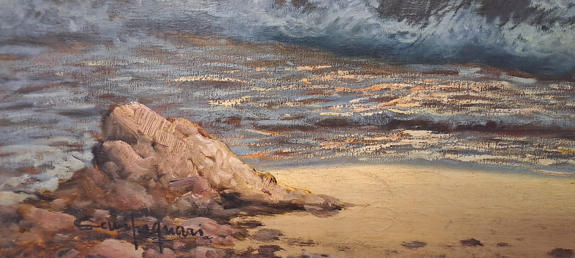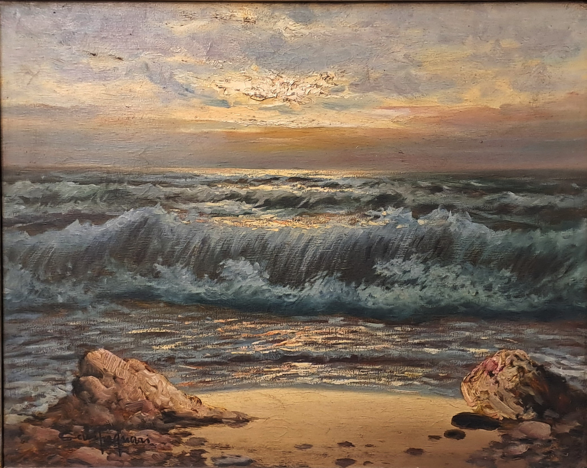 Proponiamo un'opera suggestiva e vibrante del noto pittore italiano Licinio Campagnari, sebbene l'artista sia più celebre per i suoi paesaggi alpini della Val d'Aosta, questo dipinto marino ne rivela la versatilità e l'abilità nel catturare la potenza della natura.