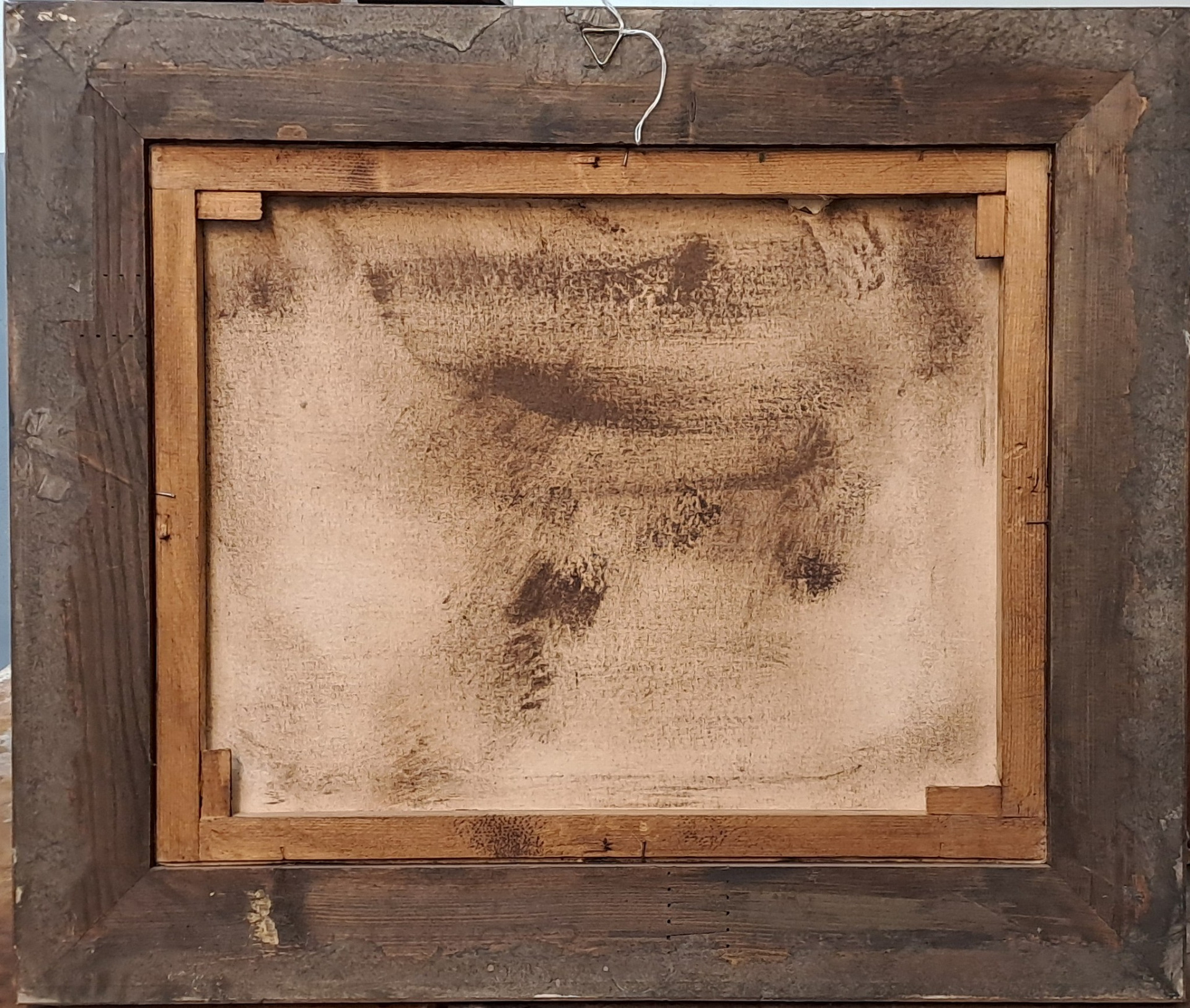 Il retro del dipinto mostra il telaio originale e l'usura del tempo, confermando l'autenticità e l'epoca dell'opera.