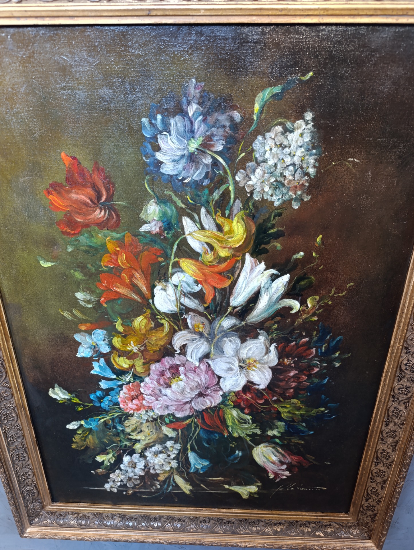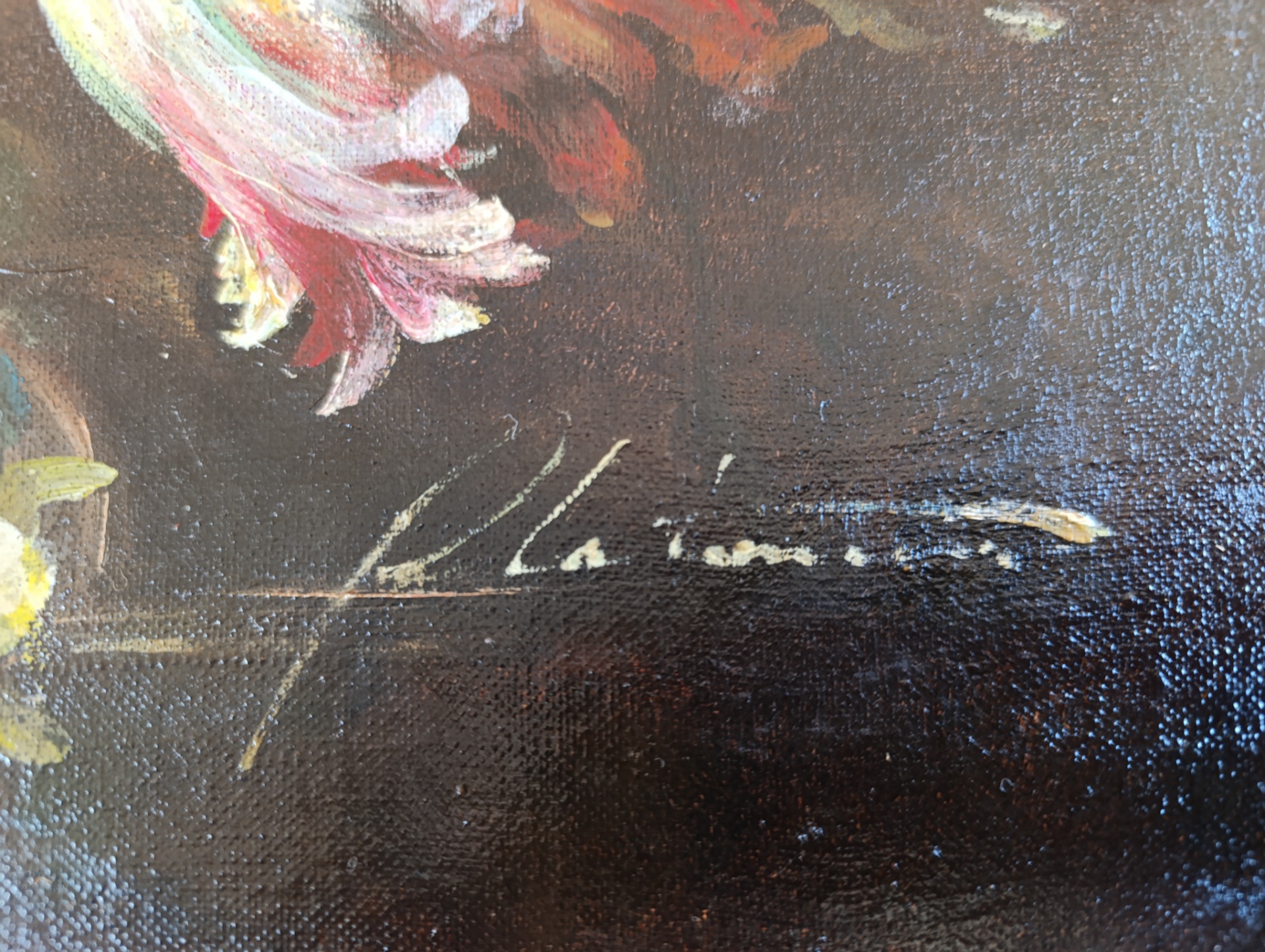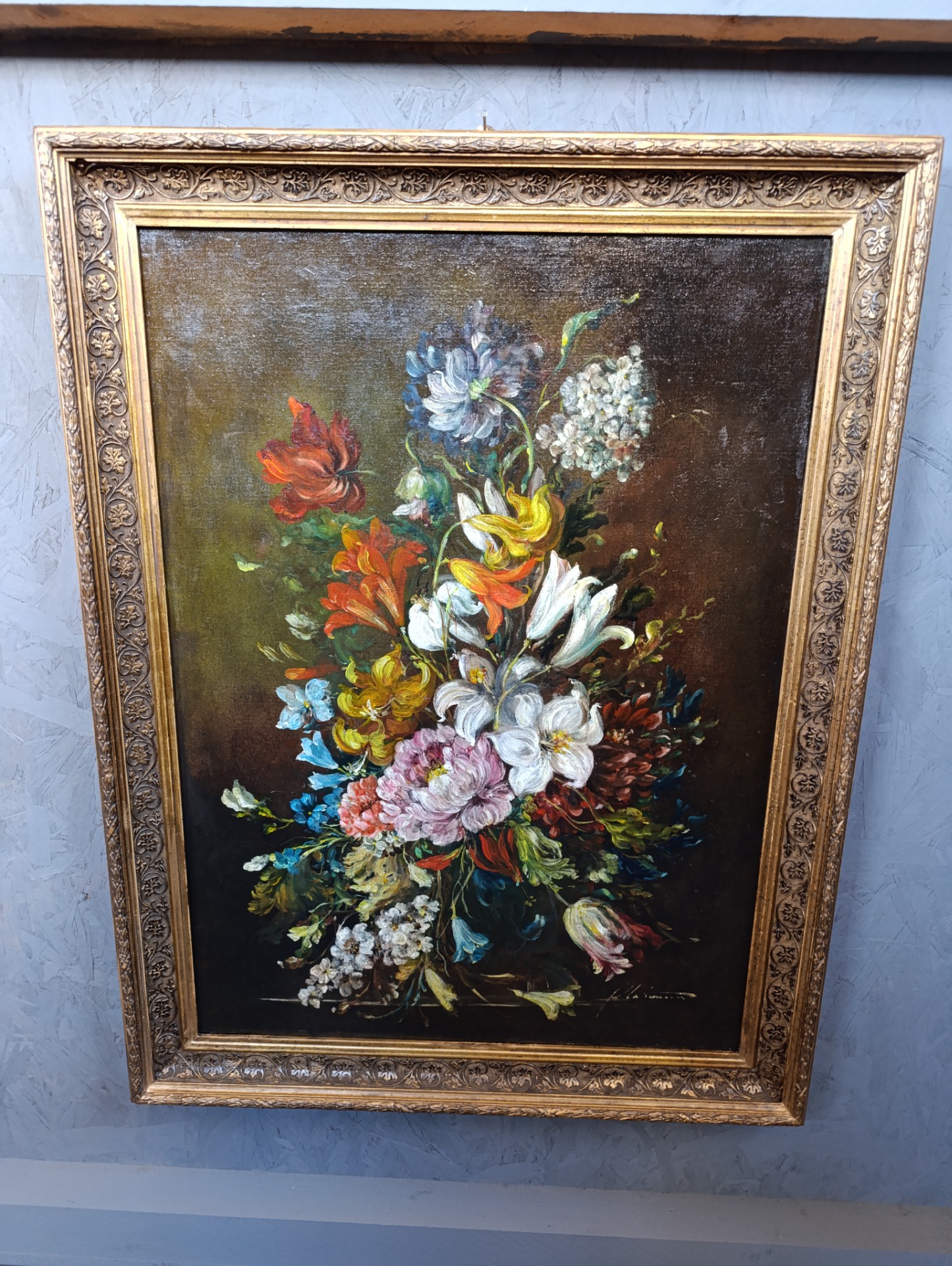 Dipinto con fiori primi 900 firmato.La tela è stata stesa su cartoncino. Cornice coeva Misure cornice 65x85 Siamo a vostra disposizione per foto o domande