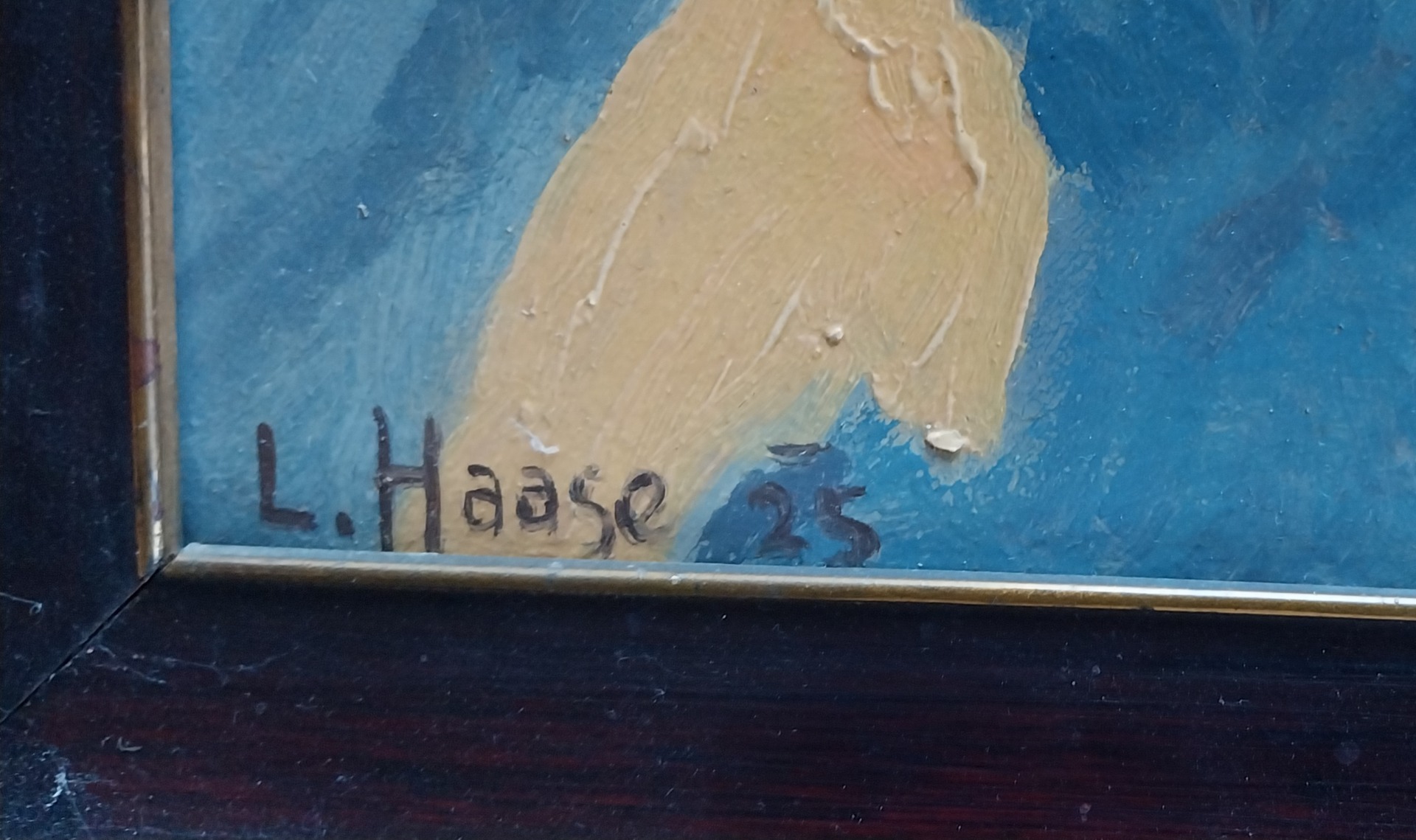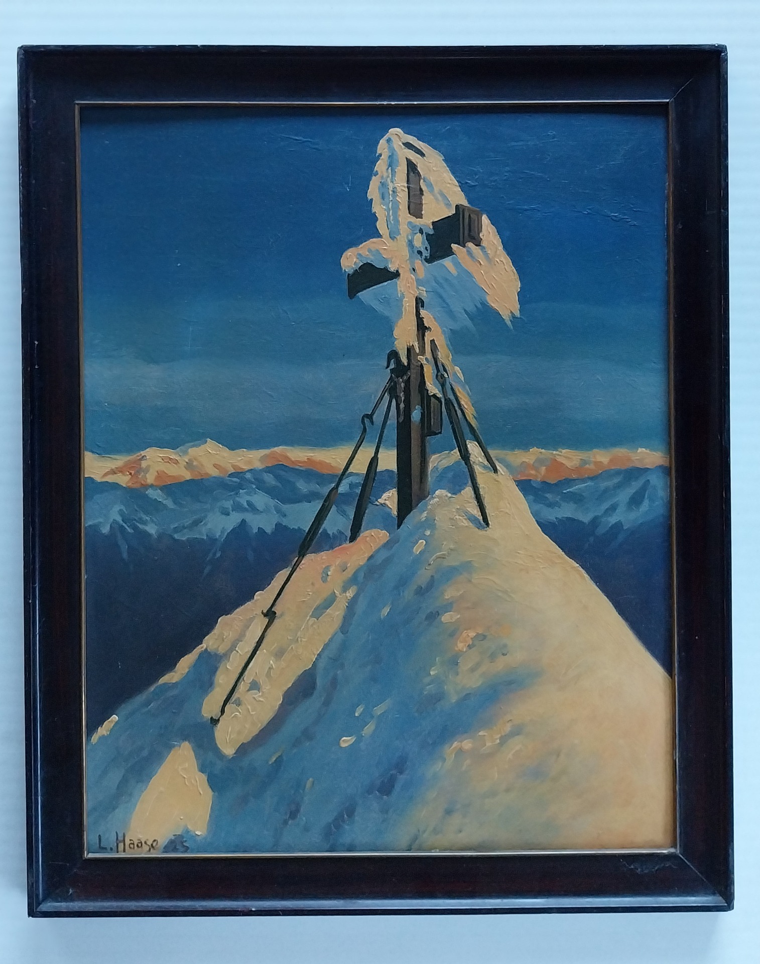 Particolare dipinto raffigurante la croce innevata. La luce calda dell' tramono ha un effetto speciale. Ela penellata e ` molto sicura e netta. Olio su cartoncino con cornice 56 x 46 cm.Firmato e datato in basso a sx Haase 25