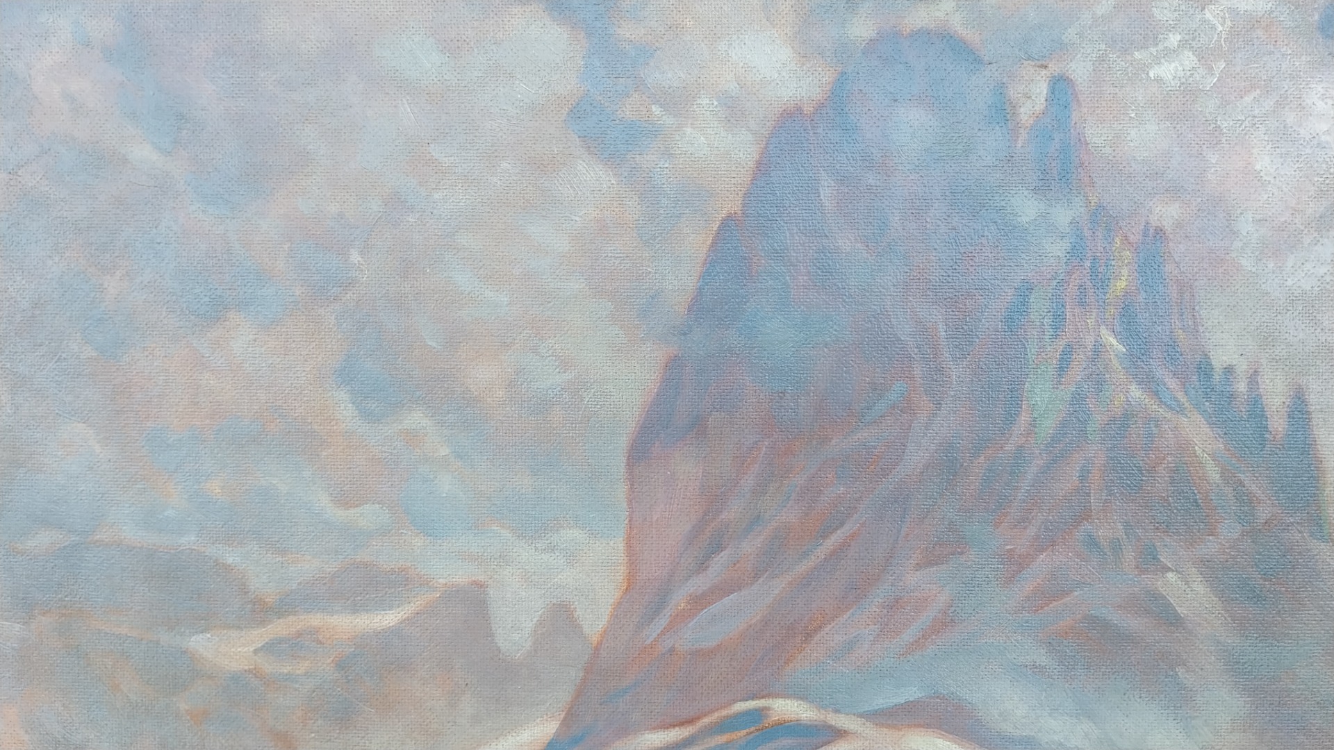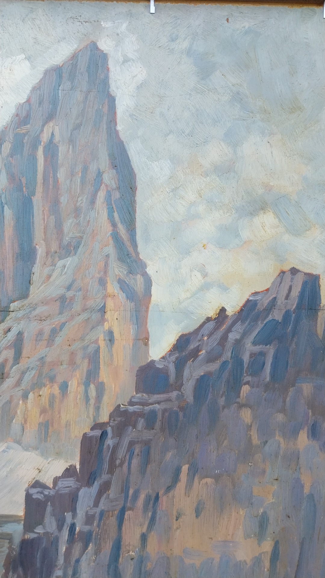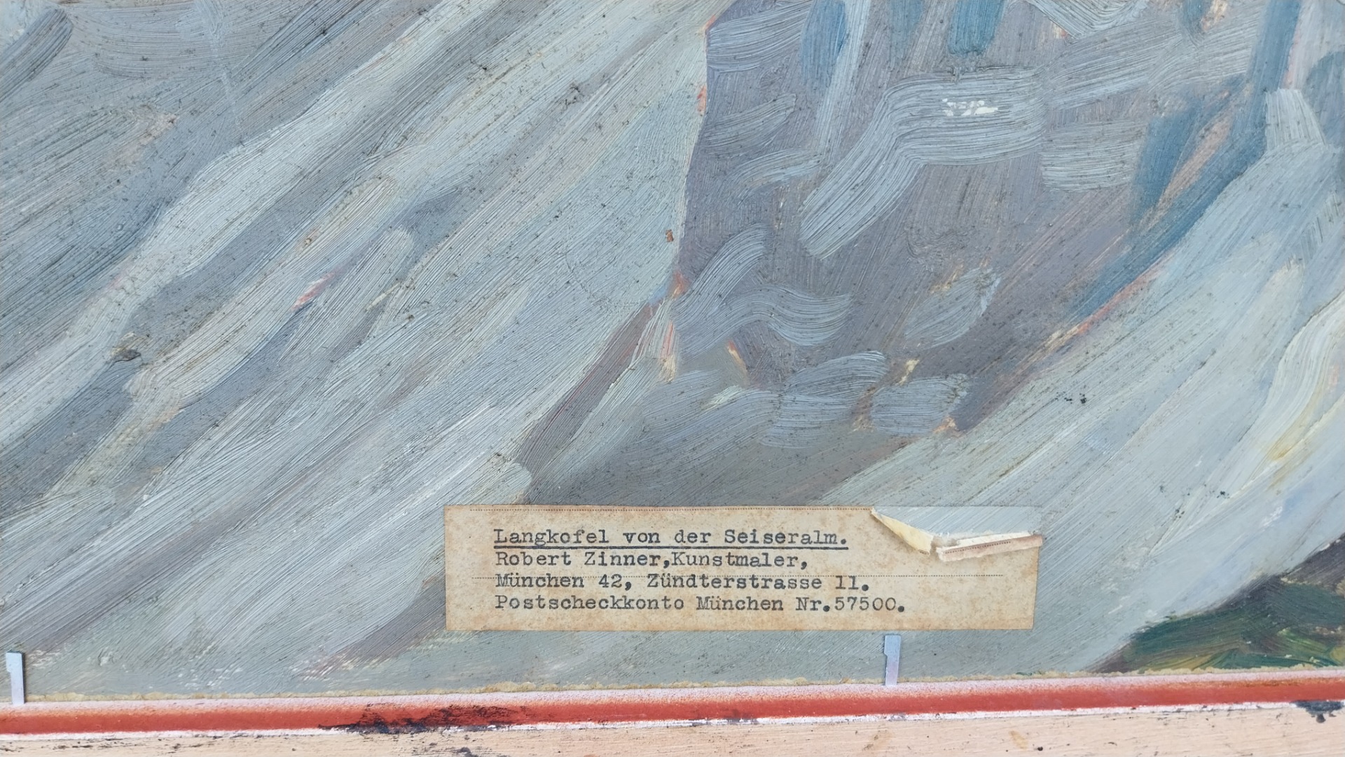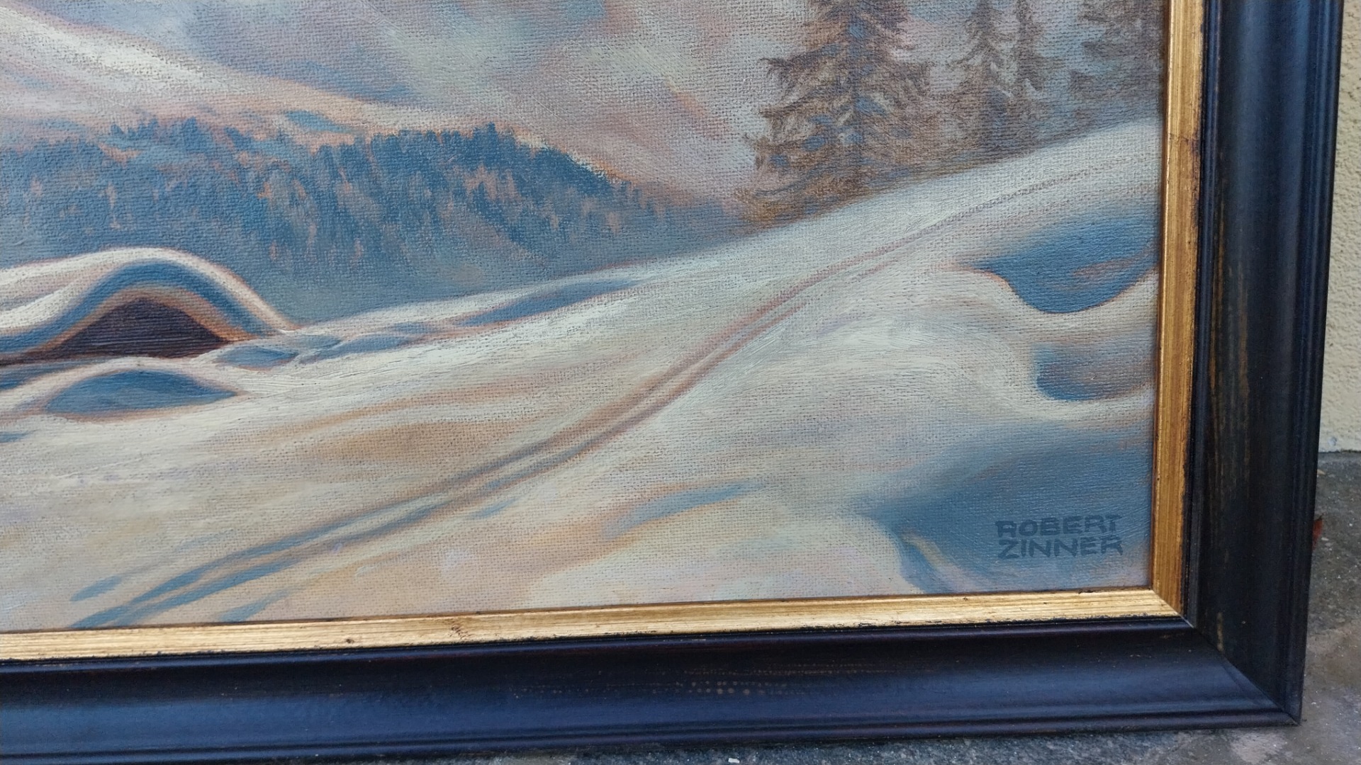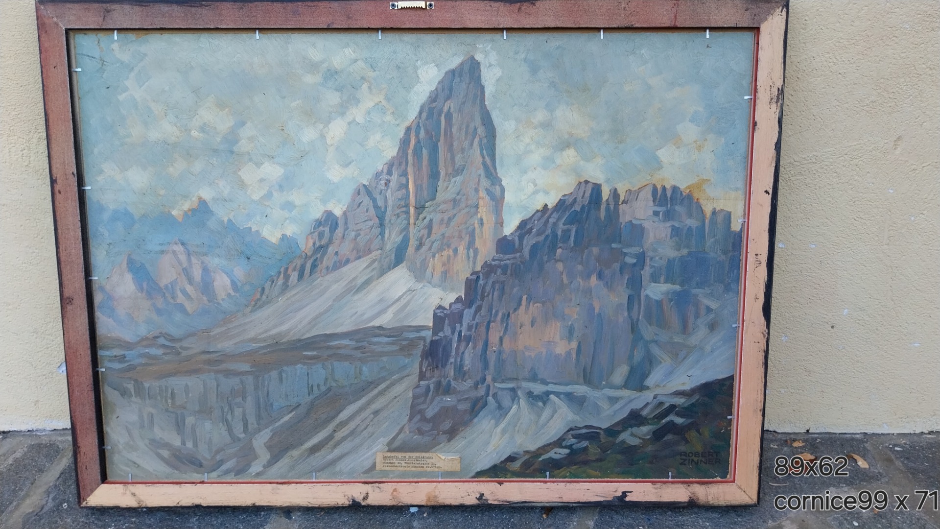 Veduta invernale dell Sassolungo. Dipinto di grande atmosfera e impressione. Opera dell pittore viennese Robert Zinner ( 1904 - 1988).Artista che ha fatto diverse vedute dolomitiche. Sul retro dell quadro altro dipinto , secondo me veduta verso tre cime di lavaredo. Opera realizzata verso gli anni 50.
