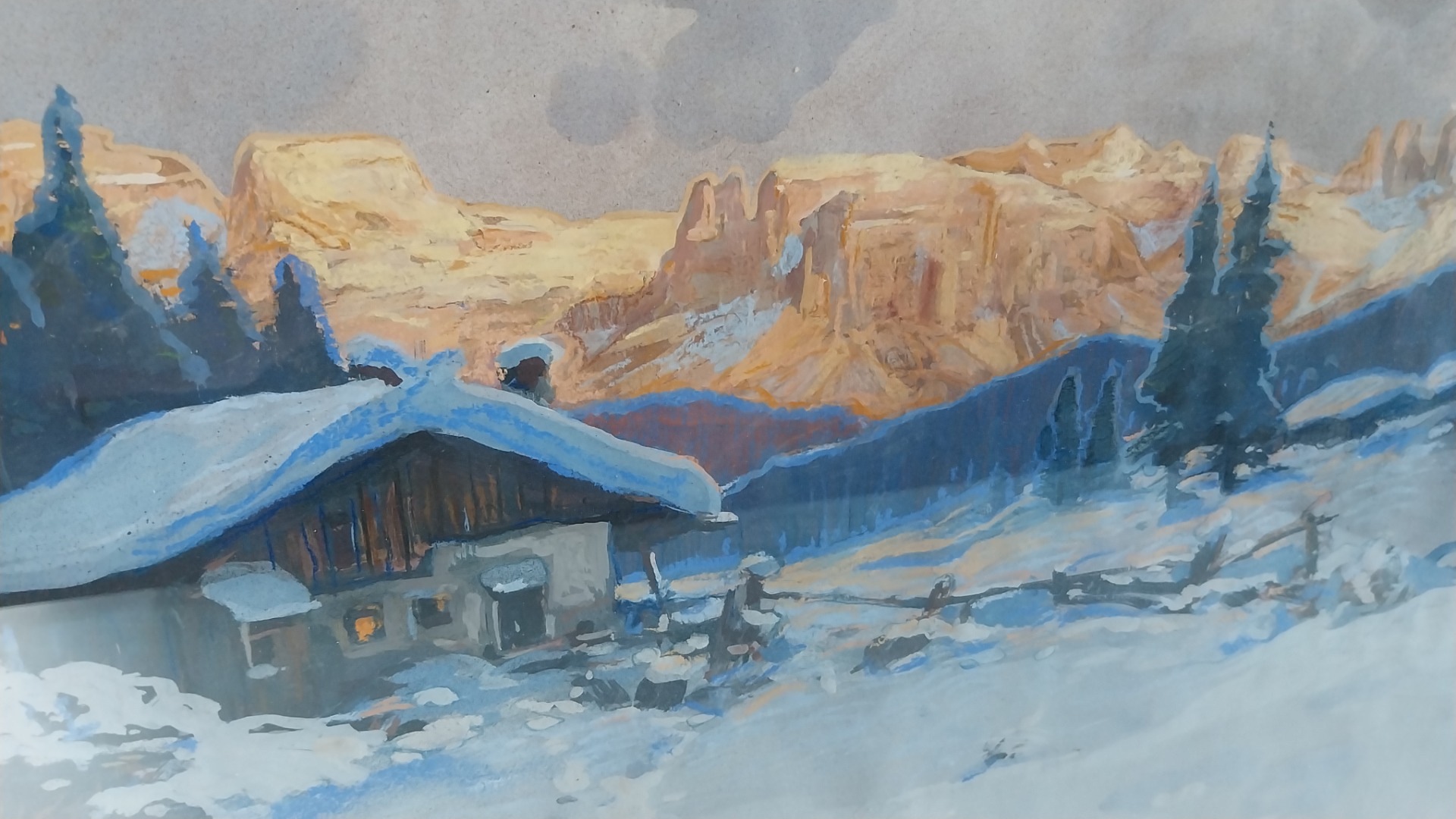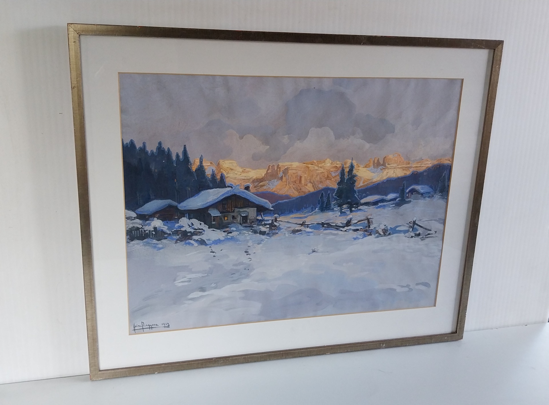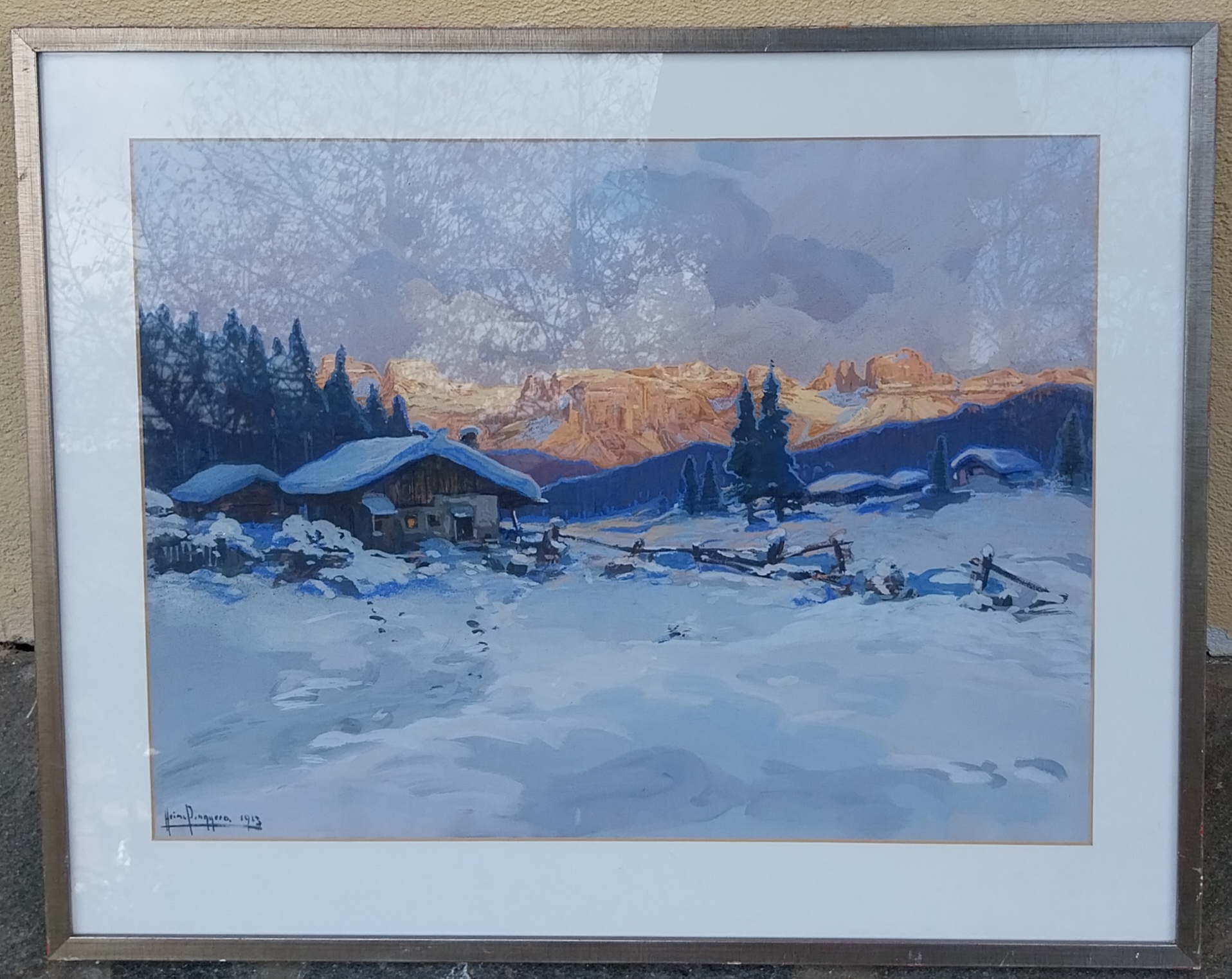Definisco di grande atmosfera la pittura dell pittore altoatesino Heinz Pinggera. L` opere emane una grande senso di tranquillita. Il tramonto ha una dinamica particolare e l'effetto invernale e notevole. Opera firmata in basso a sx e datata 1913.Nella veduta vediamo le cime dolomiticje quale il catinaccio con le torri dell Vajolet , lo Sciliar ed il Sasso Piatto con in parte il Sassolungo.