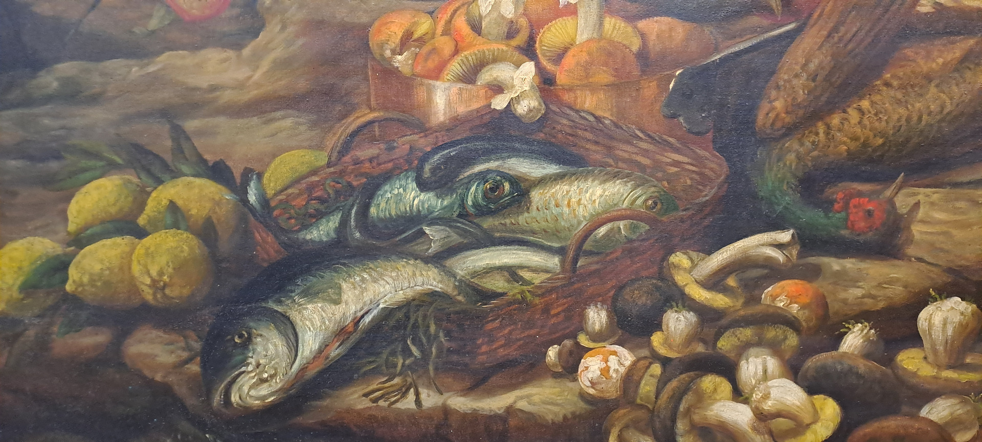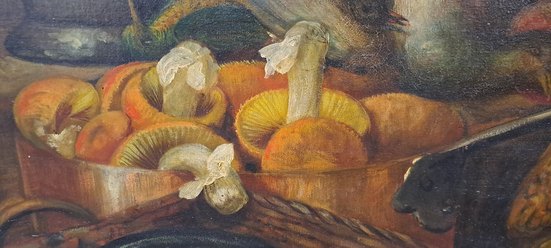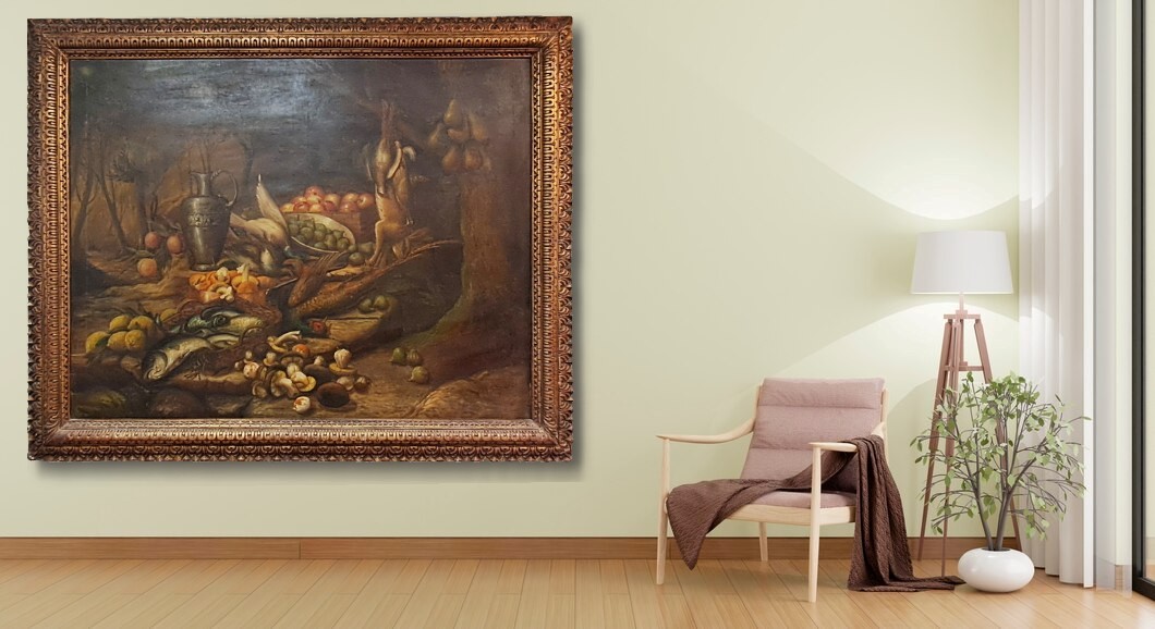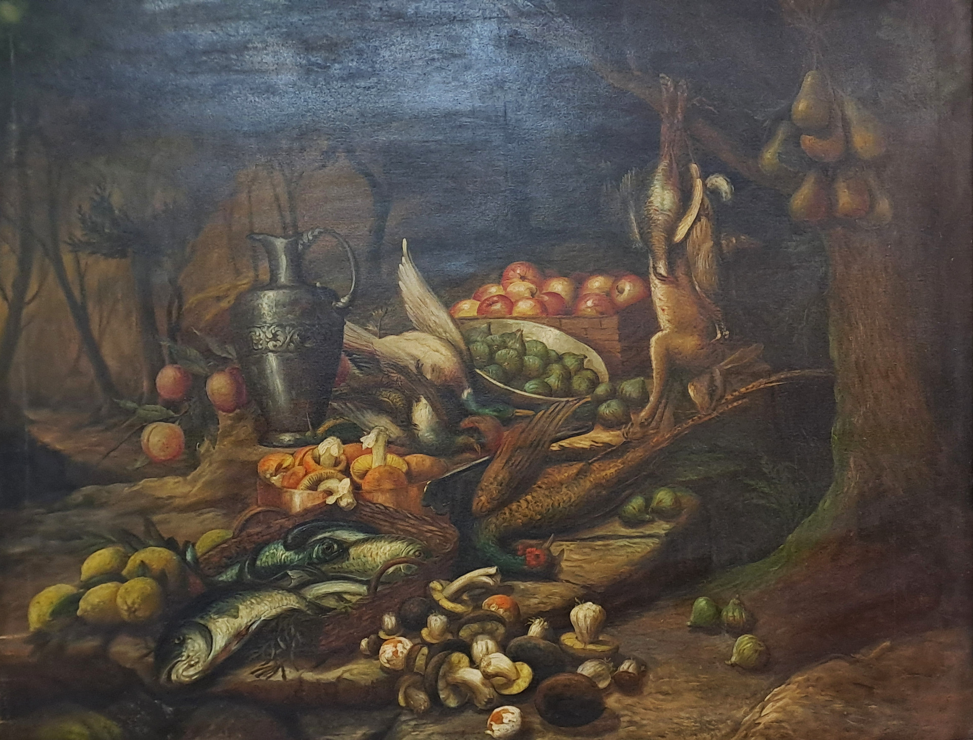 Stile e Tecnica Pittorica: Il dipinto mostra una notevole padronanza della tecnica ad olio, con una pennellata ricca e materica che rende con efficacia le diverse texture: la morbidezza delle piume degli uccelli, la brillantezza delle squame dei pesci, la carnosità della frutta e la rugosità dei funghi. L'artista dimostra un'attenta osservazione dei dettagli naturalistici e una capacità di rendere la luce e le ombre, creando volumi e profondità. I colori sono terrosi e profondi, con accenti di rosso, giallo e verde che vivacizzano la palette. La luce sembra provenire dall'alto a sinistra, illuminando i soggetti principali e creando un chiaroscuro che accentua la tridimensionalità.
