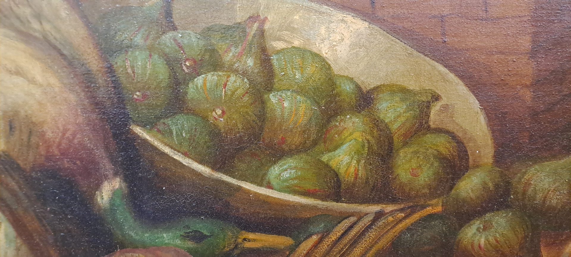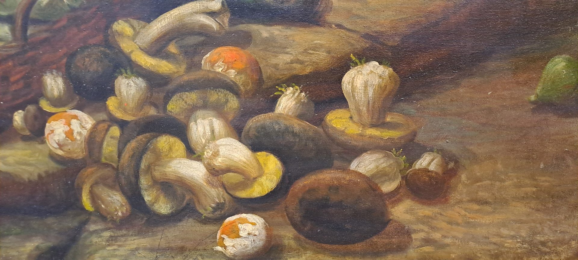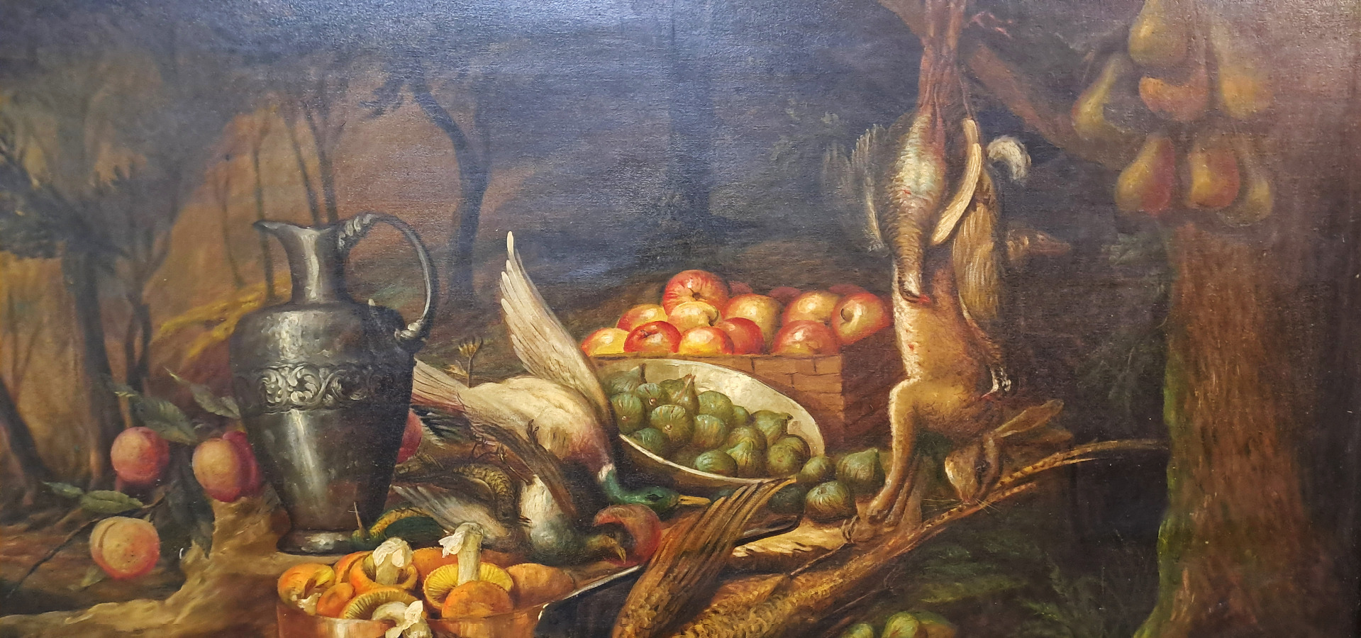 Stile e Tecnica Pittorica: Il dipinto mostra una notevole padronanza della tecnica ad olio, con una pennellata ricca e materica che rende con efficacia le diverse texture: la morbidezza delle piume degli uccelli, la brillantezza delle squame dei pesci, la carnosità della frutta e la rugosità dei funghi. L'artista dimostra un'attenta osservazione dei dettagli naturalistici e una capacità di rendere la luce e le ombre, creando volumi e profondità. I colori sono terrosi e profondi, con accenti di rosso, giallo e verde che vivacizzano la palette. La luce sembra provenire dall'alto a sinistra, illuminando i soggetti principali e creando un chiaroscuro che accentua la tridimensionalità.