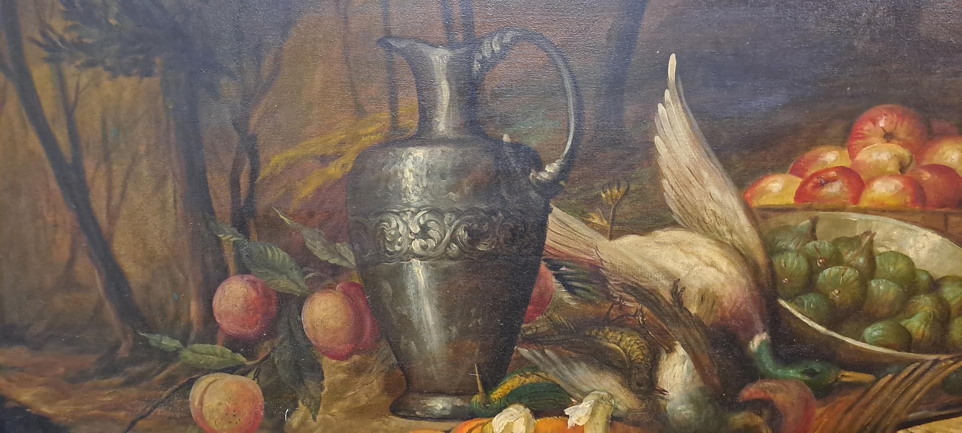 Soggetto e Composizione: Il dipinto raffigura una ricca e opulenta scena di natura morta ambientata in un paesaggio boschivo , con un'atmosfera che richiama la tradizione pittorica fiamminga e olandese del XVII secolo. La composizione è complessa e bilanciata, disposta su più piani e con una notevole profondità.