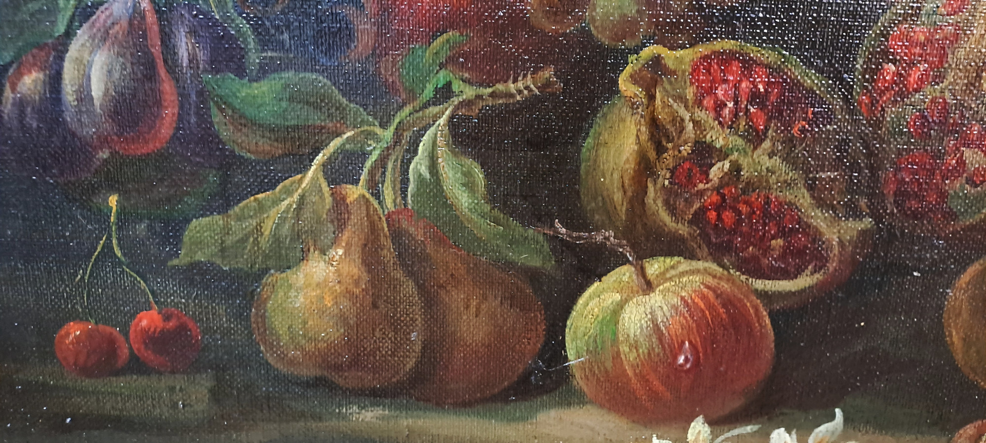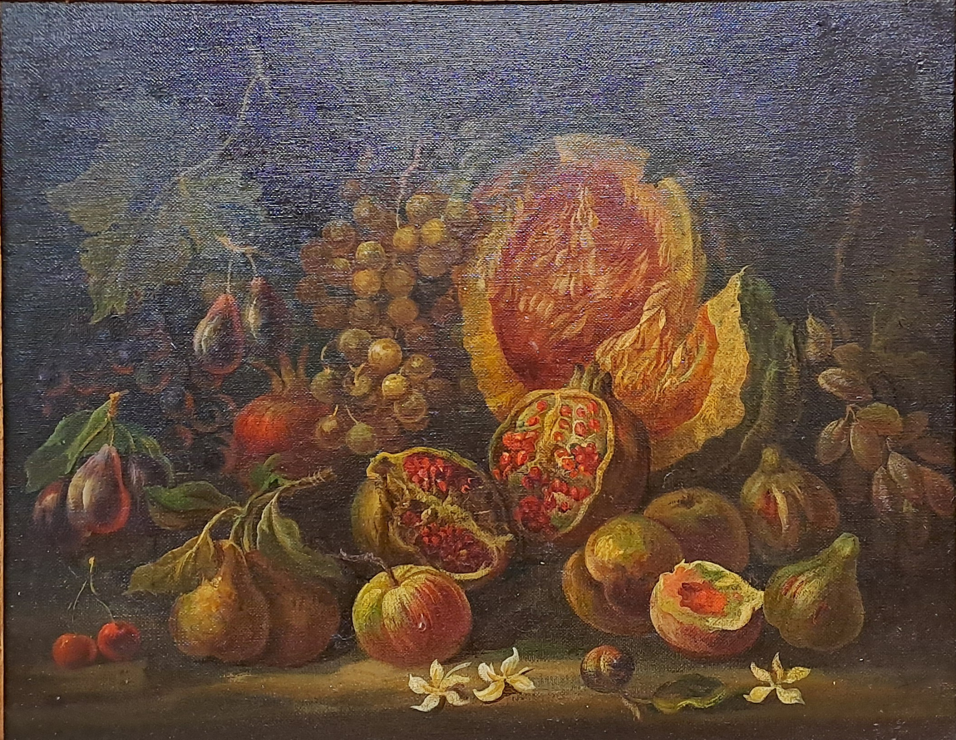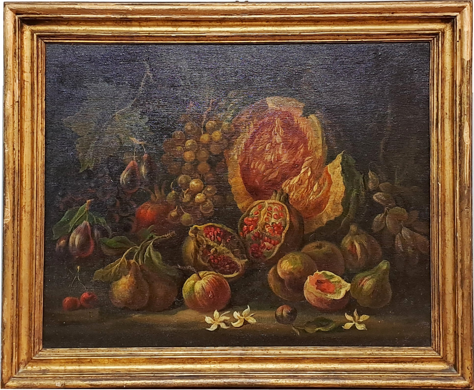 Dipinto ad olio su tela raffigurante una natura morta.La composizione raffigura varie tipologie di frutti tra le quali si riconoscono la zucca, il melograno, i fichi, l' uva, le pere e le ciliegie.