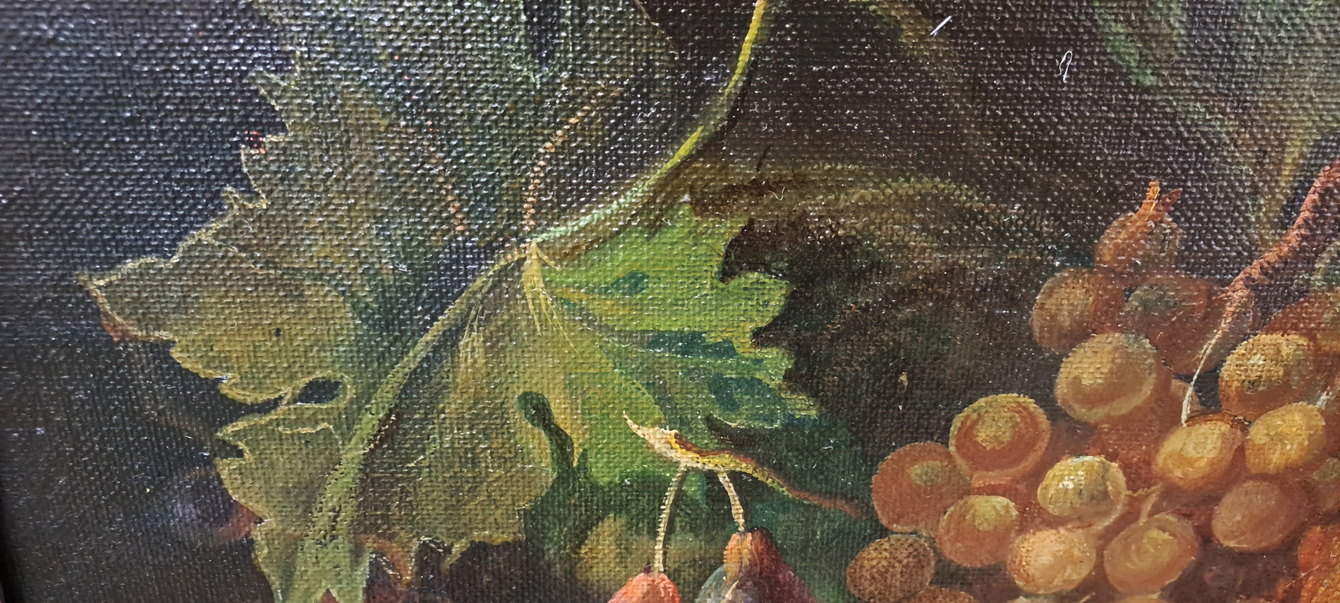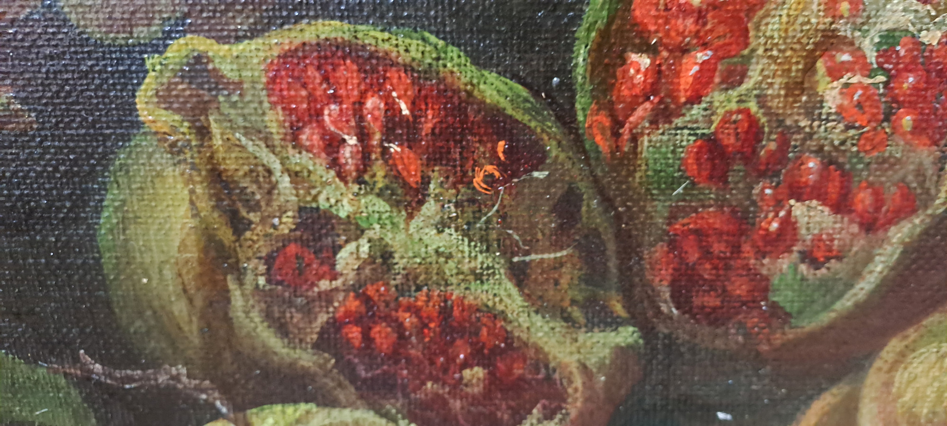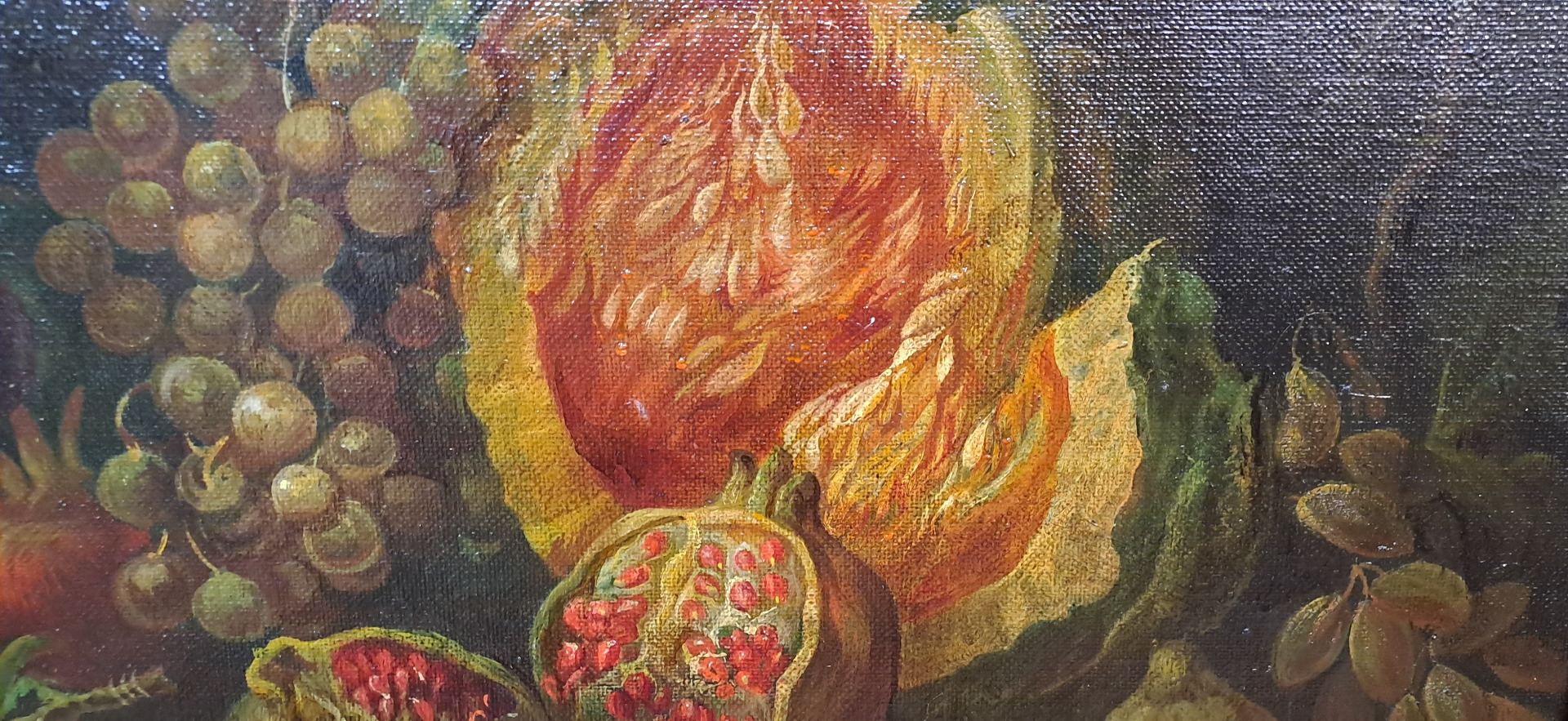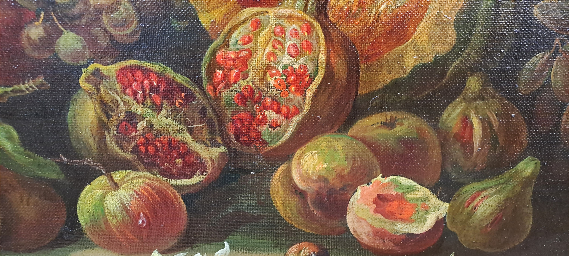 Dipinto ad olio su tela raffigurante una natura morta.La composizione raffigura varie tipologie di frutti tra le quali si riconoscono la zucca, il melograno, i fichi, l' uva, le pere e le ciliegie.