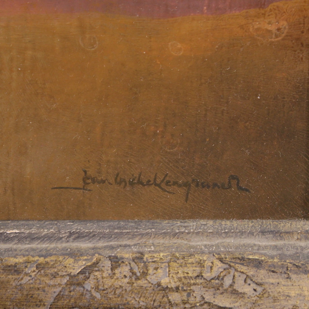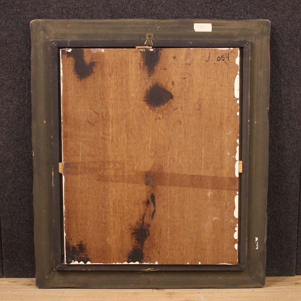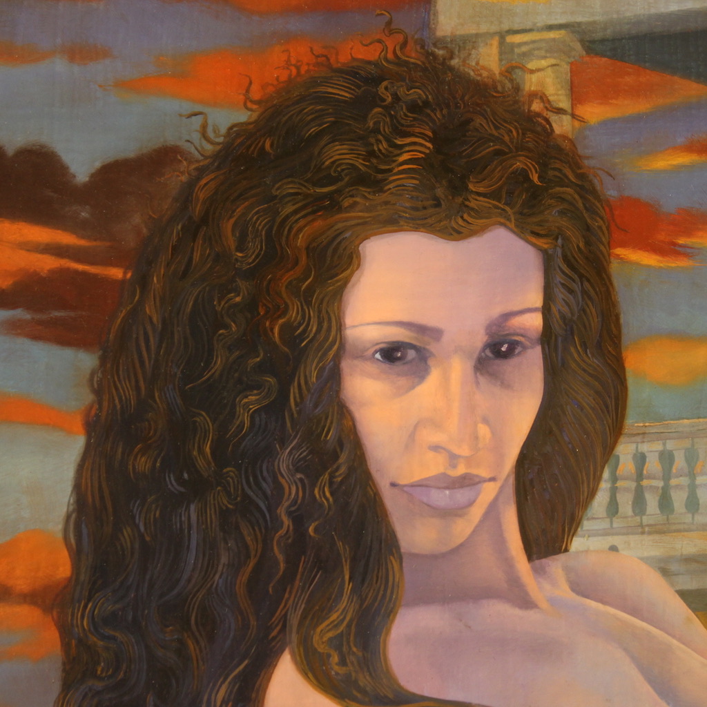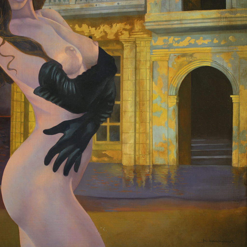 Dipinto francese della fine del XX secolo. Opera olio su tavola raffigurante nudo femminile, ragazza sensuale con paesaggio di fantasia di gusto metafisico, di buona mano pittorica. Cornice lignea moderna scolpita, cesellata e laccata di bella decorazione. Opera firmata in basso a destra (vedi foto) riferibile al pittore Jean Michel Lengrand (1955), mancante di autentica. Dipinto di bella misura e proporzione, per antiquari, arredatori e collezionisti. In buone condizioni. Luce dipinto H 58,5 x L 48,5 cm.