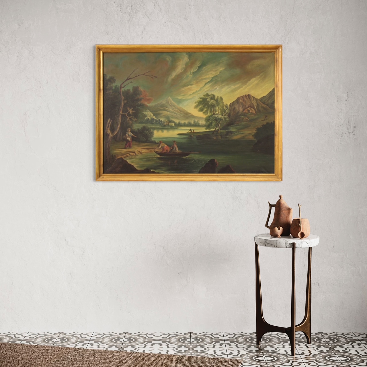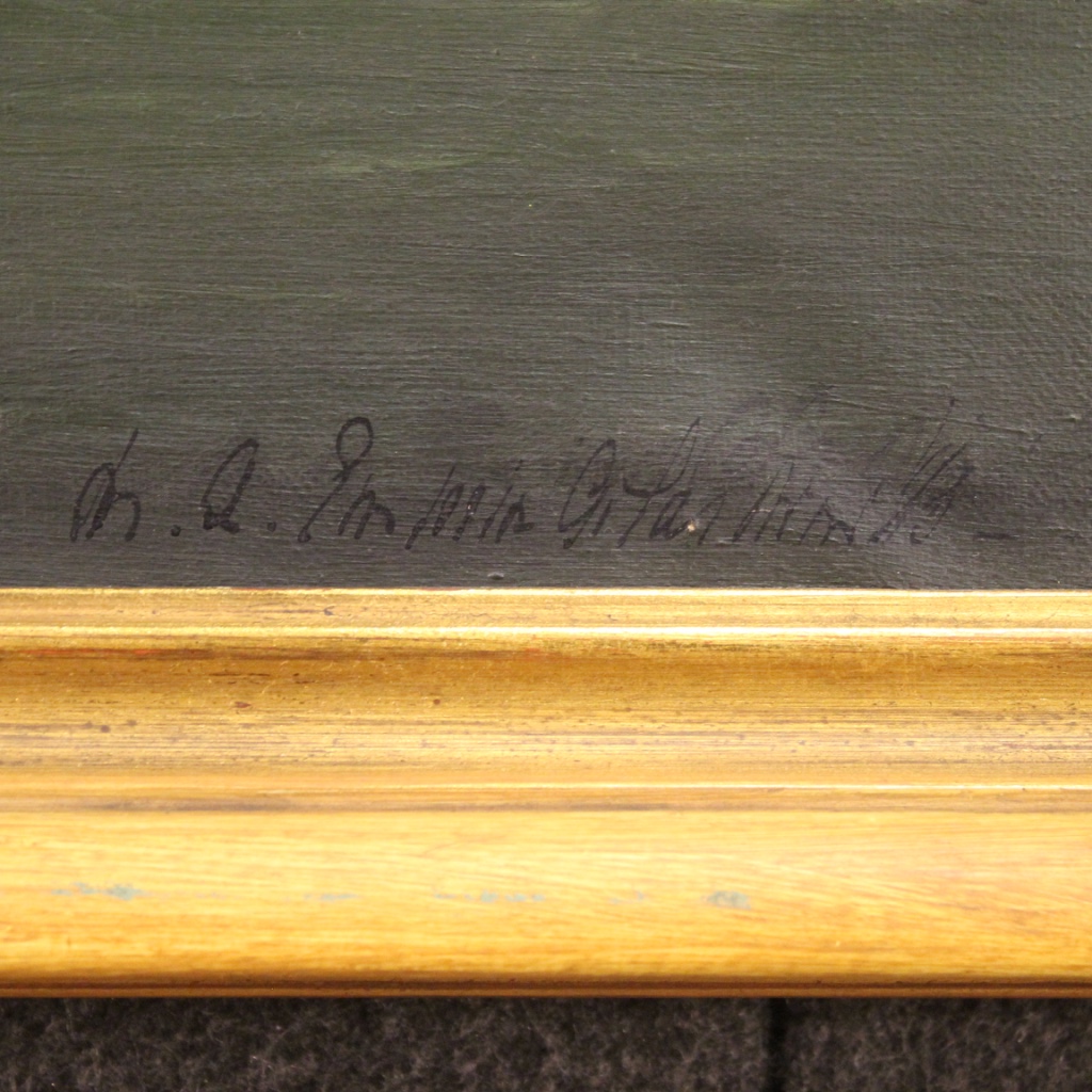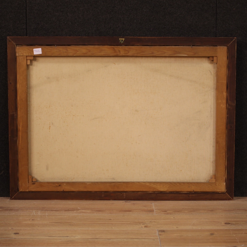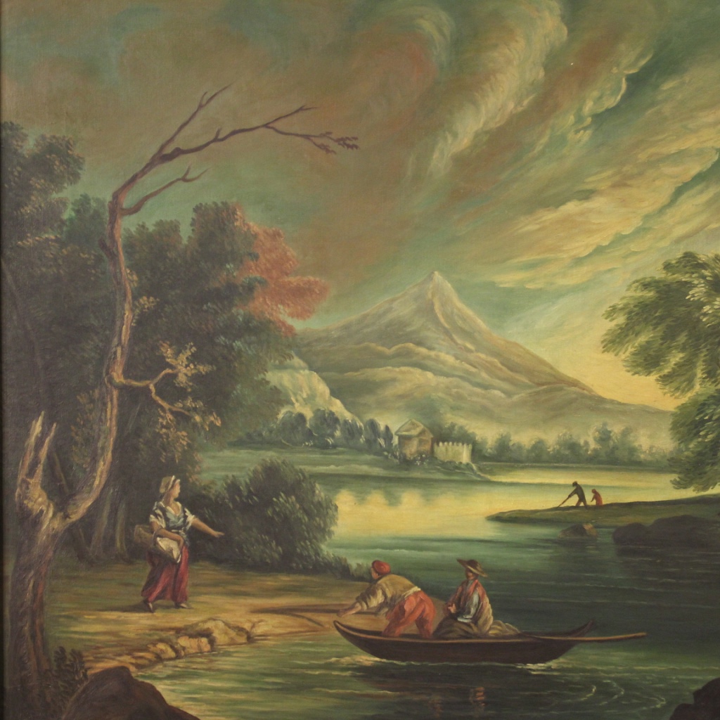 cod. 9412Dipinto italiano della seconda metà del XX secolo. Opera olio su tela raffigurante veduta di fiume con personaggi di carattere settecentesco. Dipinto firmato in basso a destra (vedi foto) in fase di studio. Quadro di bella misura e piacevole arredamento, per antiquari, arredatori e collezionisti. Cornice lignea moderna scolpita e laccata di bella decorazione. Tela che presenta due piccole cadute di colore a destra (vedi foto), facilmente restaurabili. Opera in buono stato conservativo con qualche piccolo segno del tempo. Luce dipinto H 69 x L 99 cm.
