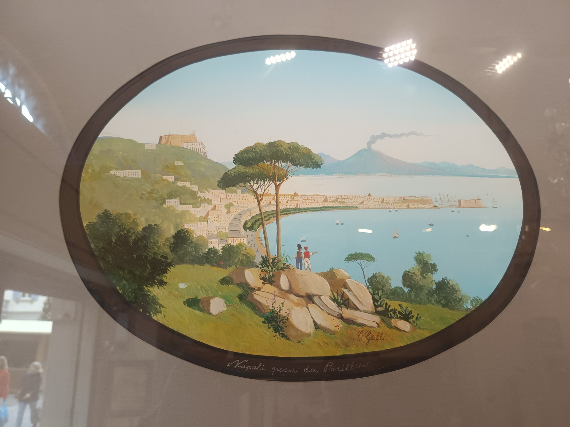 Coppia di guache per turisti da viaggio del grand tour," con raffigurazione di Napoli in una guache e l'isola di Ischia vista da Sorrento nell'altra. Misure: cm 54 x 70