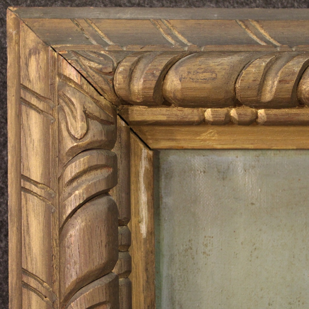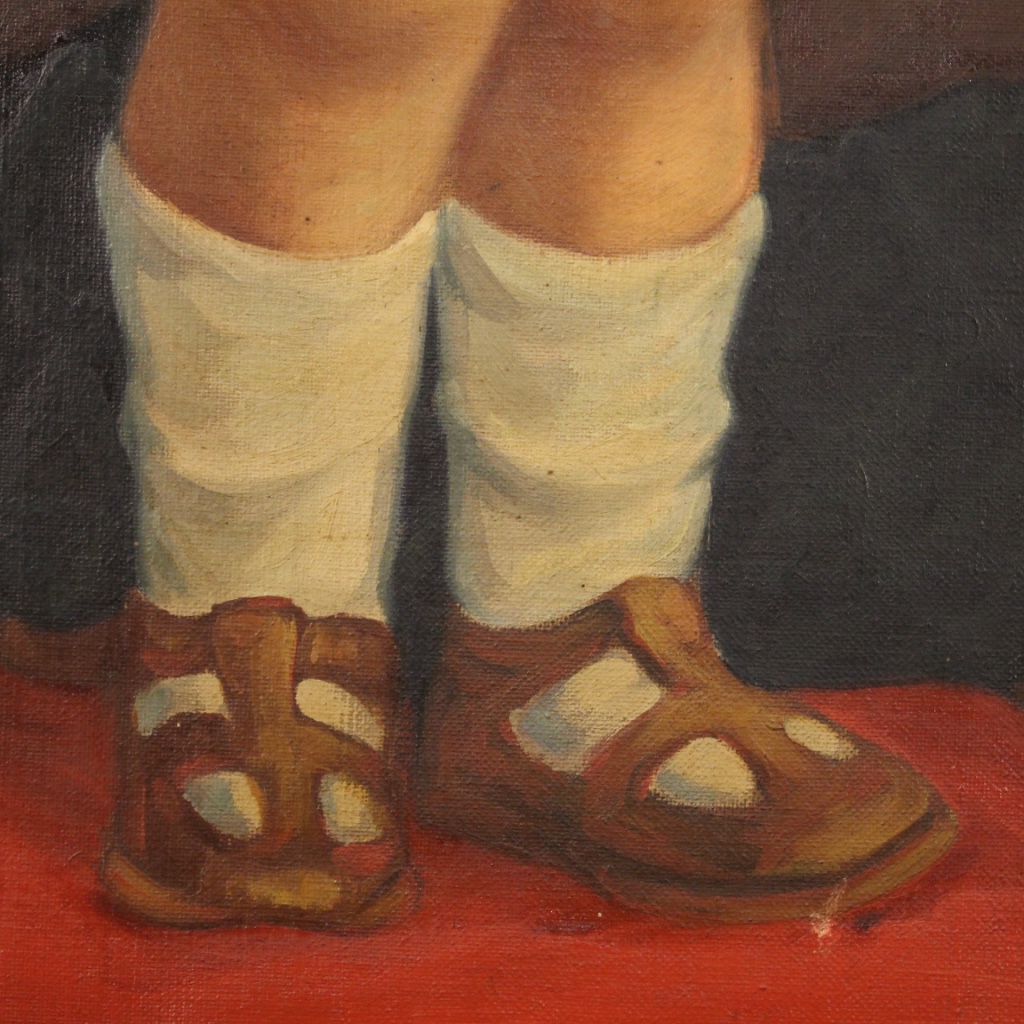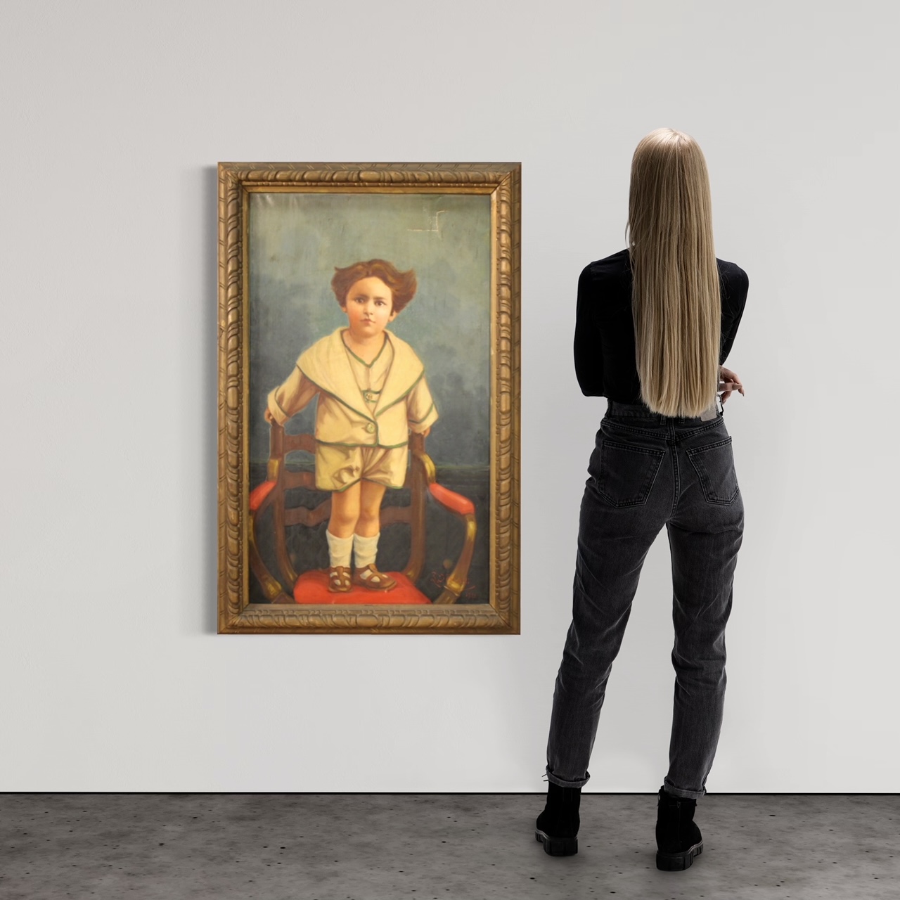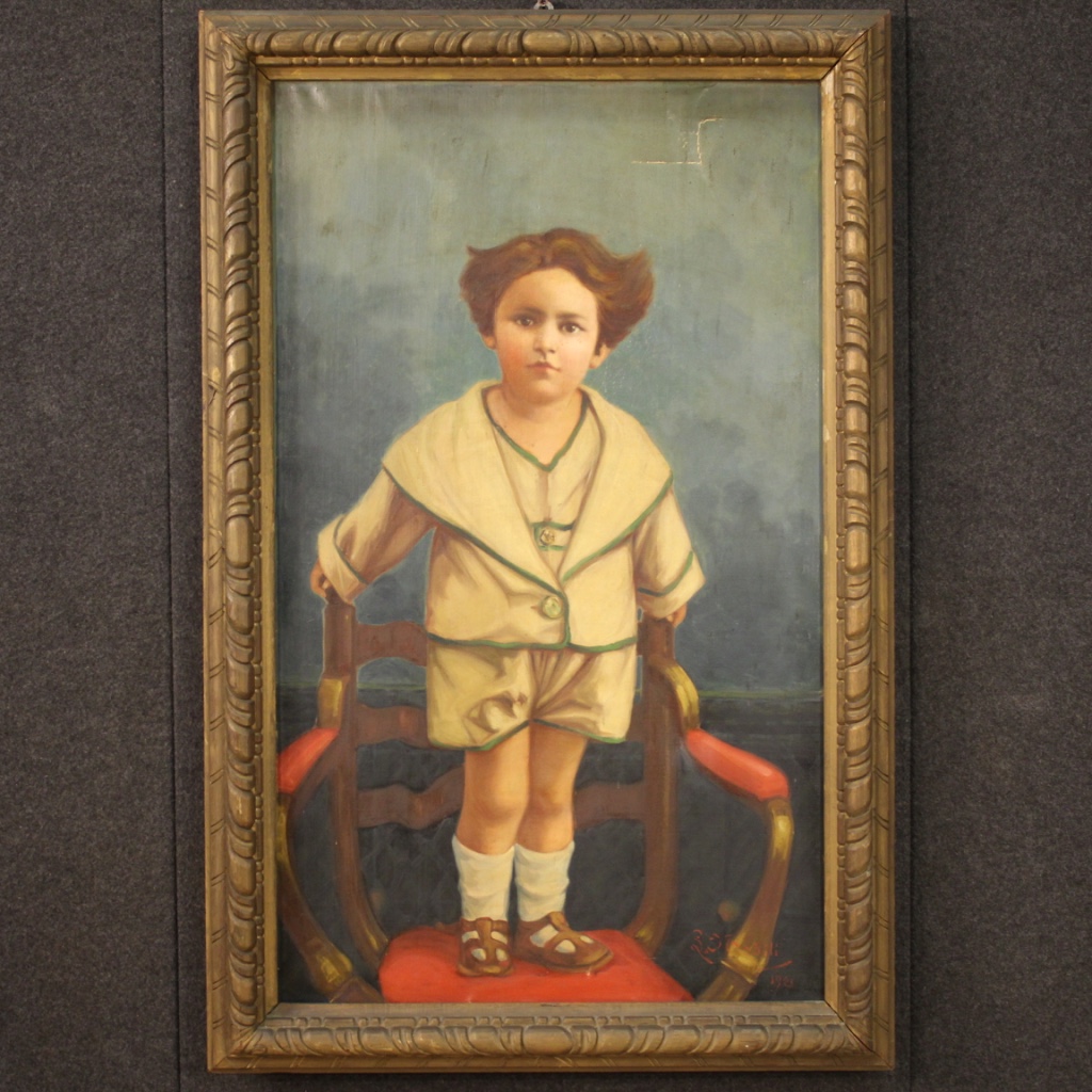 Dipinto italiano datato 1921. Opera olio su tela, in prima tela, raffigurante ritratto di bambino su poltrona di buona mano pittorica. Cornice lignea cesellata e dorata (tinta bronzo) di bella decorazione. Quadro che si sviluppa in verticale firmato e datato in basso a destra (vedi foto) firma in fase di studio. Opera di buona luminosità caratterizzata da tinte pastello, di piacevole arredamento per antiquari, arredatori e collezionisti di pittura italiana del XX secolo. Tela che presenta uno strappo in alto a destra (vedi foto) da pulire. Opera nel complesso in discreto stato conservativo, da restaurare. Luce Dipinto H 111 X L 67 cm