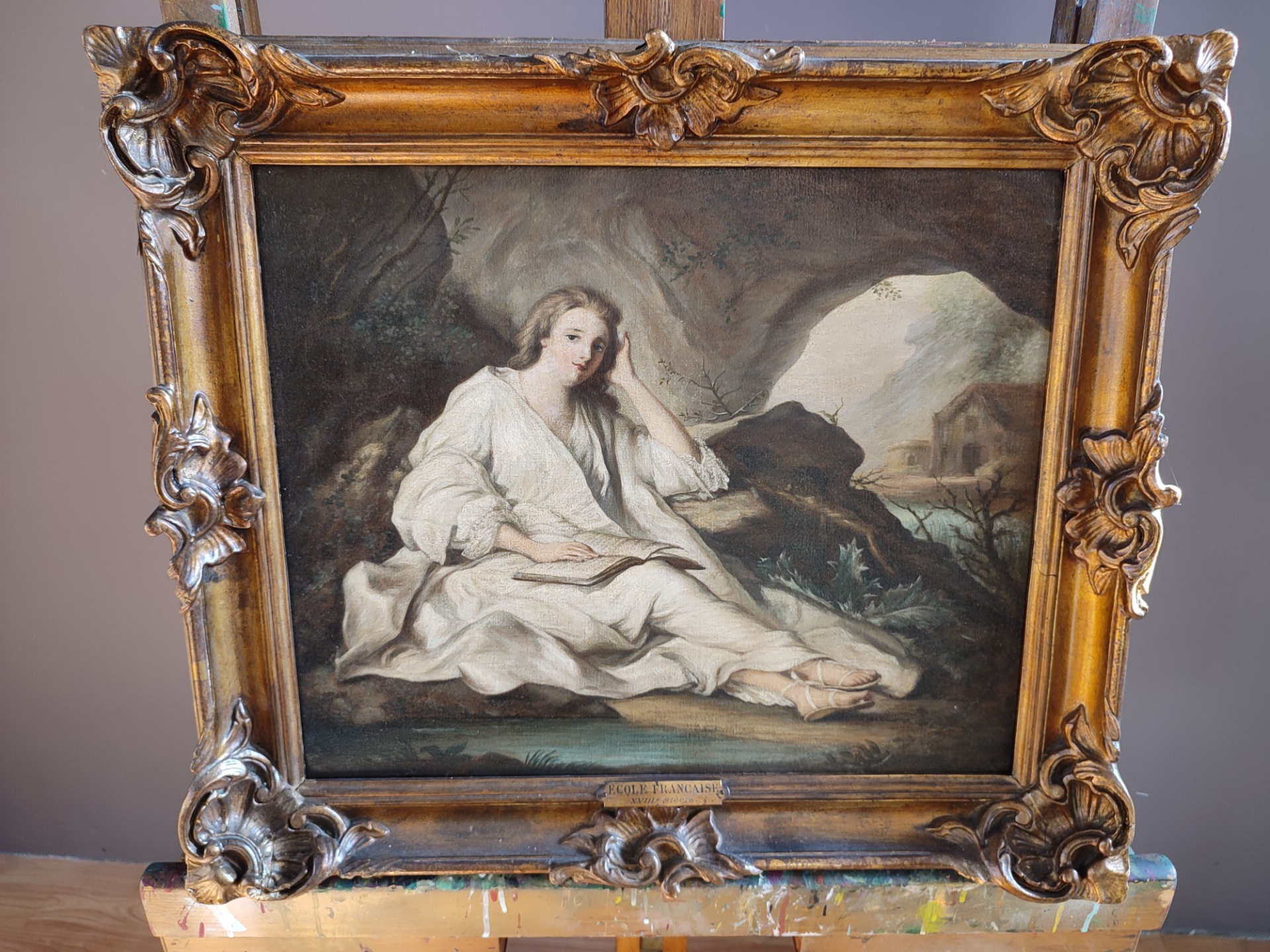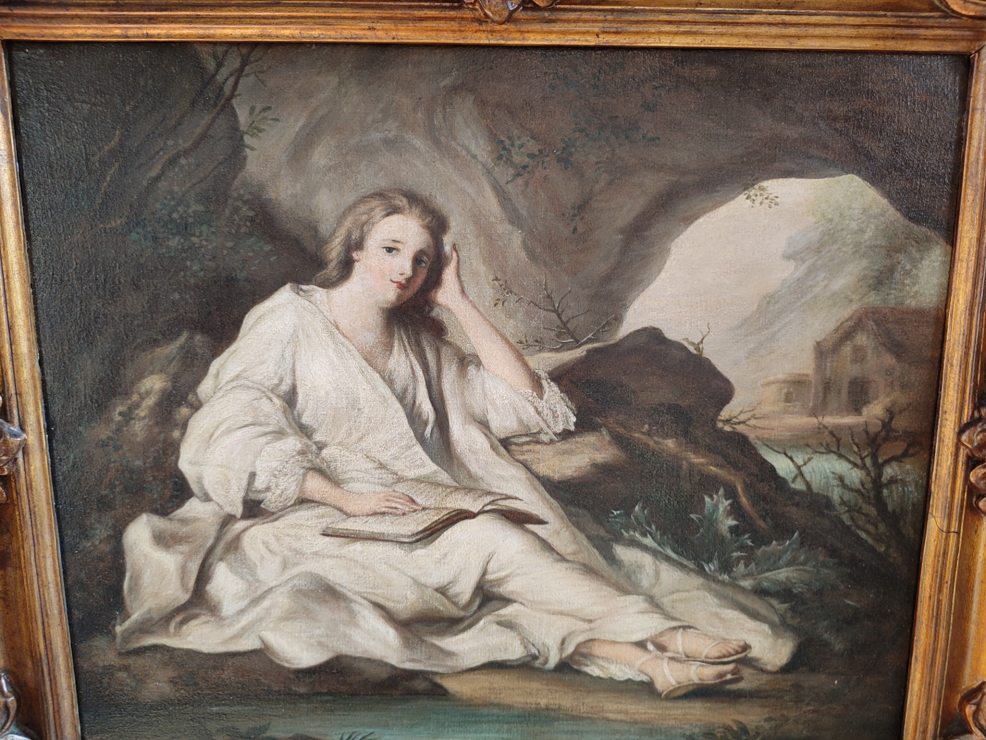 Dipinto raffigurante Maddalena Penitente epoca primi 900,con cornice coeva prima tela.Mis :59x50 Siamo a vostra disposizione per foto o domande.