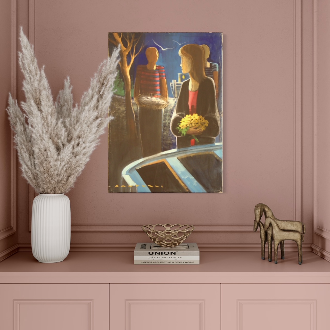 COD. 10812Dipinto italiano della seconda metà del XX secolo. Opera olio su tela, in prima tela, raffigurante figure nella notte con barche di buona mano pittorica. Quadro di grande piacevolezza in stile espressionista, caratterizzato da figure deformate e allungate nello spazio bidimensionale (vedi foto), per antiquari e arredatori. Opera firmata in basso a sinistra e sul retro della tela (vedi foto) riferibile al pittore Eliano Fantuzzi (1909-1989) mancante di autentica. Tela che presenta qualche piccolo segno del tempo (vedi foto) nel complesso in buono stato conservativo.