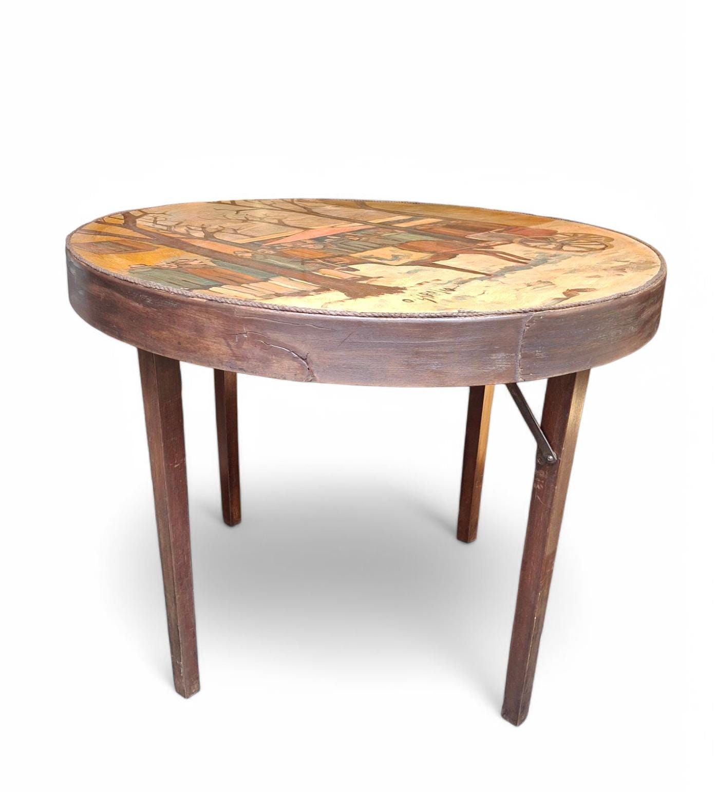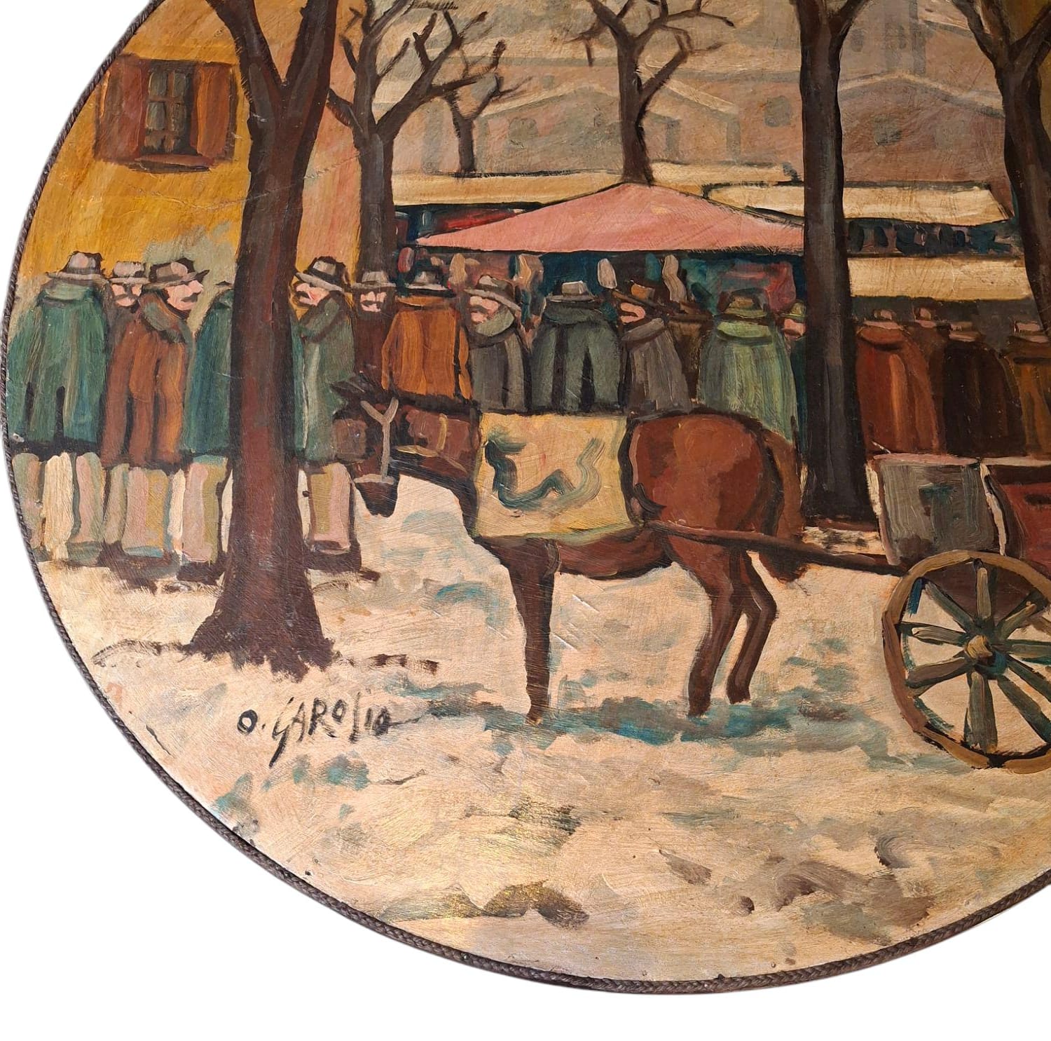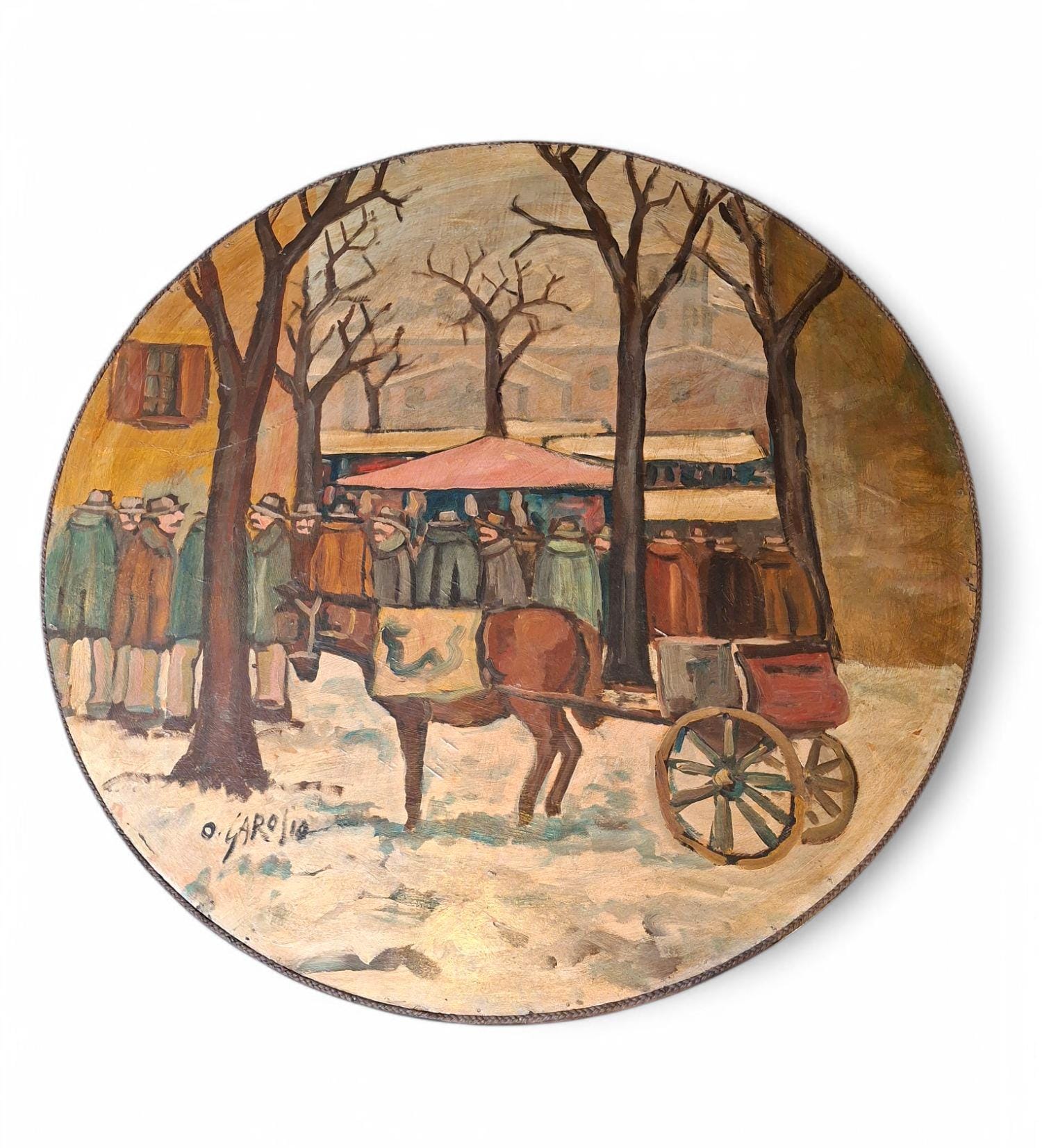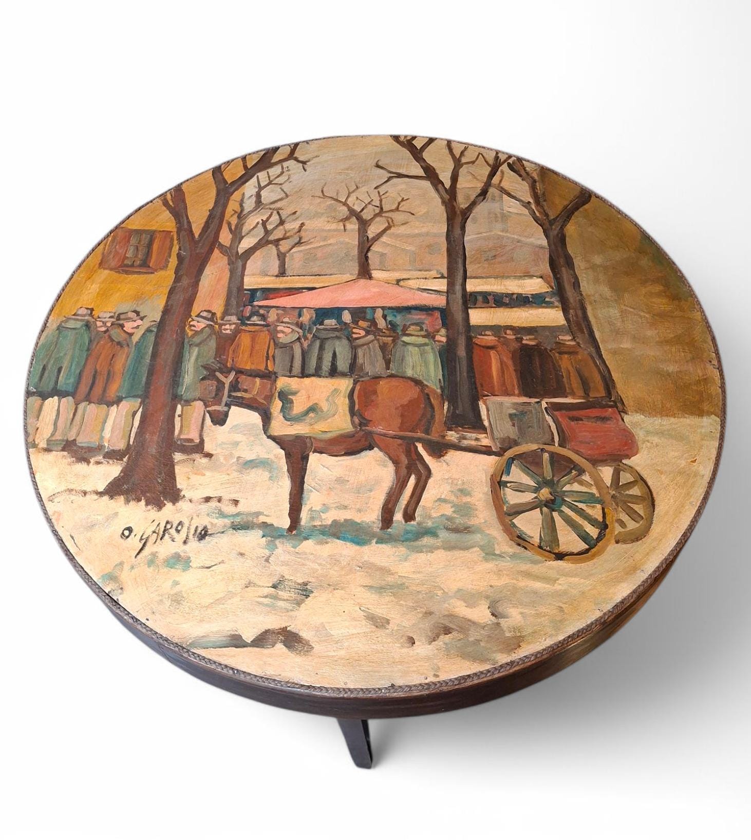 Tavolino dipinto da Ottorino Garosio (1904-1980), Scena di mercato con figure e carro con cavallo, il piano è dipinto direttamente sul tavolo in legno, il tavolo ha le quattro gambe pieghevoli, diametro 90 cm, altezza 71 cm.