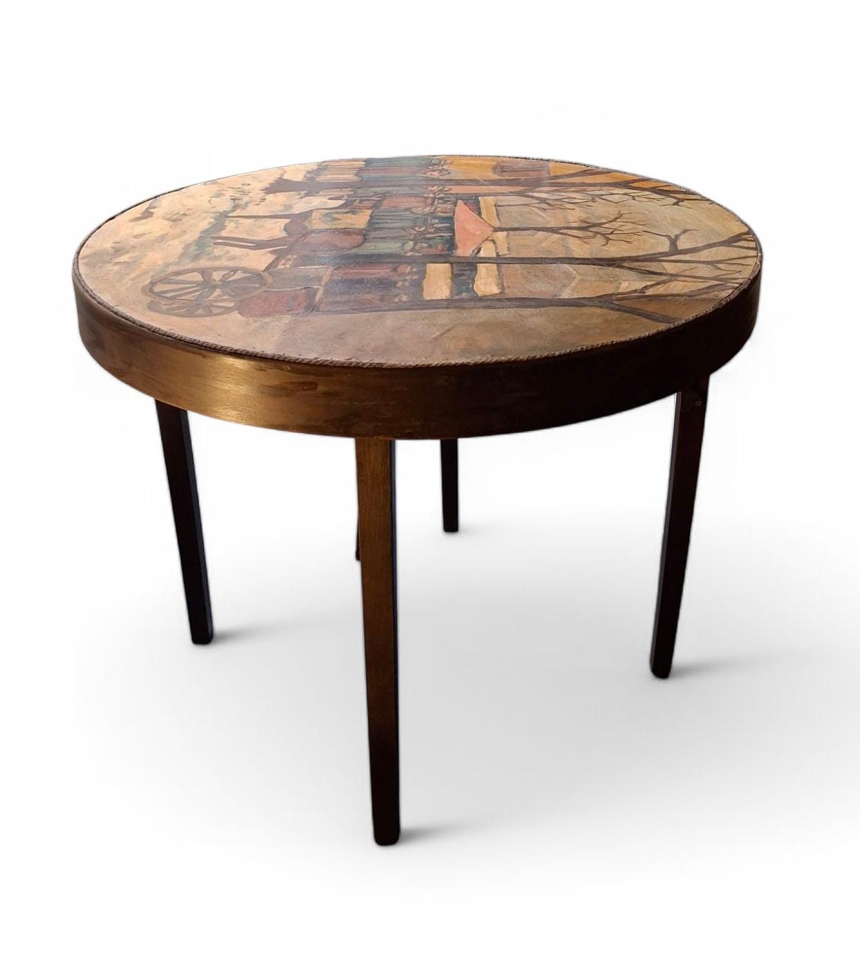 Tavolino dipinto da Ottorino Garosio (1904-1980), Scena di mercato con figure e carro con cavallo, il piano è dipinto direttamente sul tavolo in legno, il tavolo ha le quattro gambe pieghevoli, diametro 90 cm, altezza 71 cm. http://www.oldpaintingsonline.com