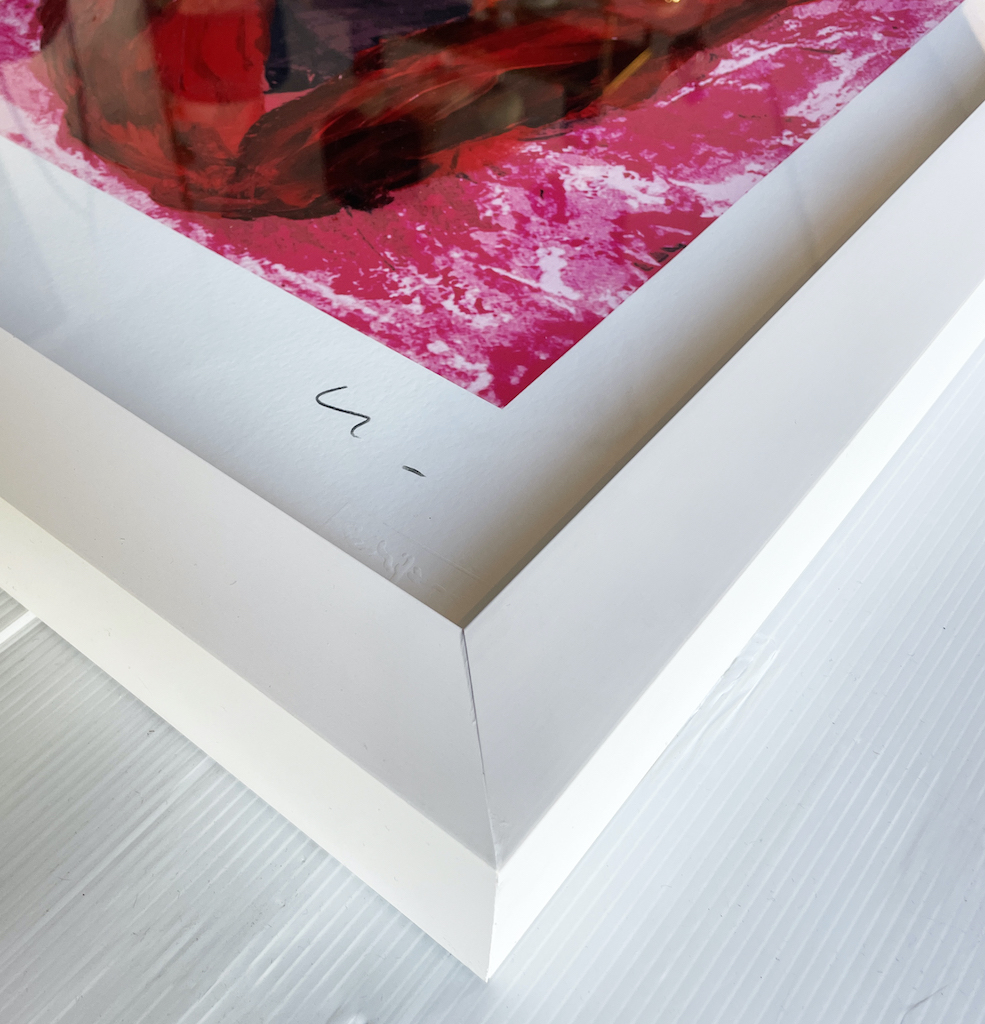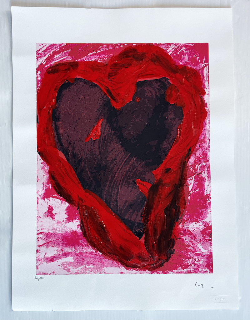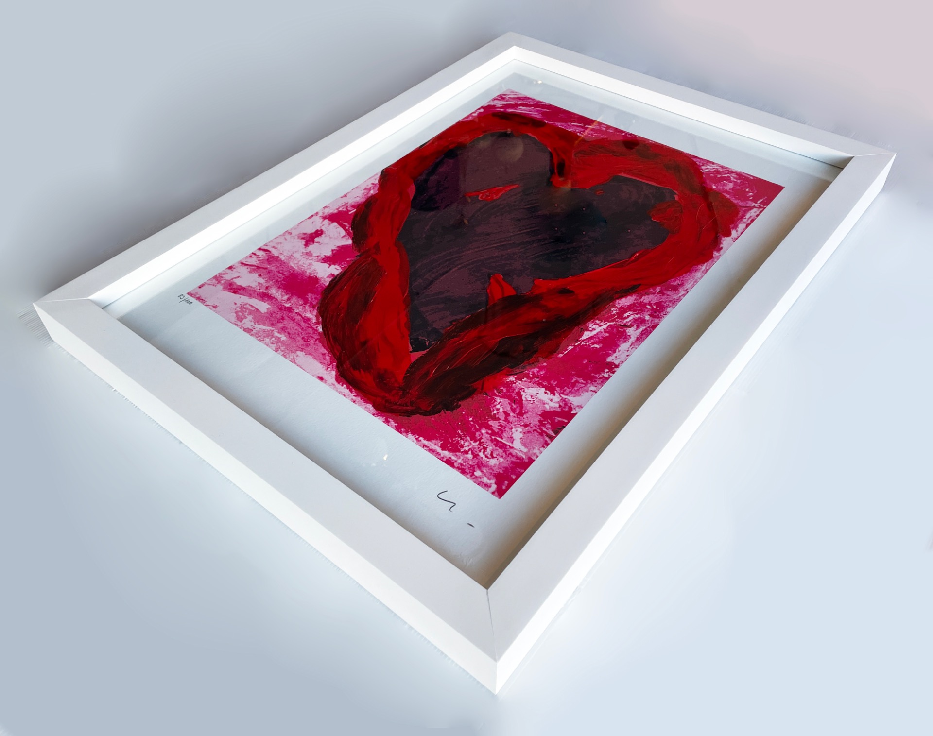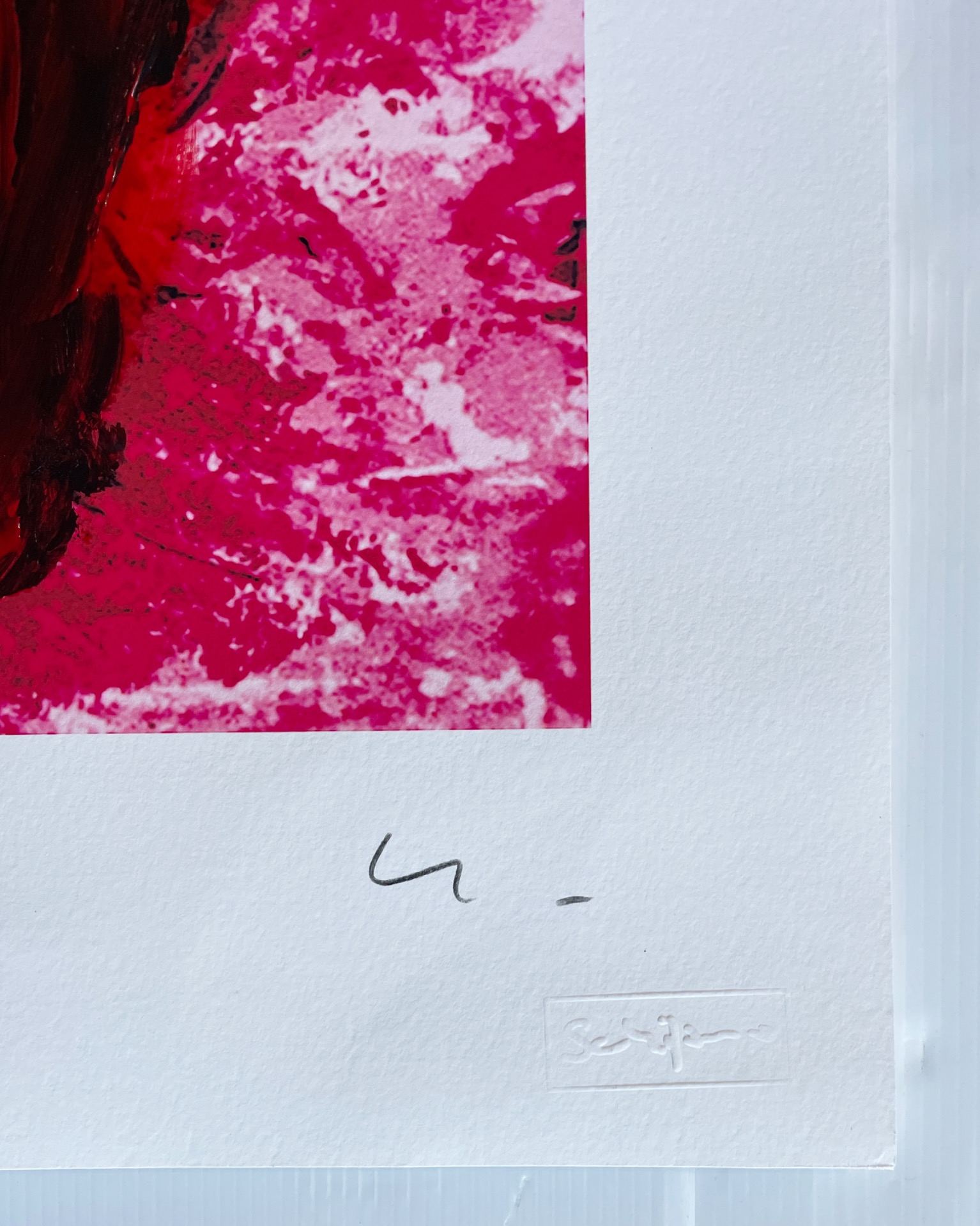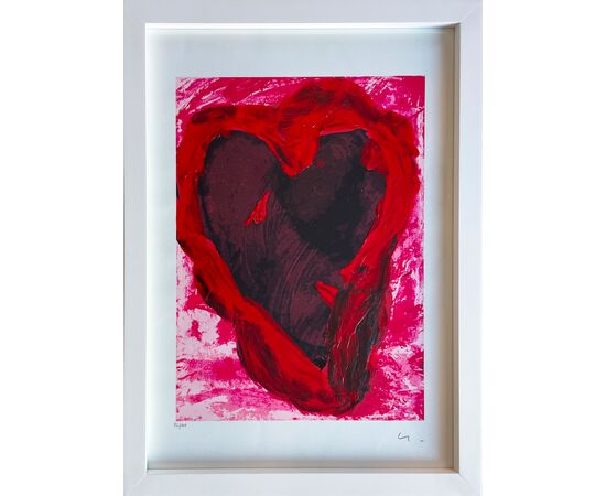 Serigrafia materica "Senza titolo (CUORE)" di Mario Schifano (1934-1998) Firma e tiratura in basso: 83/100 Tecnica: Serigrafia materica Dimensioni senza cornice: 70 x 50 cm Dimensioni con cornice: 76 × 55 cm Mario Schifano, artista dall'animo ribelle e graffiante, è oggi considerato uno dei più prolifici pittori del secondo dopoguerra. Attira fin da subito la critica realizzando quadri monocromi che offrono l'idea di uno schermo fotografico che in seguito accoglierà numeri, lettere, segnali stradali, marchi della Esso e della Coca Cola. Ha vissuto a New York dove ha frequentato Frank O'Hara, Jasper Johns e Andy Warhol.