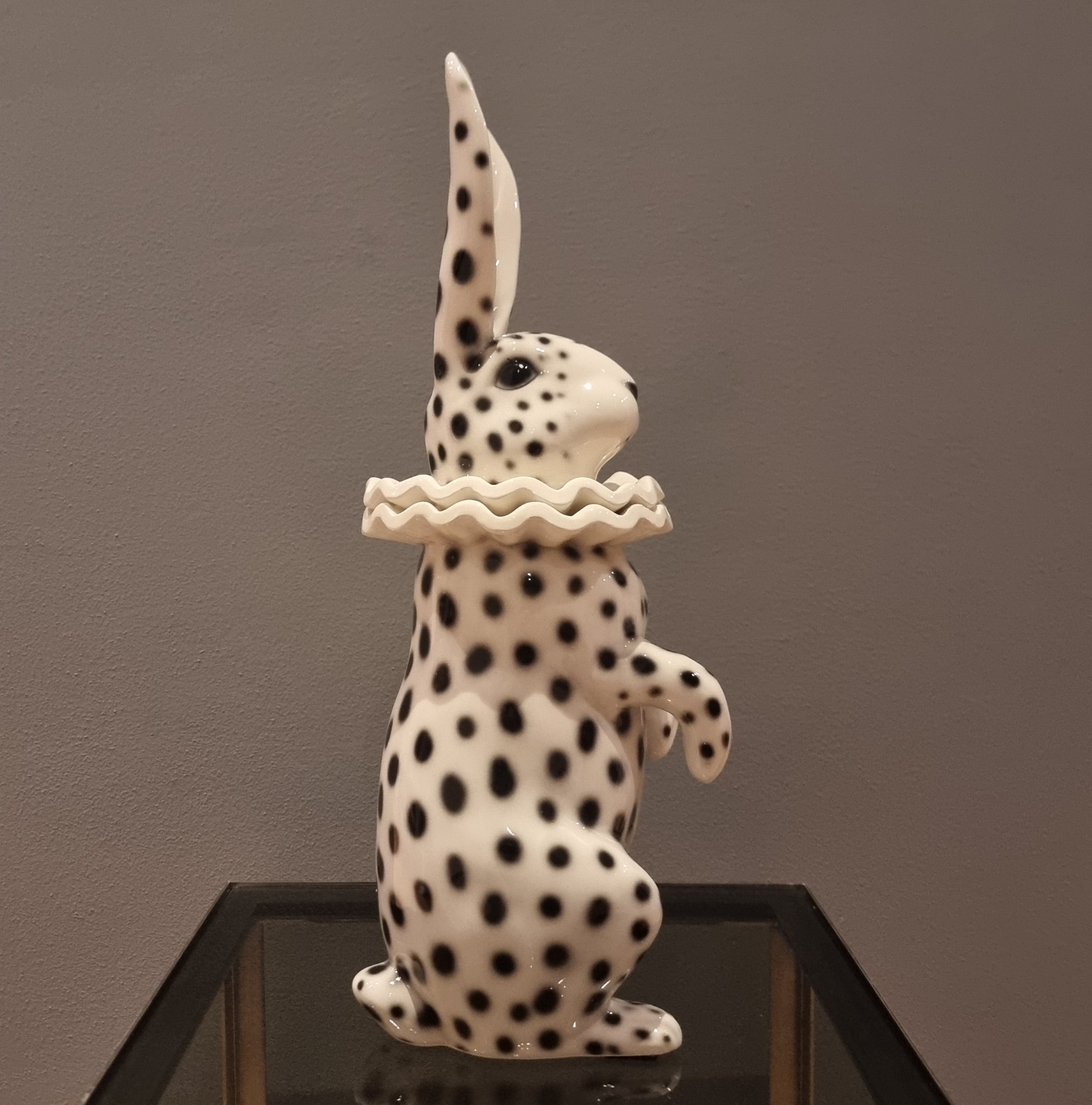 Coniglio in ceramica dipinta con vestito di Pierrot: Un'eleganza giocosa e raffinata