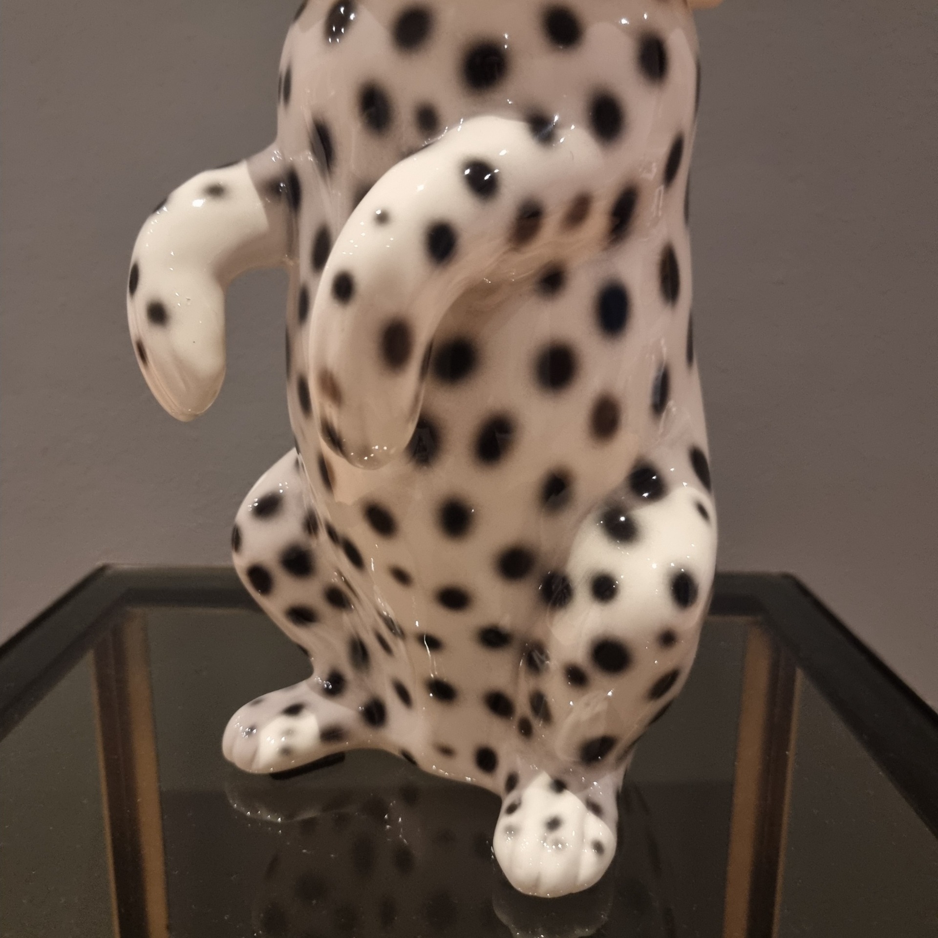 Realizzato con ceramica di alta qualità e dipinto a mano con estrema cura, questo coniglio incarna il fascino delle creazioni uniche e irripetibili. La finitura brillante e la precisione nei dettagli del vestito da Pierrot esaltano la bellezza dell'oggetto, rendendolo un vero pezzo da collezione. In eccellenti condizioni generali, misura h50 x 20x20 cm, dimensioni perfette per impreziosire una mensola, un mobile o una vetrina.