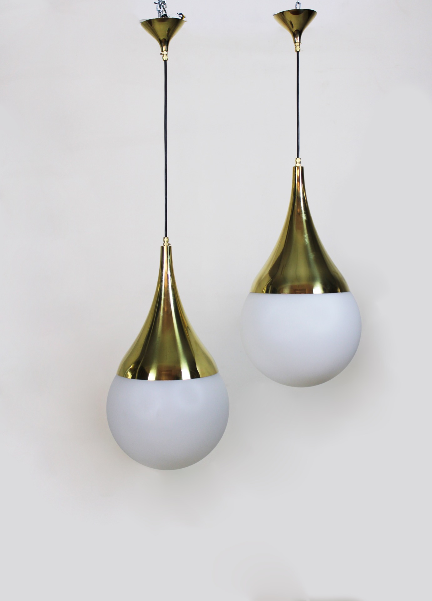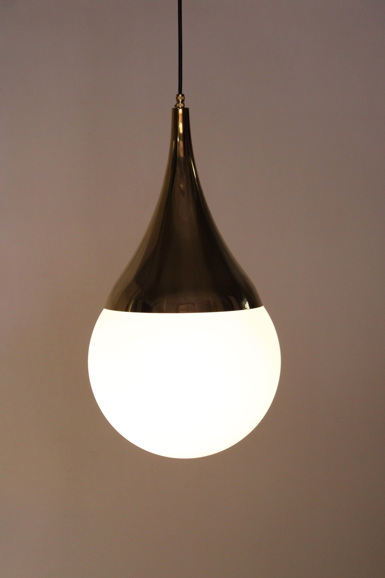 Elegante sospensione in ottone e opalina bianca a sfera.