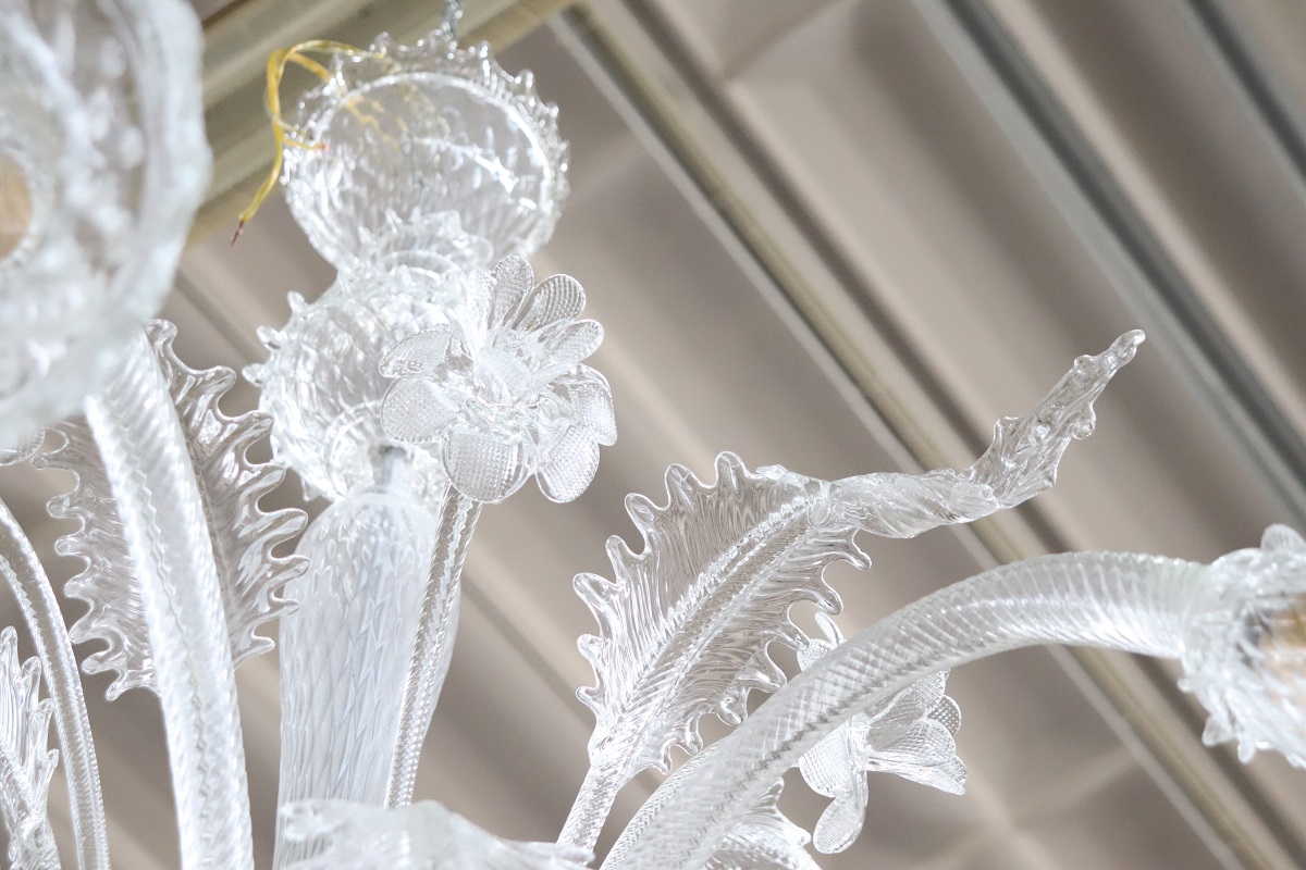 Il lampadario è caratterizzato da un vetro trasparente che incarna leggerezza ed eleganza, ornato da intricate decorazioni floreali e da un delicato fogliame. Piccoli fiori accentuano graziosamente i bracci del lampadario e, quando viene illuminato, la luce mette in risalto ogni elemento decorativo, creando un’atmosfera accattivante.