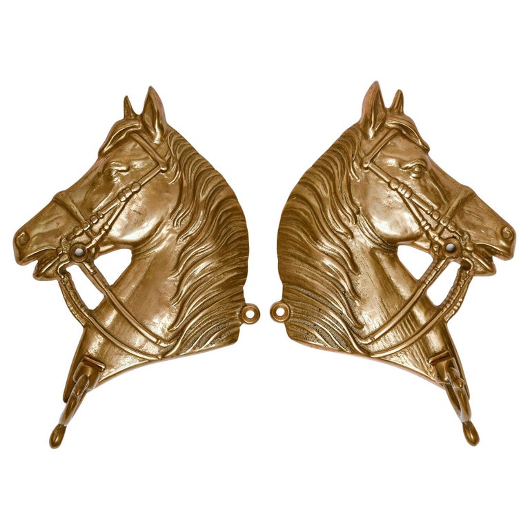 Coppia di attaccapanni in bronzo con teste di cavalli: da applicare a parete oppure su un piano in legno. Ognuno ha un robusto gancio per appendere quel che si vuole.