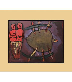 COD 9008 Dipinto italiano della seconda metà del XX secolo. Opera ad olio su tela in stile antico raffigurante paesaggio marino con pescatori e barche. Quadro di bella misura e piacevole arredamento con cornice lignea moderna laccata e dorata. Dipinto di ottima profondità con patina antichizzata...
