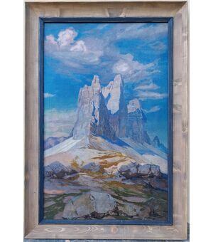 Definisco di bella luce e plasicita il dipinto raffigurante le tre cime di alavaredo nelle Dolomiti bellunesi. Opera realizzata negli anni 30 - 50 da ignoto artista, montata su un telaio recente. Veduta realistica con bella impostazione. Olio su tela 115 x 73 con cornice 134 x 92 cm