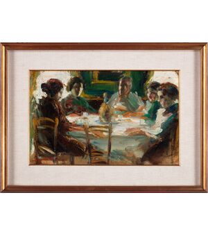 Angelo Landi (Salò 1879-1944), Interno con figure, olio su cartoncino, firmata in basso a destra, misure 29.5x47 cm, con cornice 45x62 cm. http://www.oldpaintingsonline.com